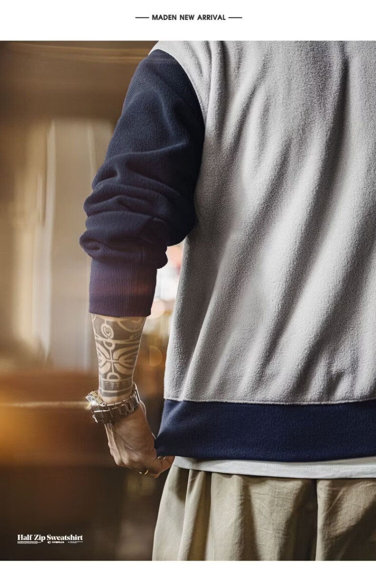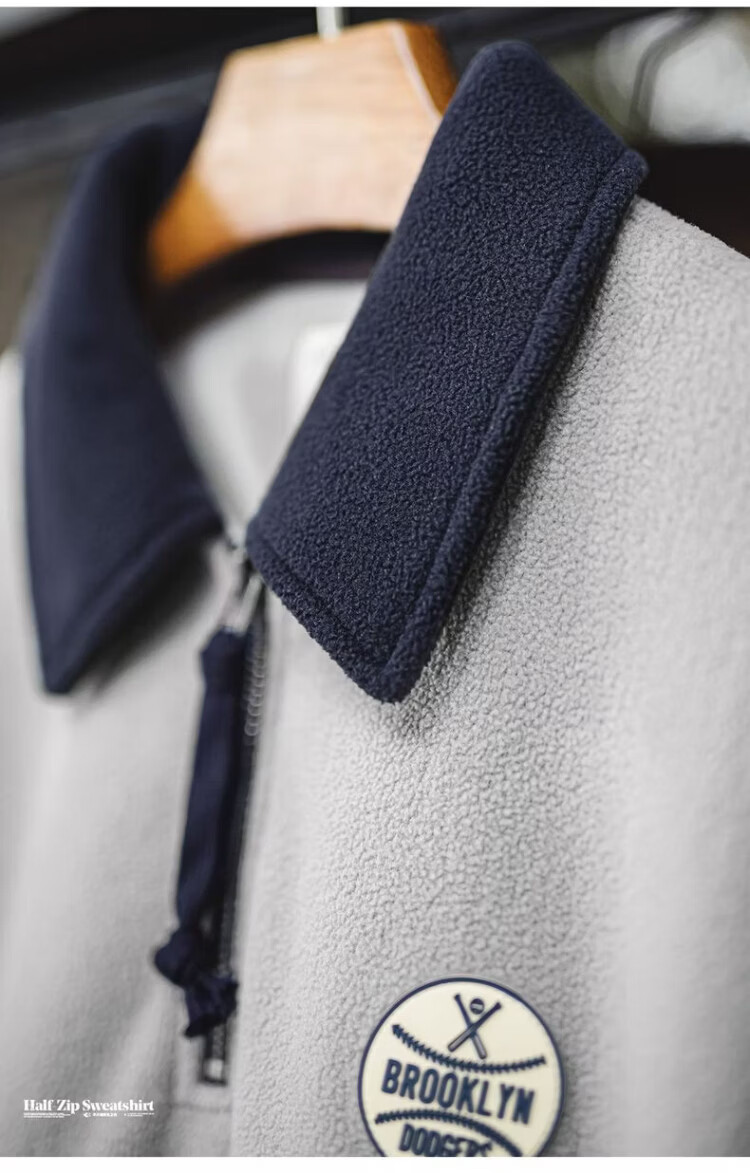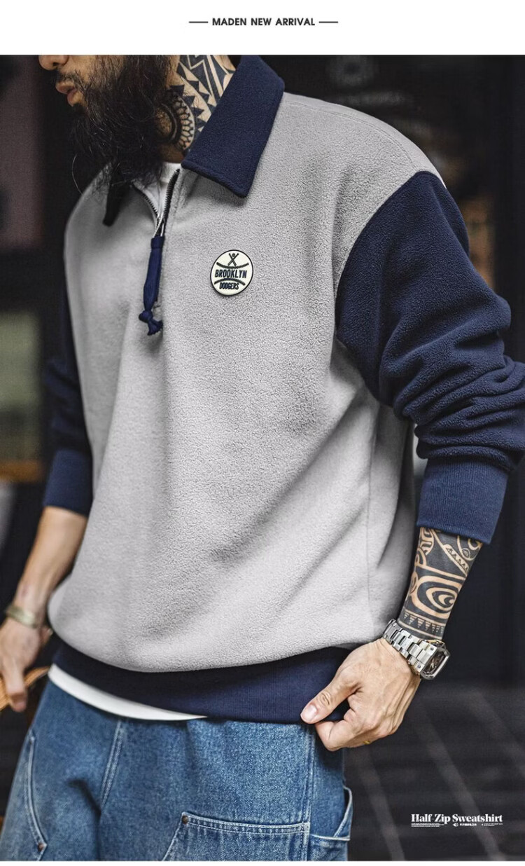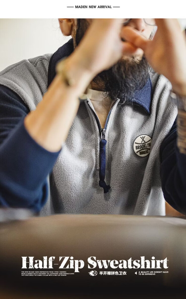 Madden workwear Sudadera de medio cárdigan de forro polar americano estilo universitario cuello polo jersey de color contrastante chaqueta cálida para hombre sudadera de forro polar gris claro de otoño/sudadera para hombre/sin capucha/ropa interior de invierno/ropa para hombres L