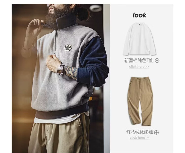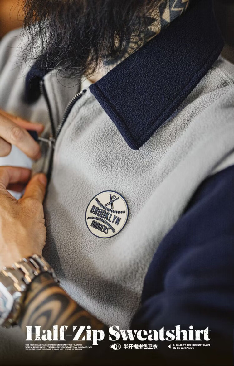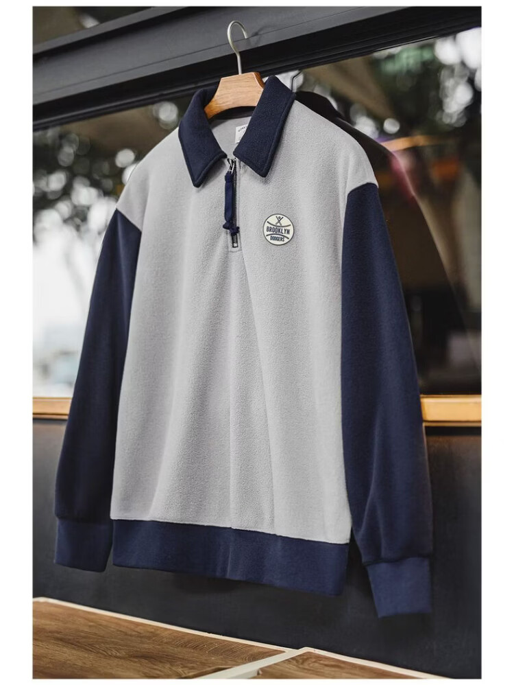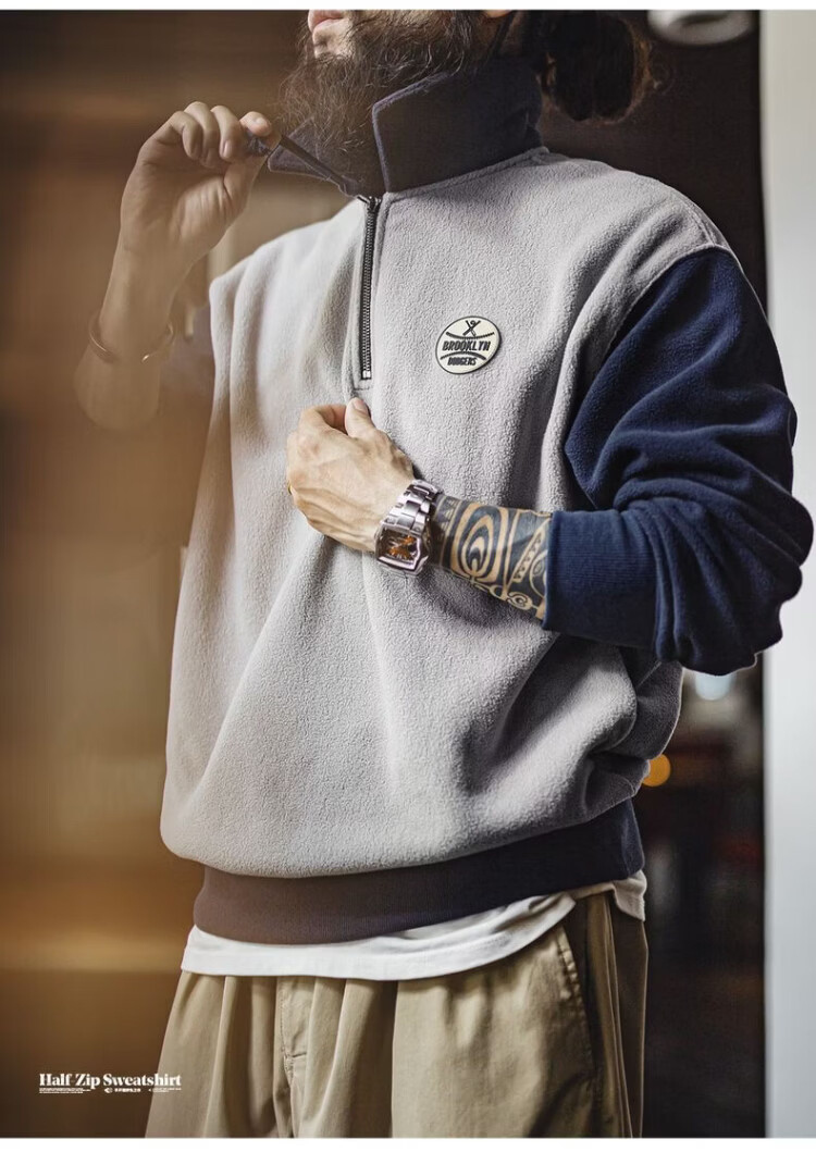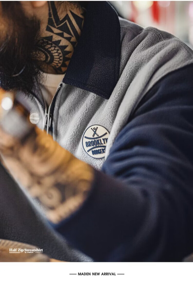 Madden workwear Sudadera de medio cárdigan de forro polar americano estilo universitario cuello polo jersey de color contrastante chaqueta cálida para hombre sudadera de forro polar gris claro de otoño/sudadera para hombre/sin capucha/ropa interior de invierno/ropa para hombres L