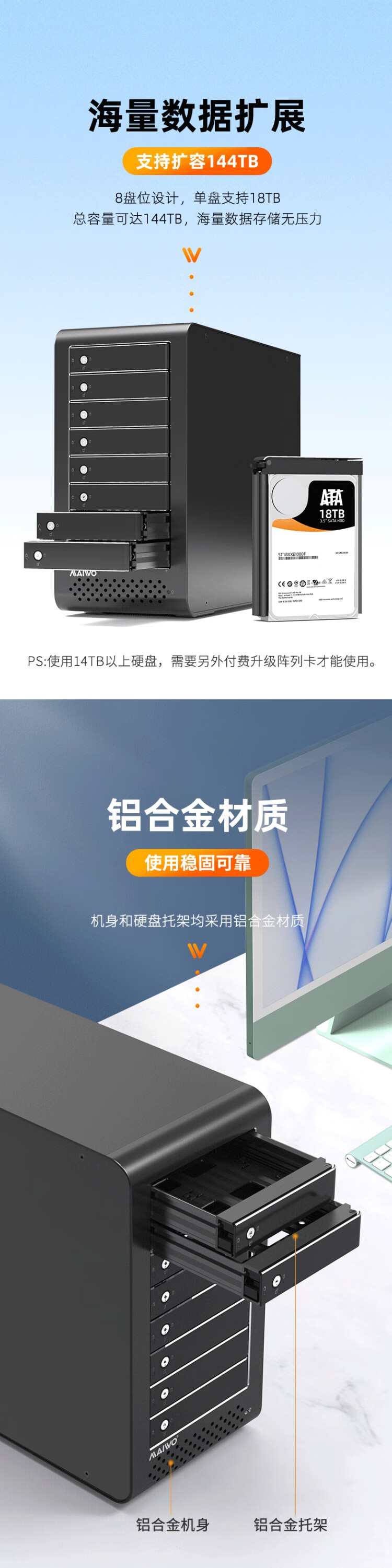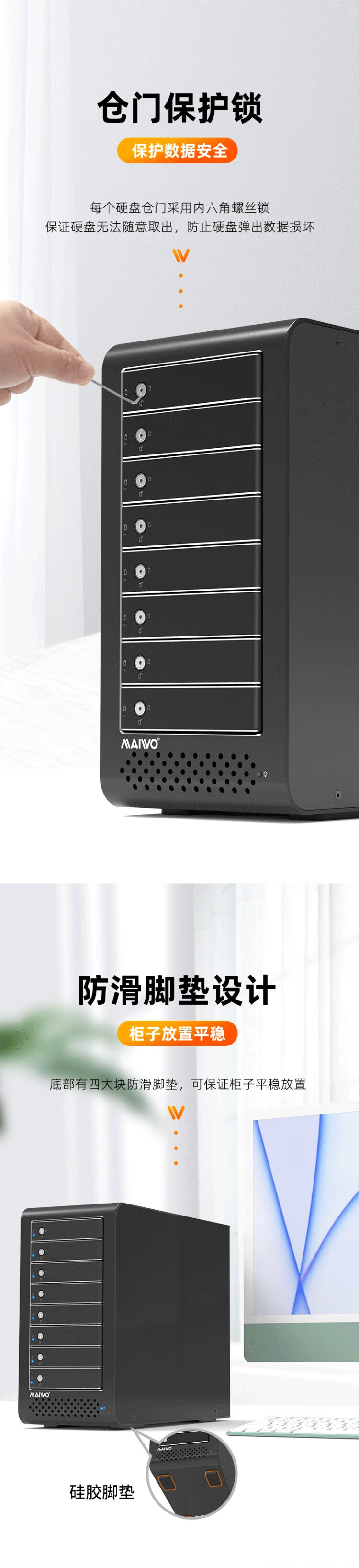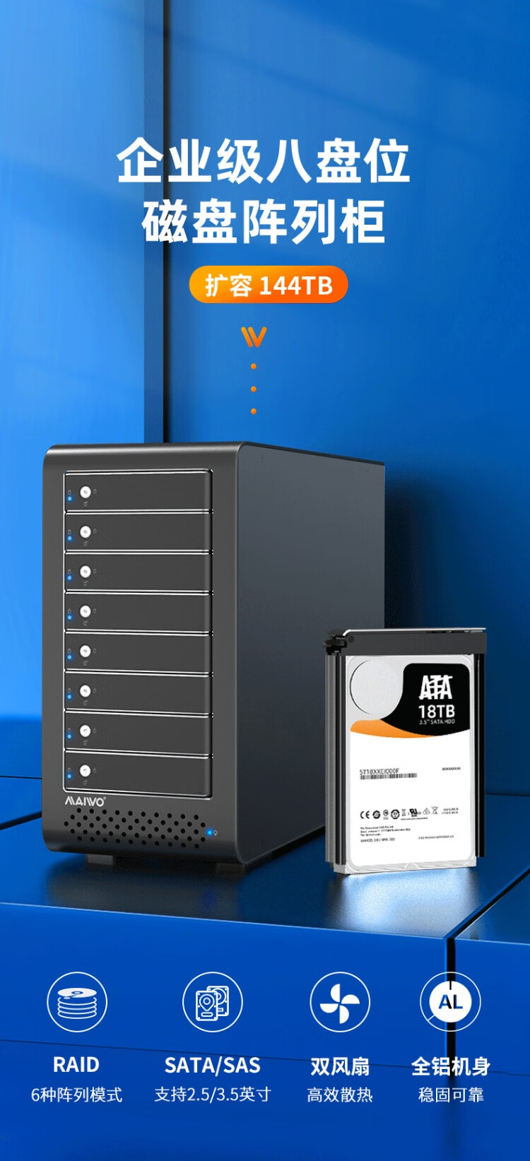 麦沃(MAIWO) K8FSAS 磁盘阵列柜 八盘位硬盘柜 支持SATA/SAS硬盘通用 4K高清视频数据硬盘盒 全铝黑