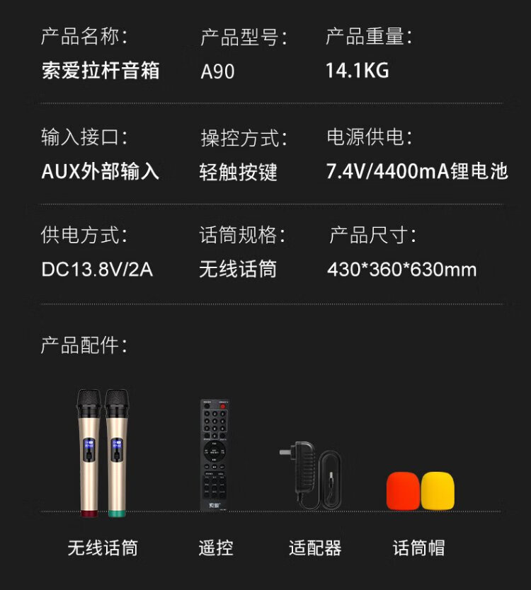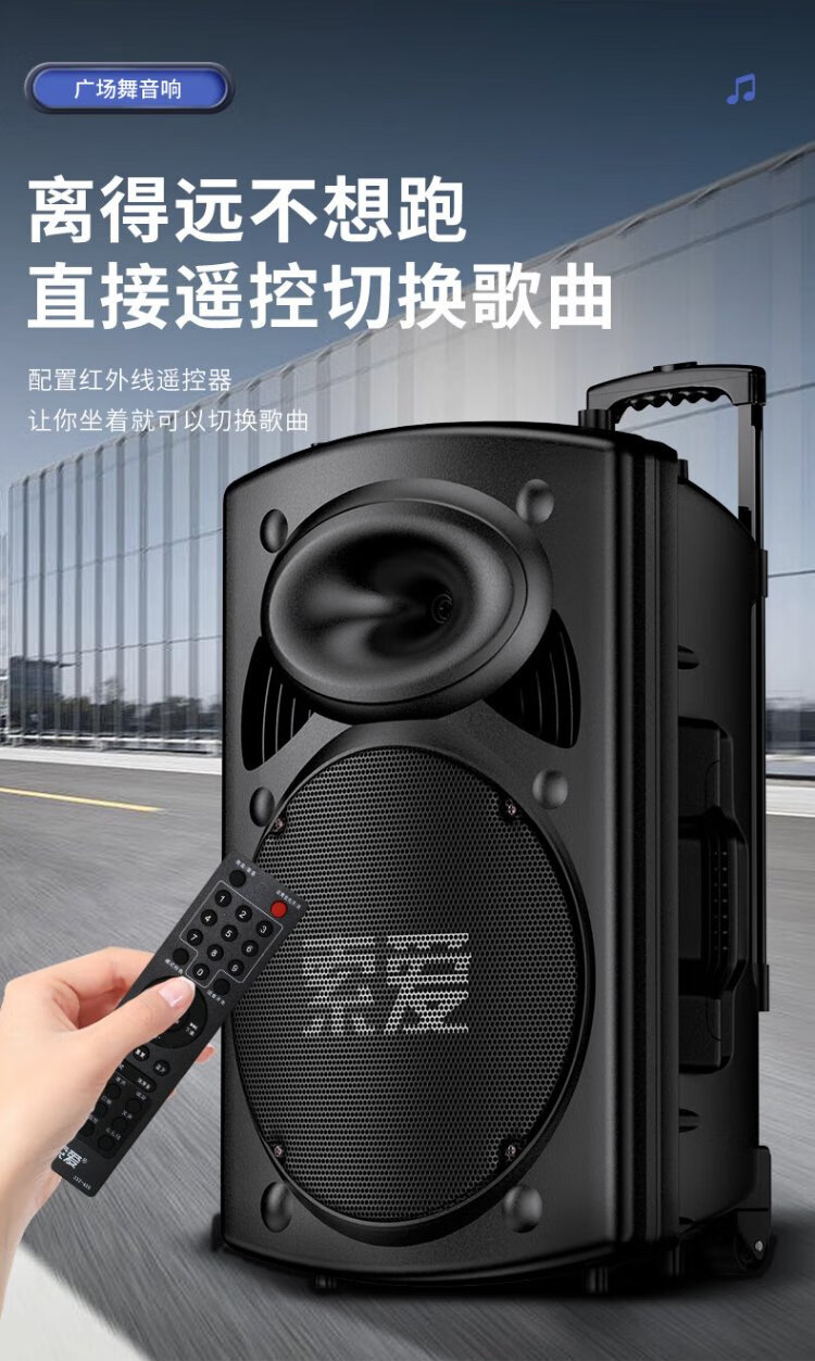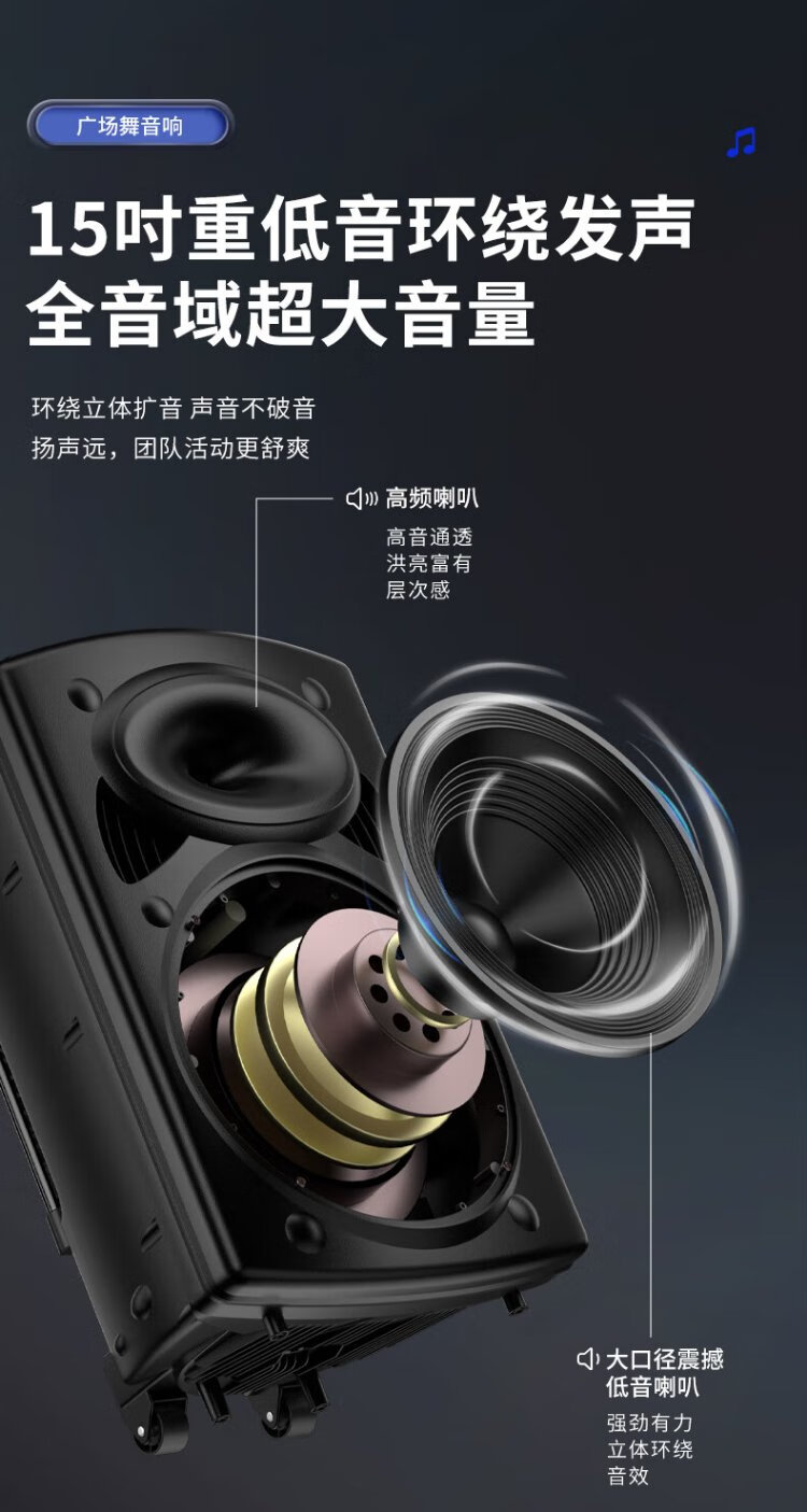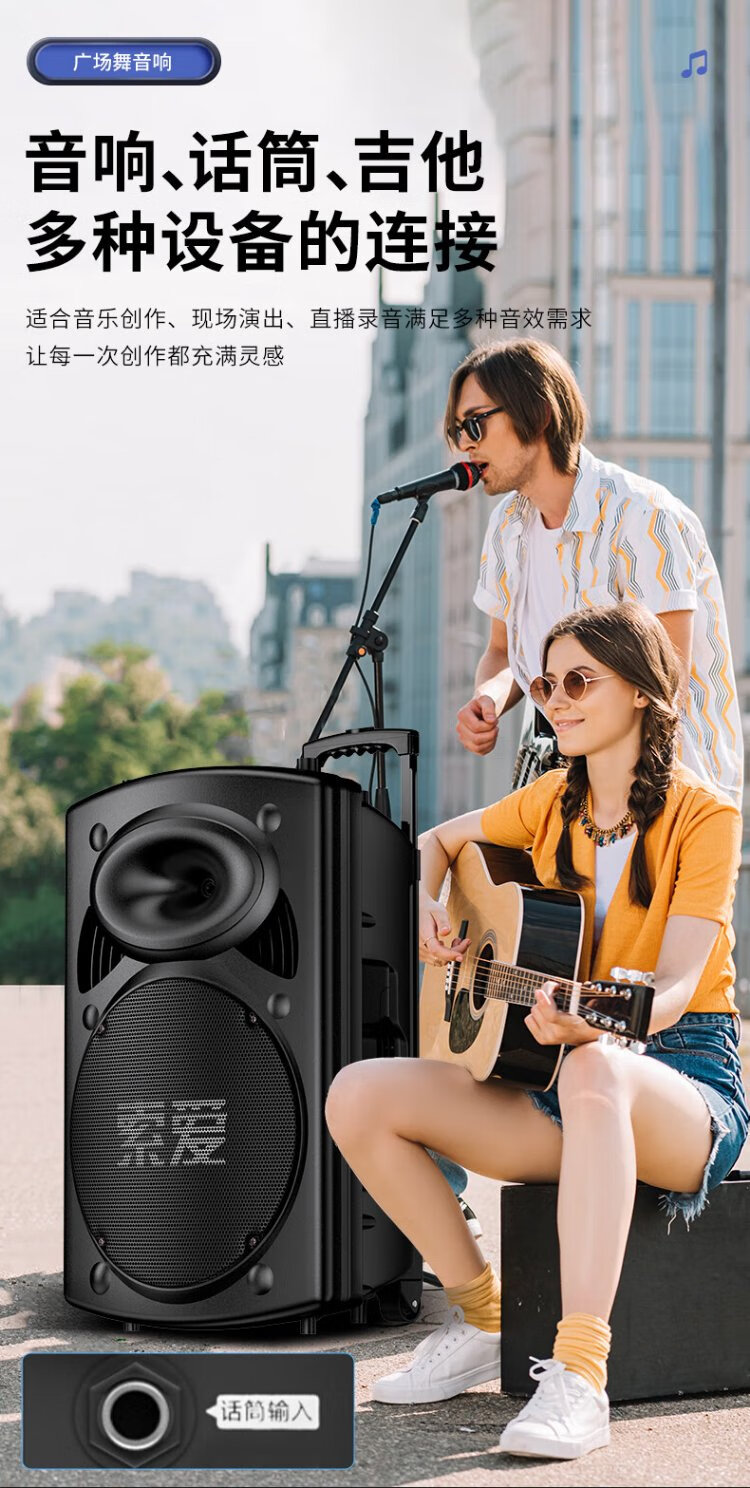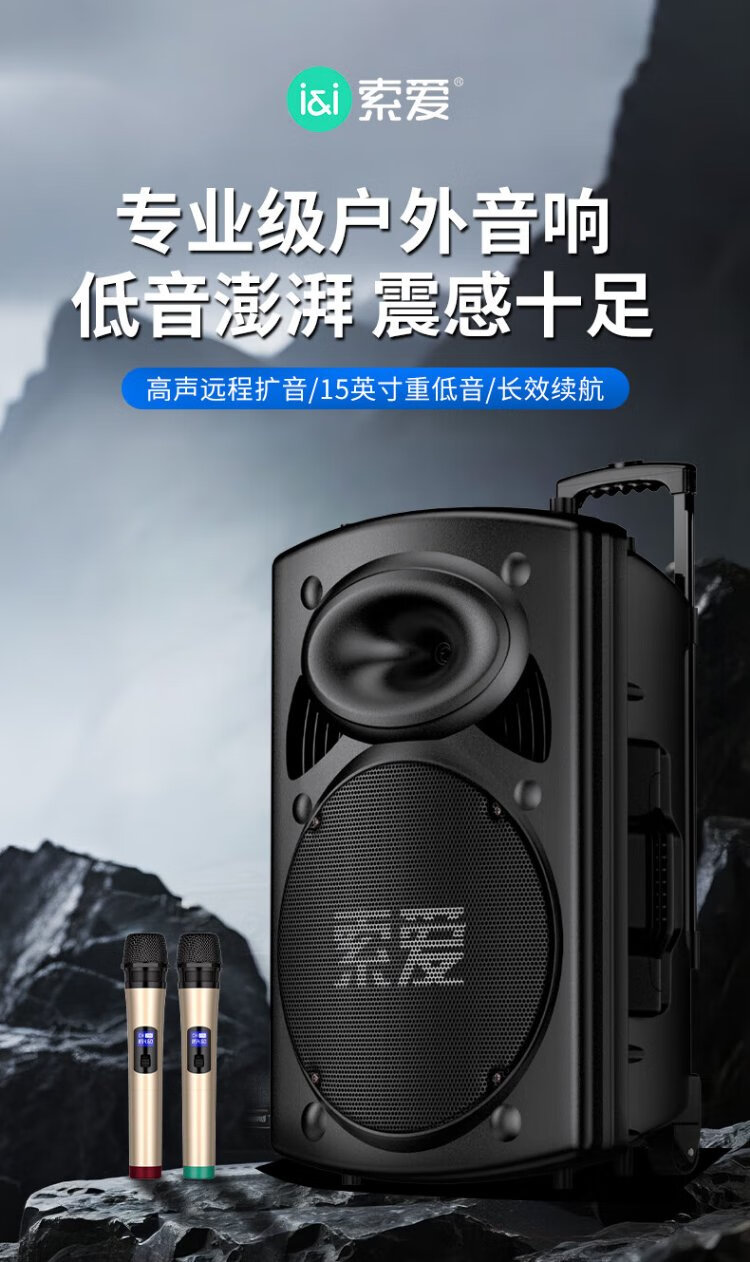 索爱(soaiy)15吋广场舞音响大功率便携式户外重低音蓝牙k歌大音量移动拉杆音箱室外演出设备双话筒A90