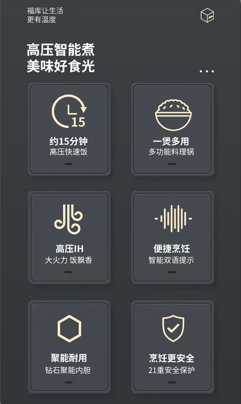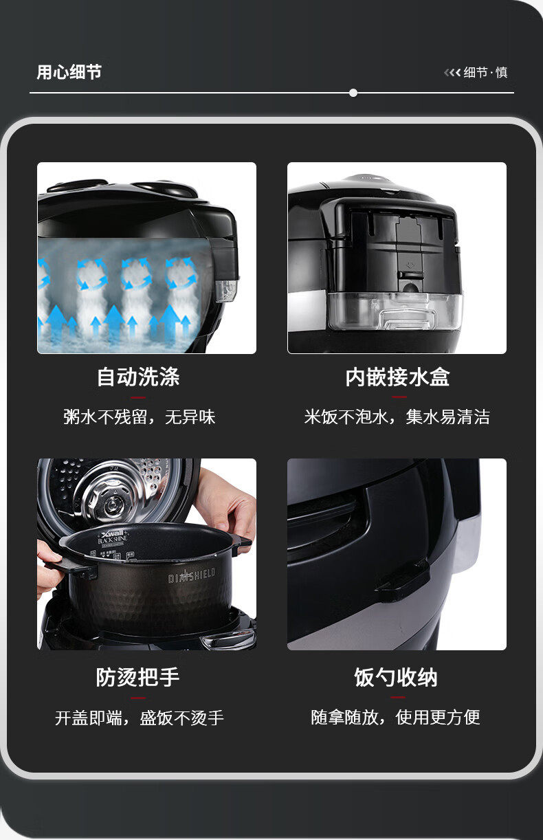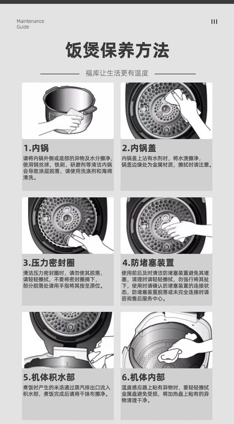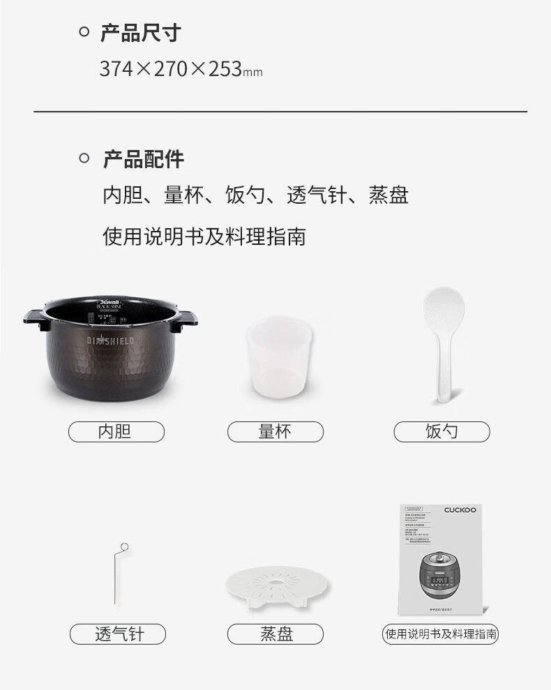 Package list Electric pressure rice cooker*1, inner pot*1, measuring cup (for 1 person)*1, rice spoon*1, breathable needle*1, steaming tray*1, instruction manual and cooking guide