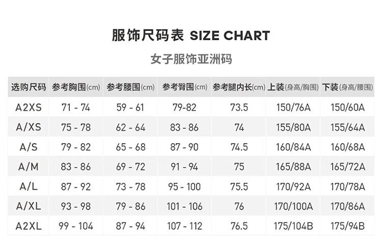China (cm) 160-165/84-86 165-170 / 88-90 167-172 / 92-96 168-173 / 98-102 170-176 / 106-110