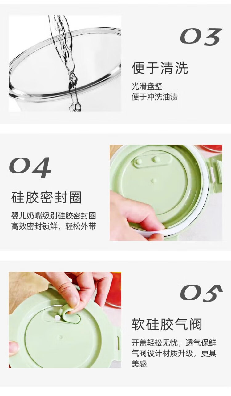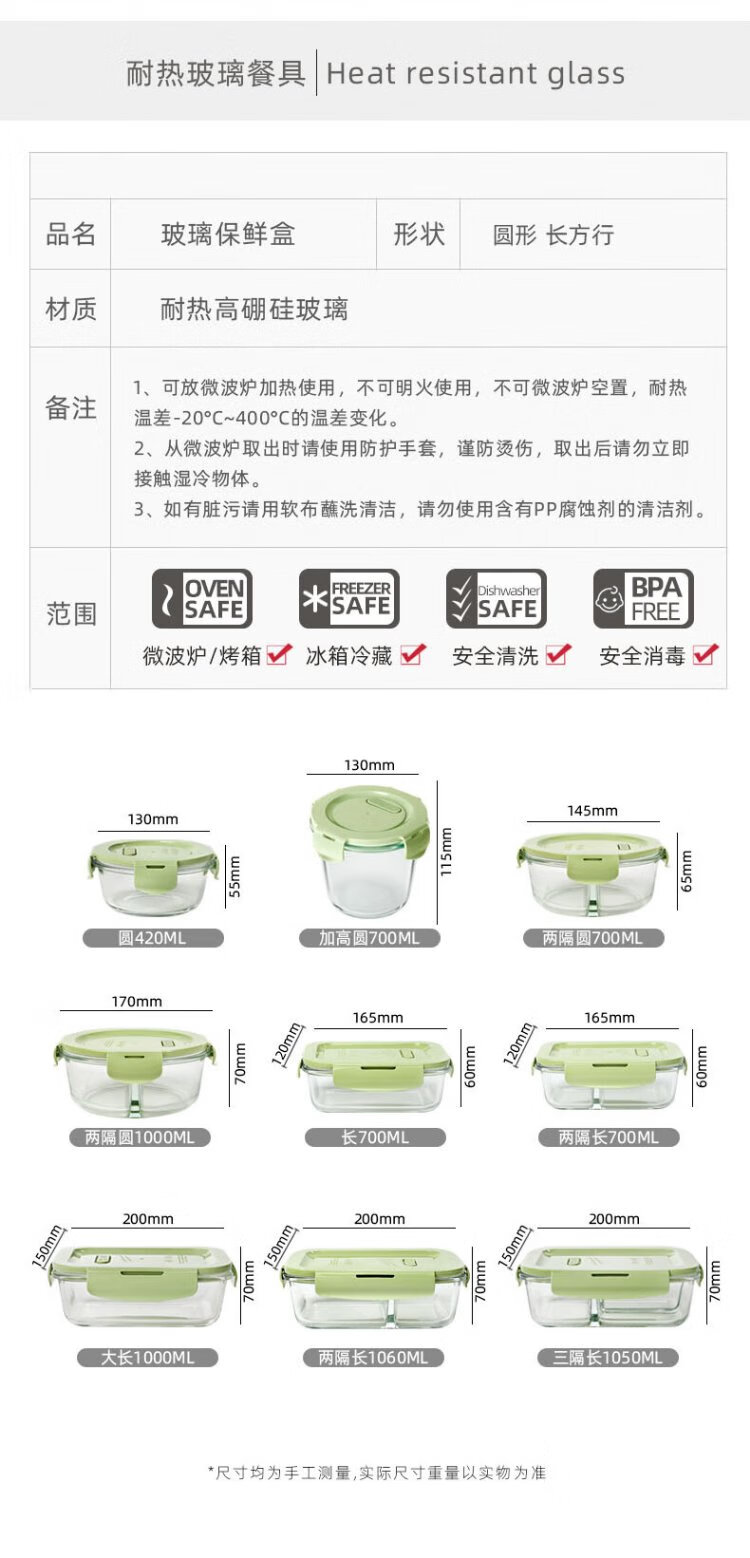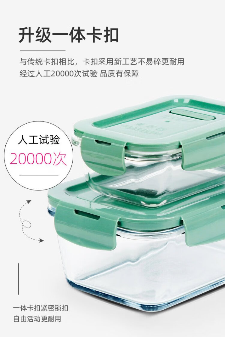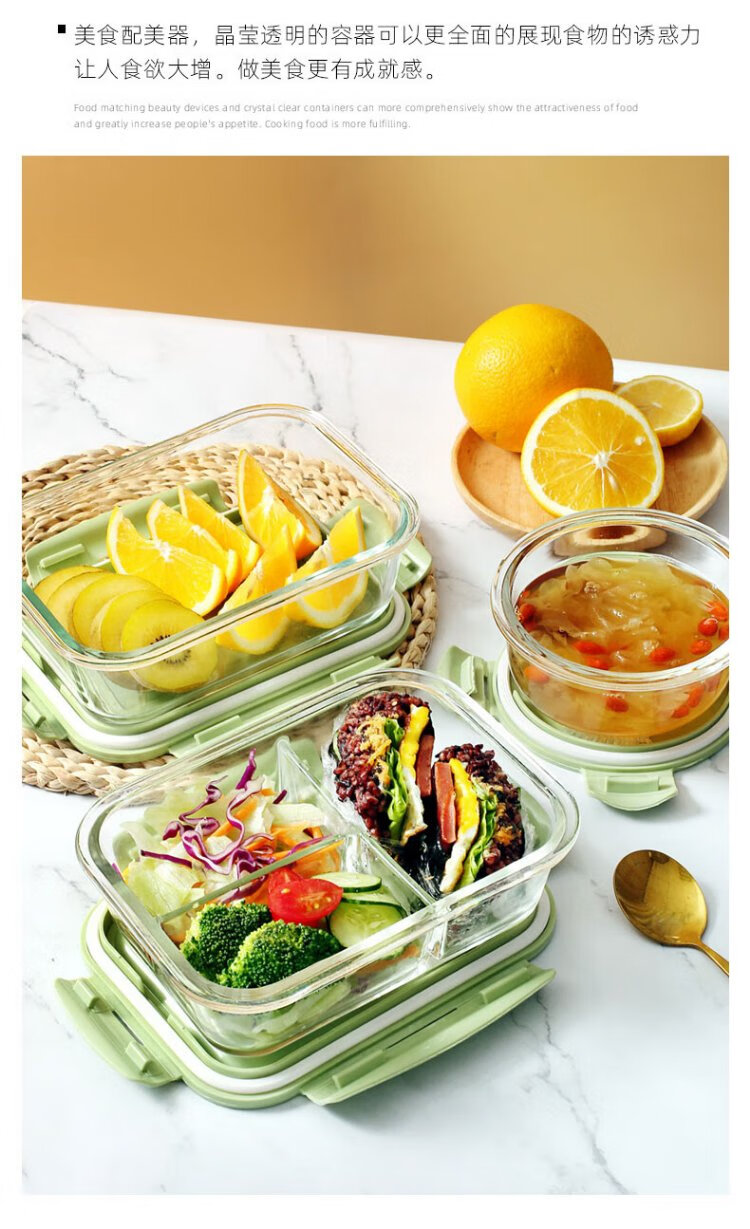 创得 耐热玻璃保鲜盒 微波炉饭盒上班族学生带饭密封碗分隔便当盒 北欧绿圆420+三隔1050ml+包+餐具