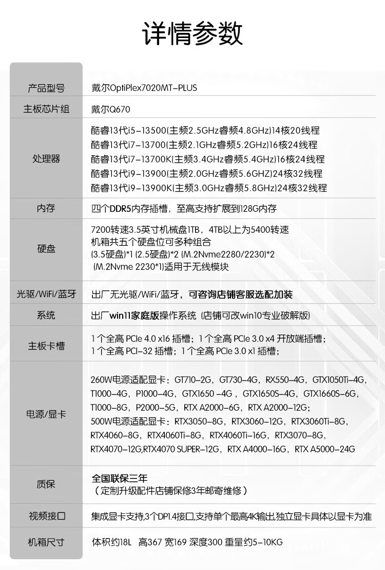 Dell (DELL) OptiPlex7020MT Plus 13. Generation Core i7 Desktop-Computer Host kommerzielles Komplettset HT11C i7-13700 128G 2 TB Solid State + 8T mechanisches GTX1050Ti-4G unabhängiges Display angepasst