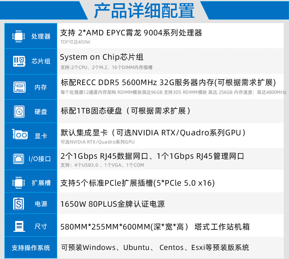 朴赛 双路EPYC霄龙9754/9654 DeepSeek本地化部署 图形工作站/CPU渲染/仿真计算/有限元分析工作站主机 双路霄龙9754 2.25G 256核512线程 含128G内存1T固态集成显卡