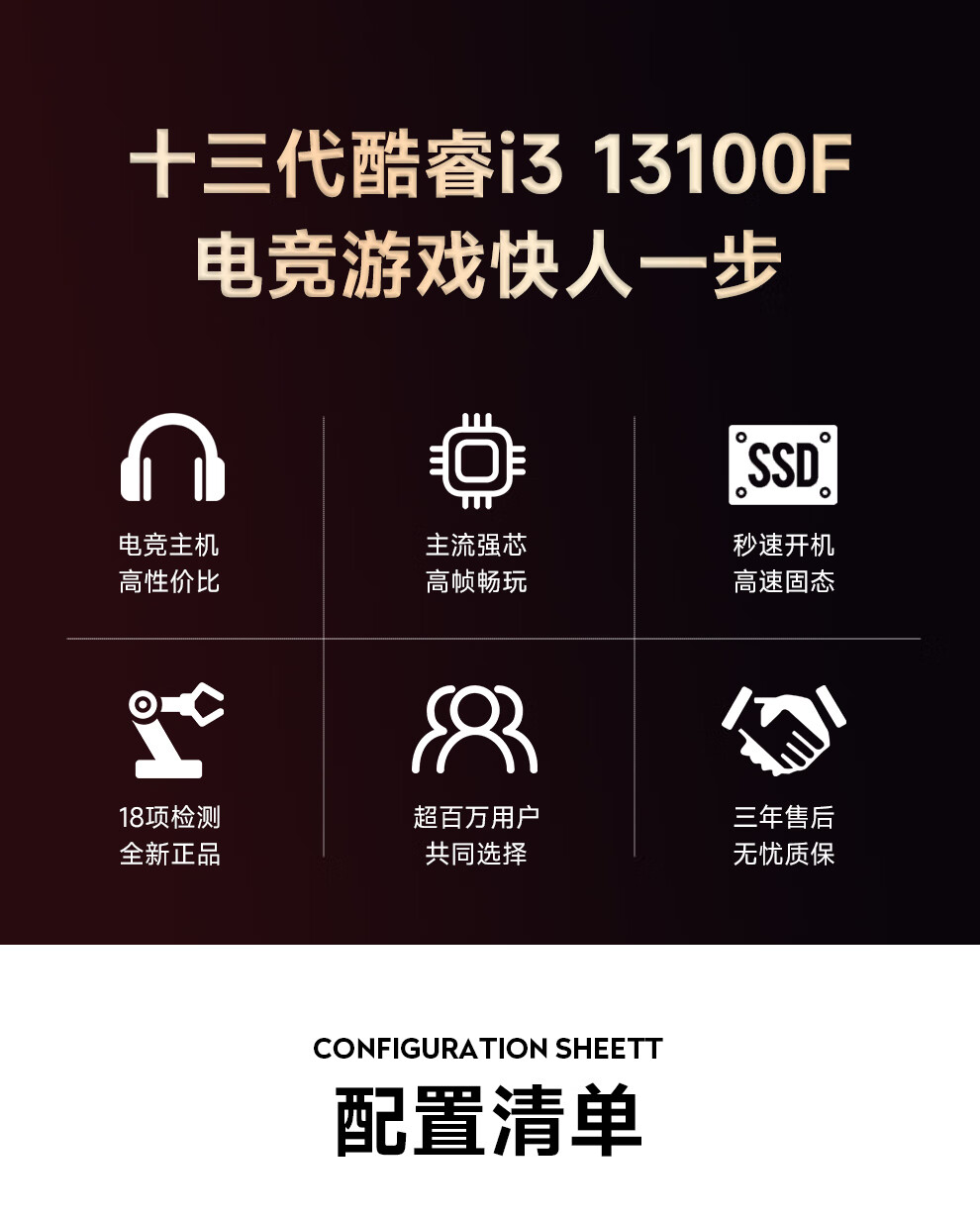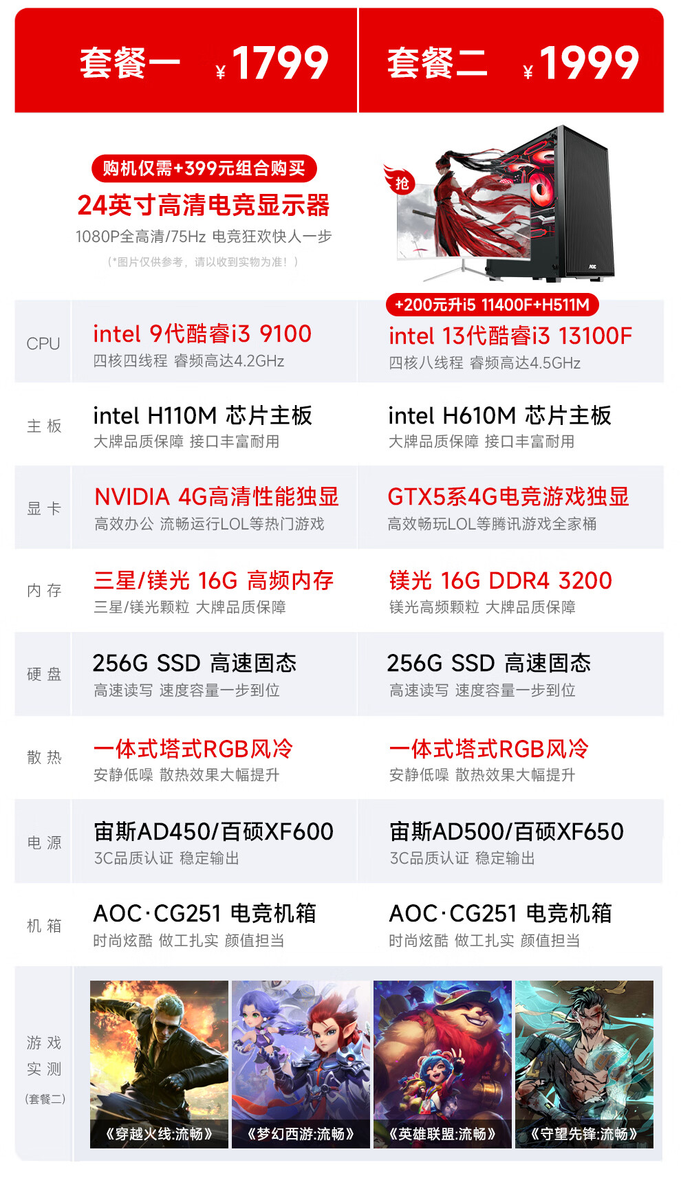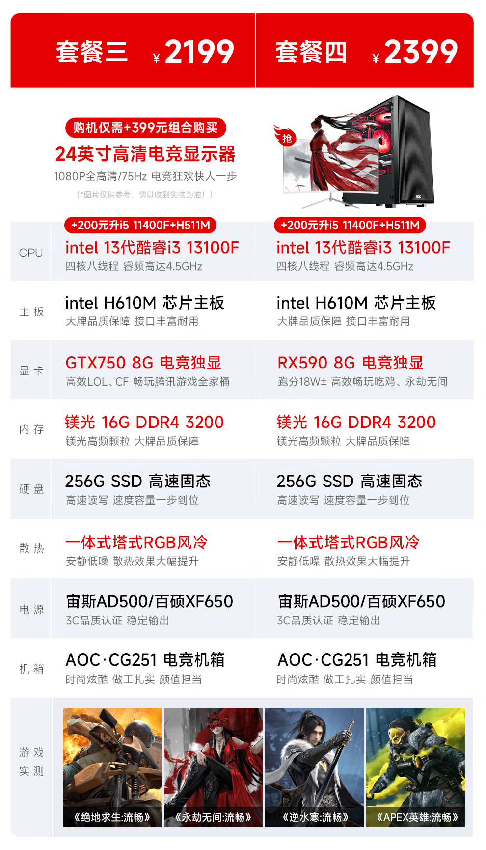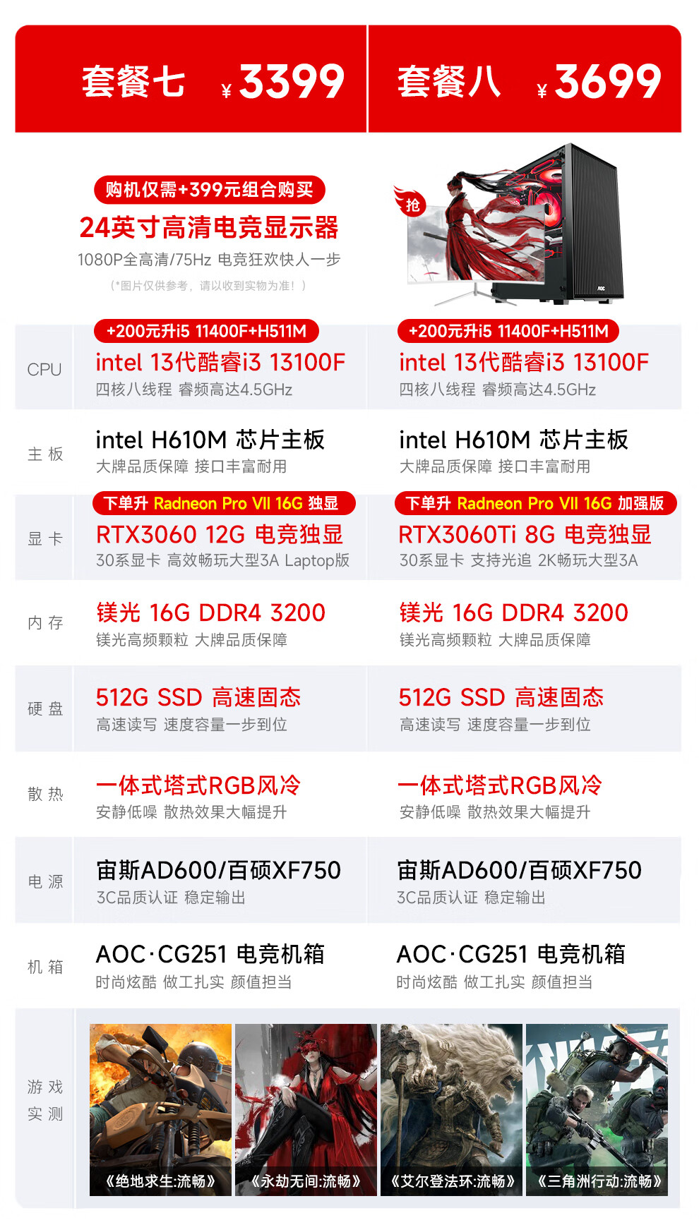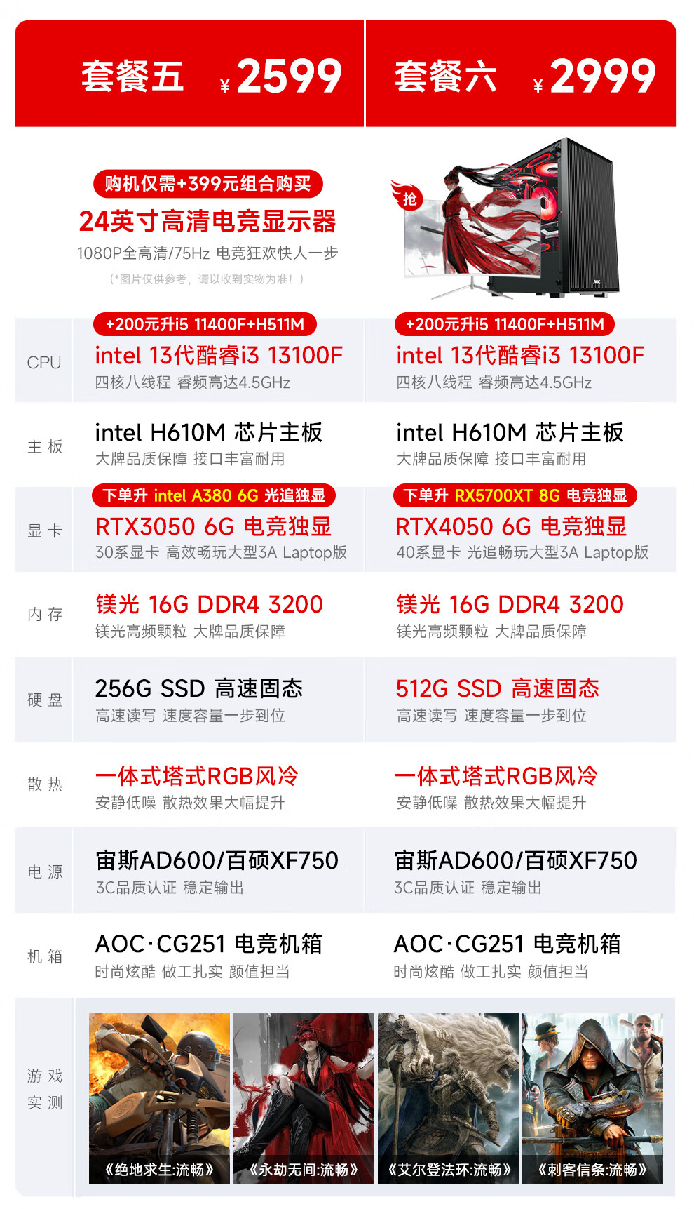 AOC Core i3 13100F/RTX3060/3050/4050 gaming e-sports design desktop computer host DIY assembly computer complete set chicken office complete set five i3 13100F丨16G丨RTX3050