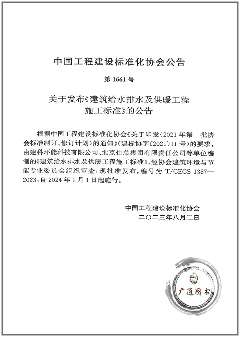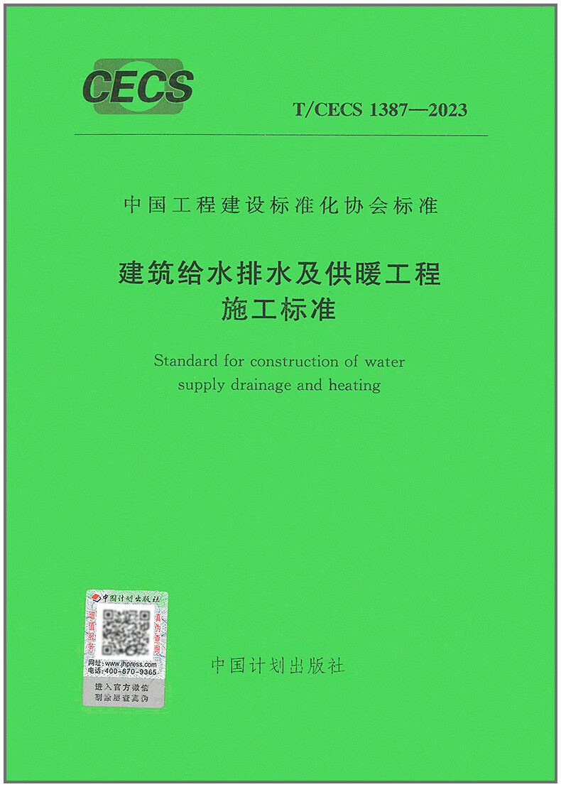 T/CECS 1387-2023 Norma de construcción para ingeniería de suministro de agua, drenaje y calefacción de edificios
