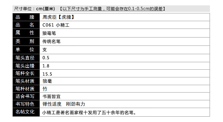 上海周虎臣狼毫毛笔小精工小楷簪花蝇头小字笔特细国画勾线描边笔 小精工 【出锋1.8cm】 小楷【中华老字号 始创1694年】