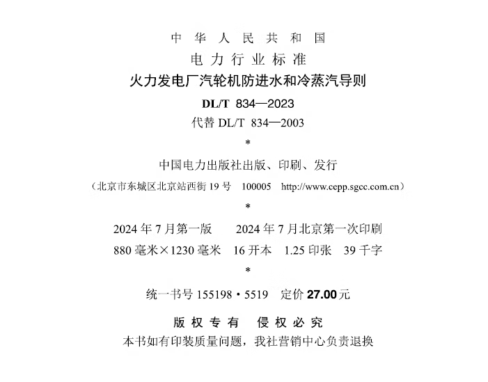 【按需印刷】DL/T 834-2023 火力发电厂汽轮机防进水和冷蒸汽导则(代替DL/T 834-2003)