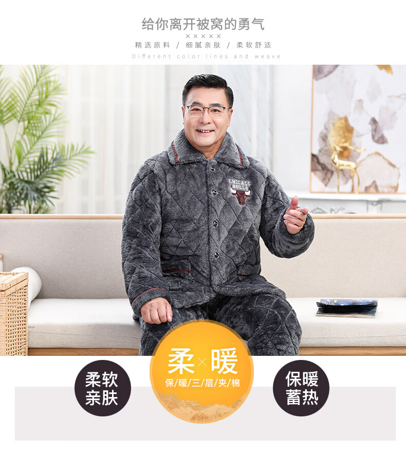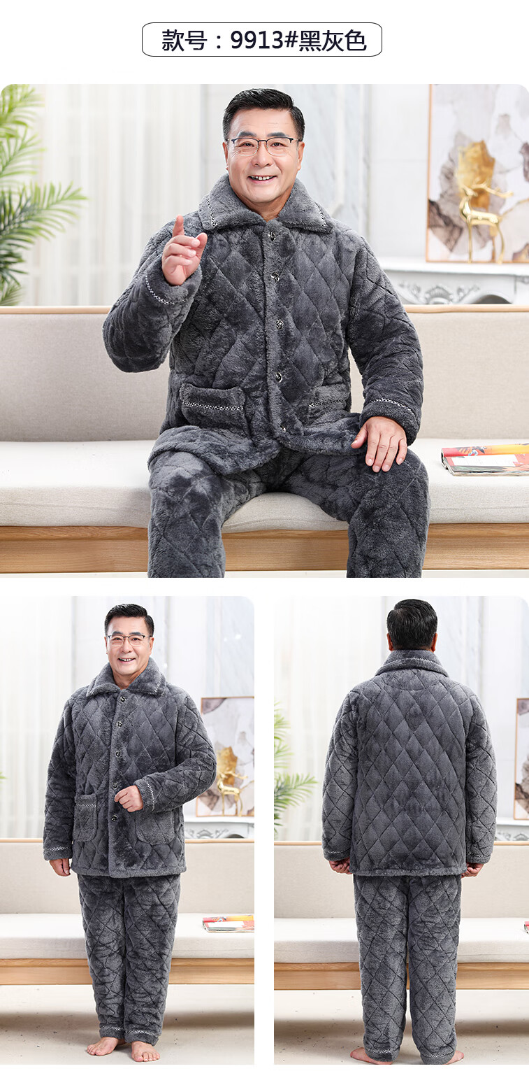 莫代尔睡衣男秋冬季三层加厚加绒珊瑚绒夹棉袄男士中老年爸爸家居服冬天 C9913#黑灰色男【长毛绒】 L (100-125斤)