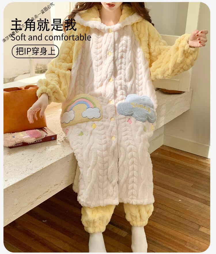 浪莎(LangSha)2025新款女士睡衣秋冬季珊瑚绒加绒加厚长款睡袍冬天法兰绒家居服 9196-【绒袍+绒裤】 L 建议体重100-120斤