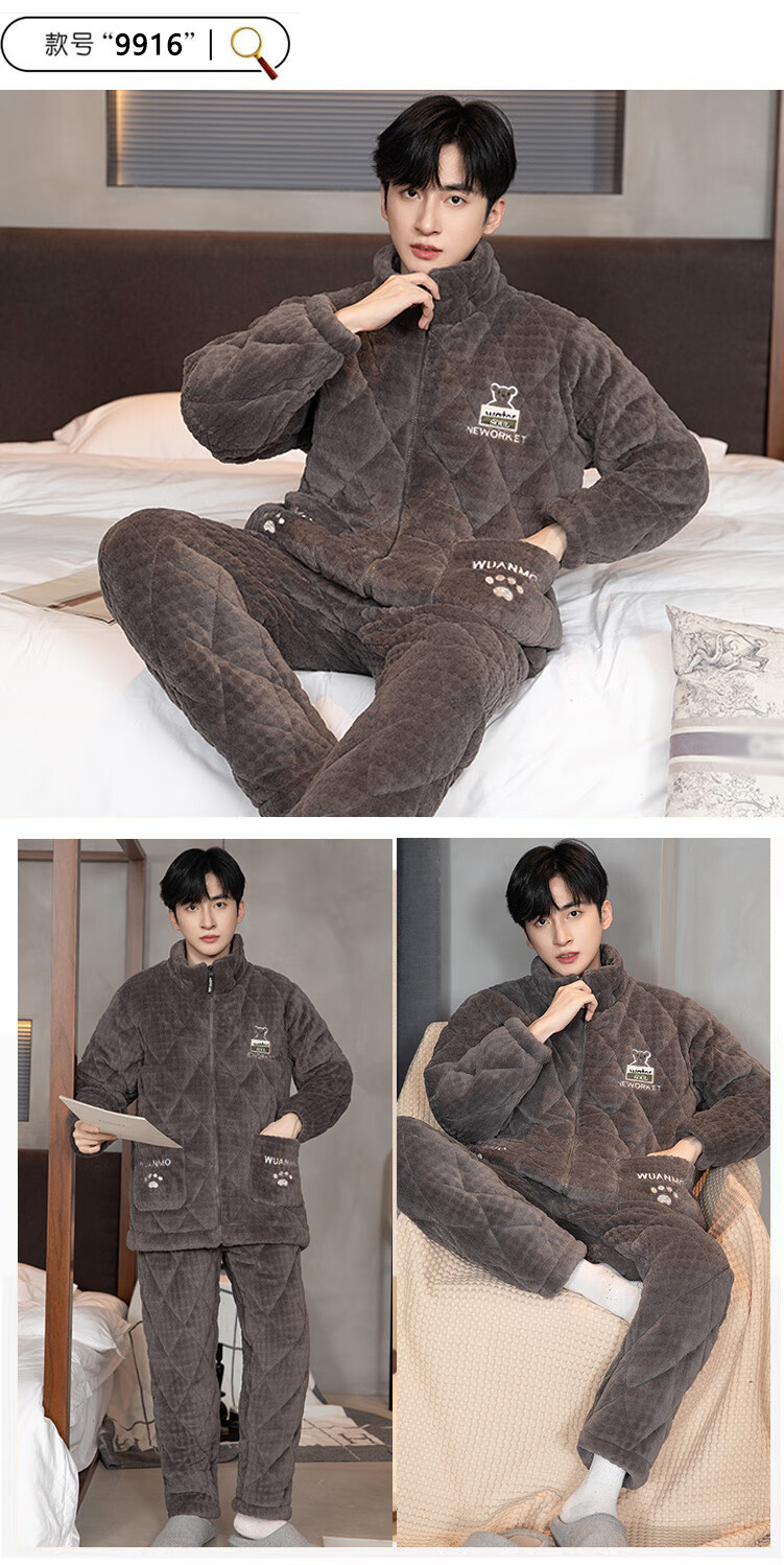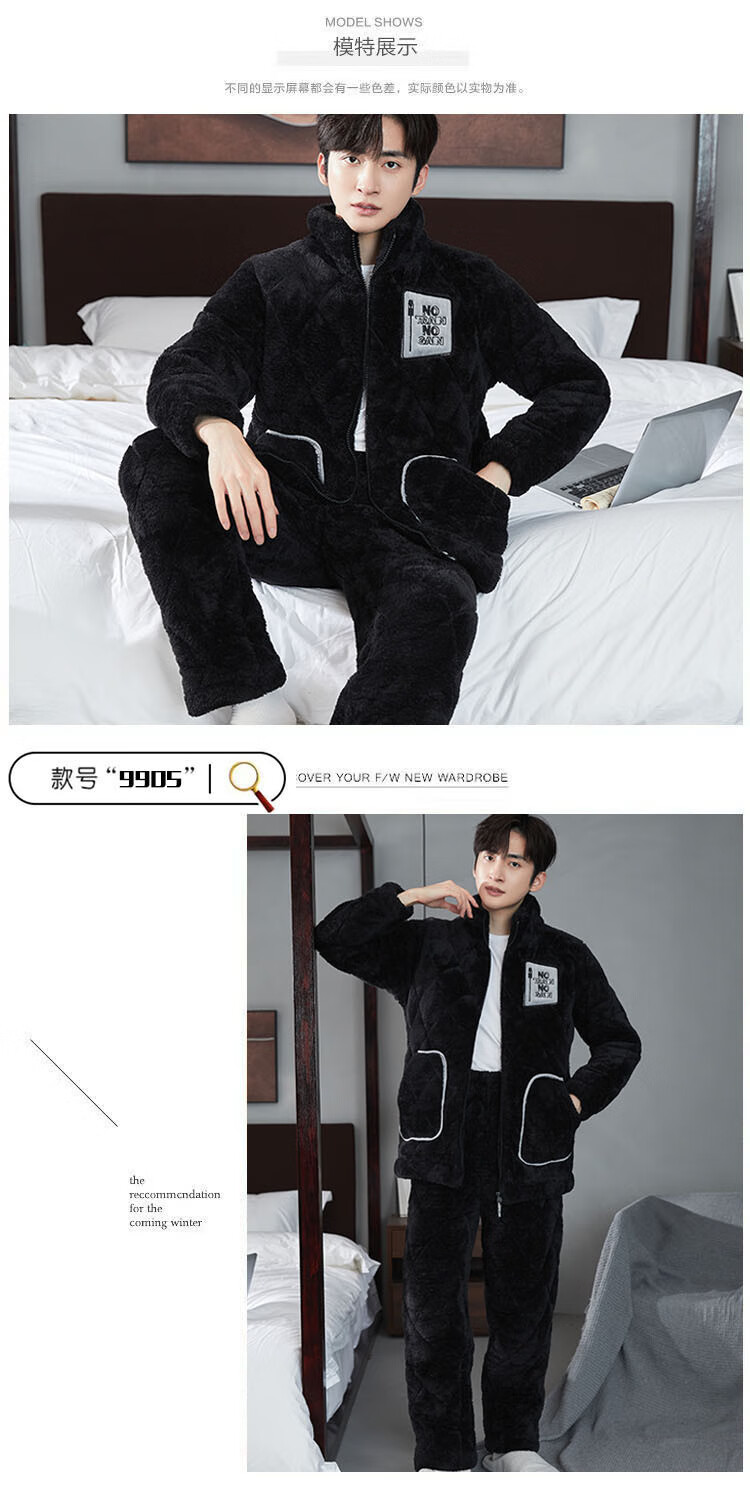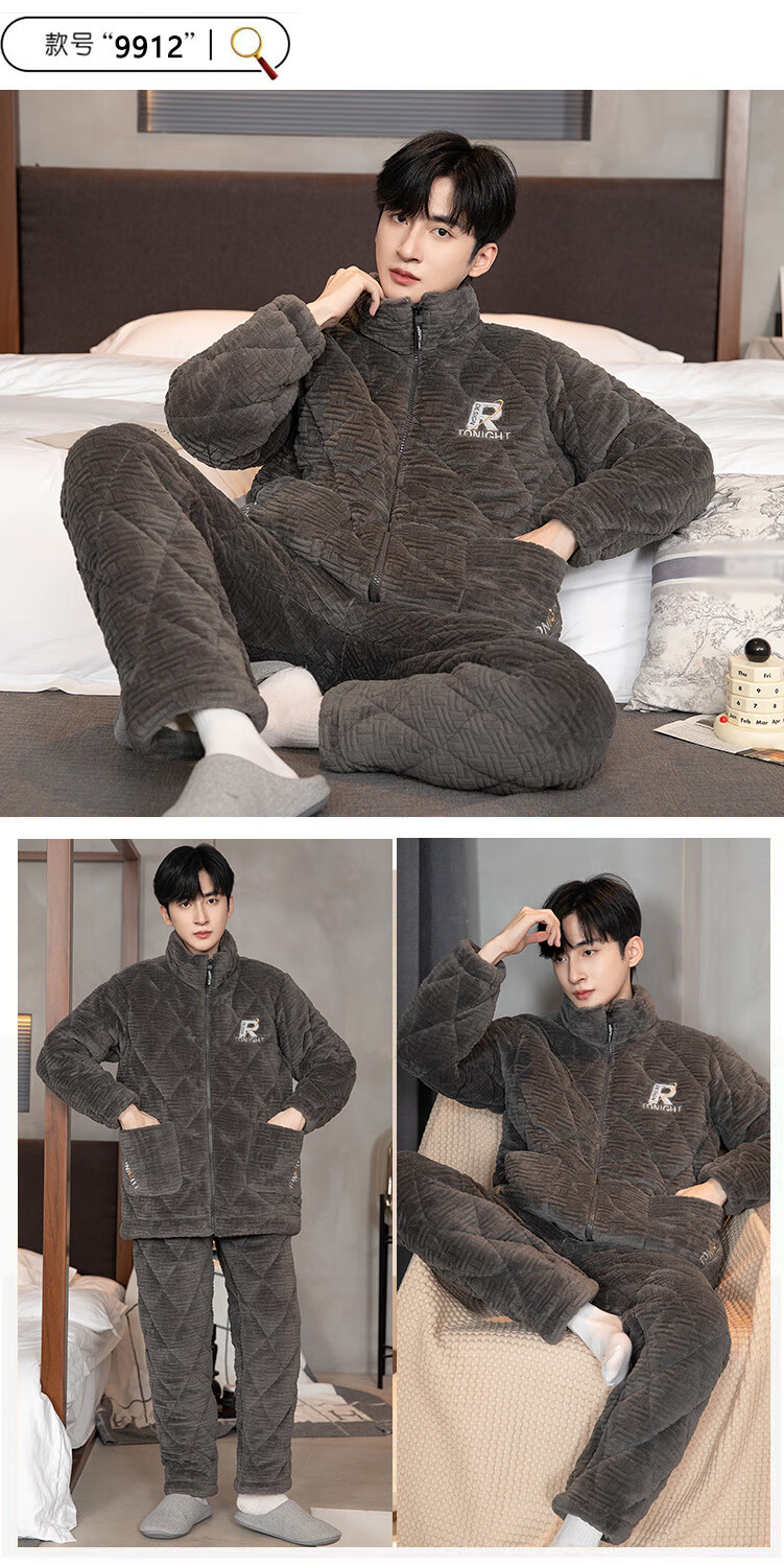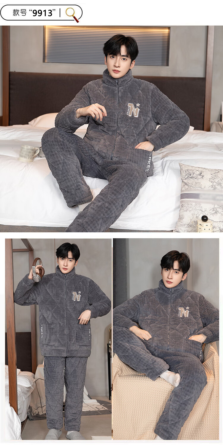 Modaler Herren-Pyjama, dreilagiger, gesteppter Korallensamt, verdickt, plus samtwarmes Flanell, großes Heimkleidungsset, kann draußen getragen werden, 9913# dunkelgrau, XL empfohlen (120–140 Jin Jin entspricht 0,5 kg)