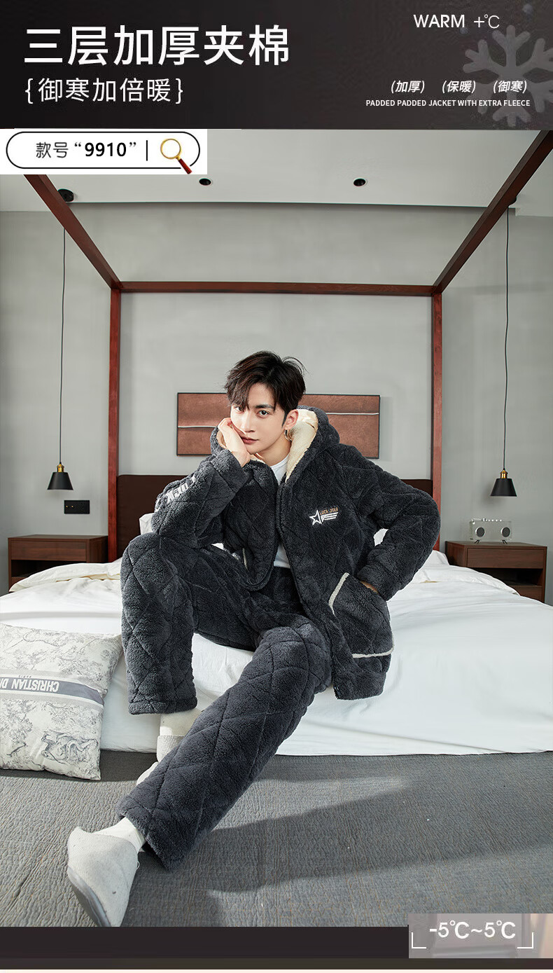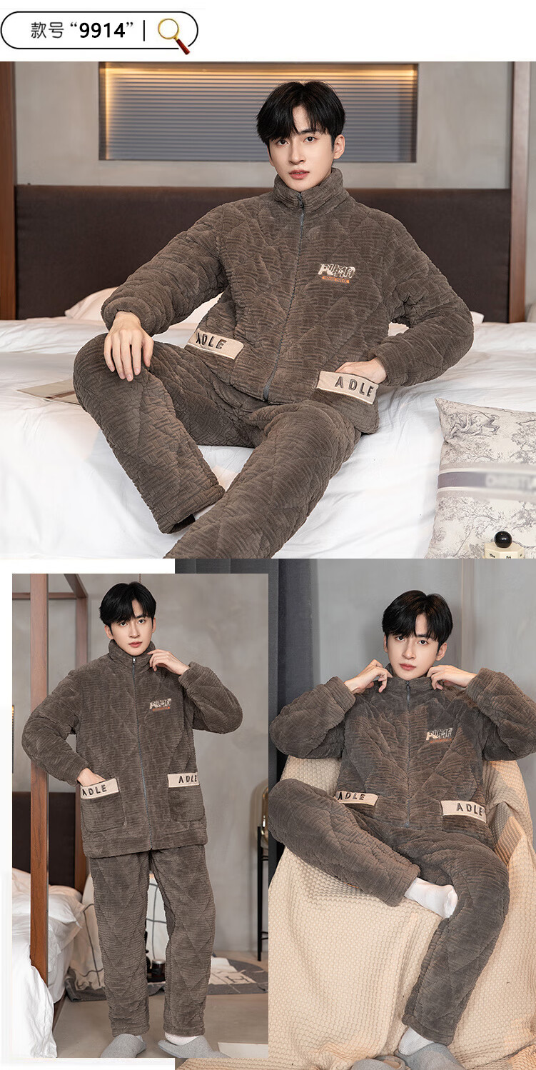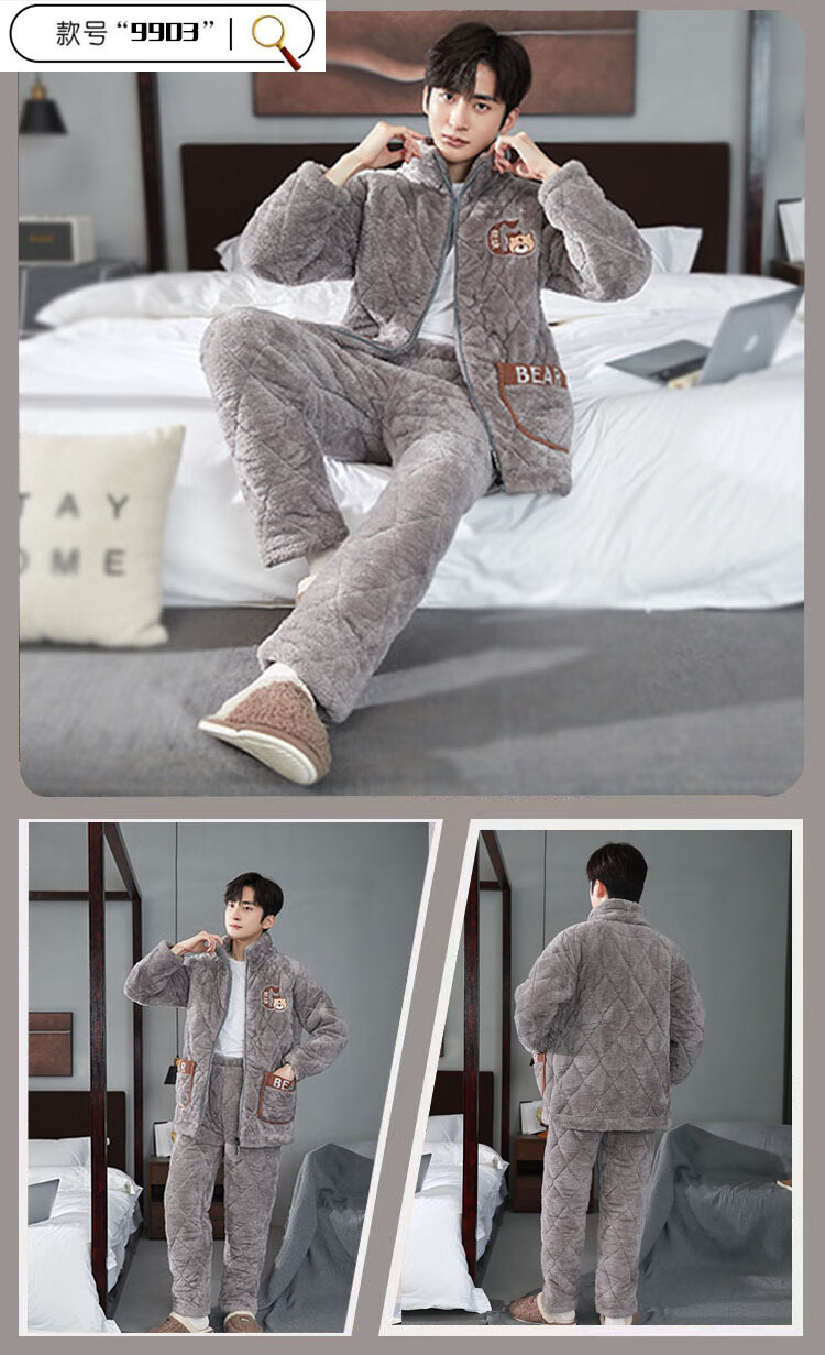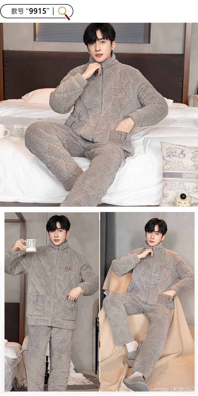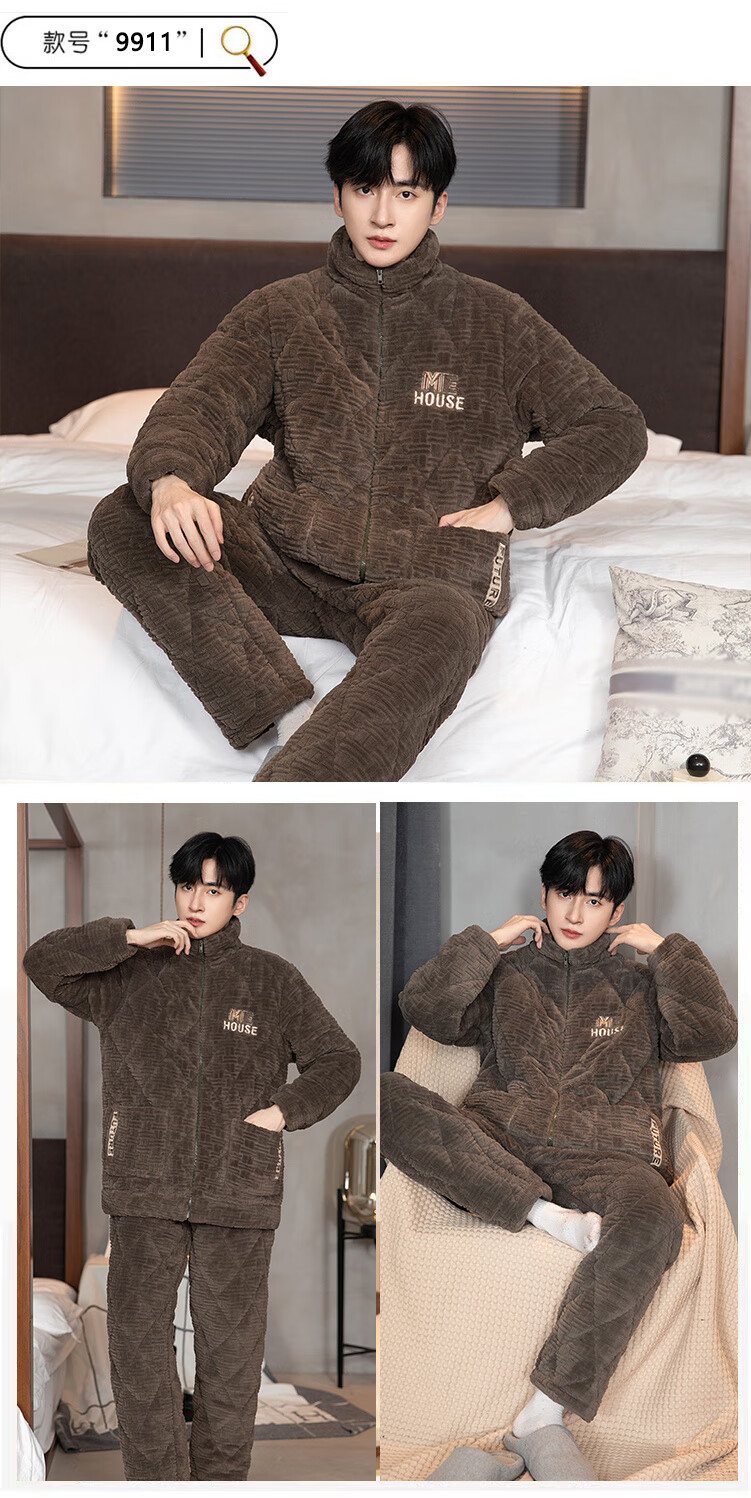 Modaler Herren-Pyjama, dreilagiger, gesteppter Korallensamt, verdickt, plus samtwarmes Flanell, großes Heimkleidungsset, kann draußen getragen werden, 9913# dunkelgrau, XL empfohlen (120–140 Jin Jin entspricht 0,5 kg)
