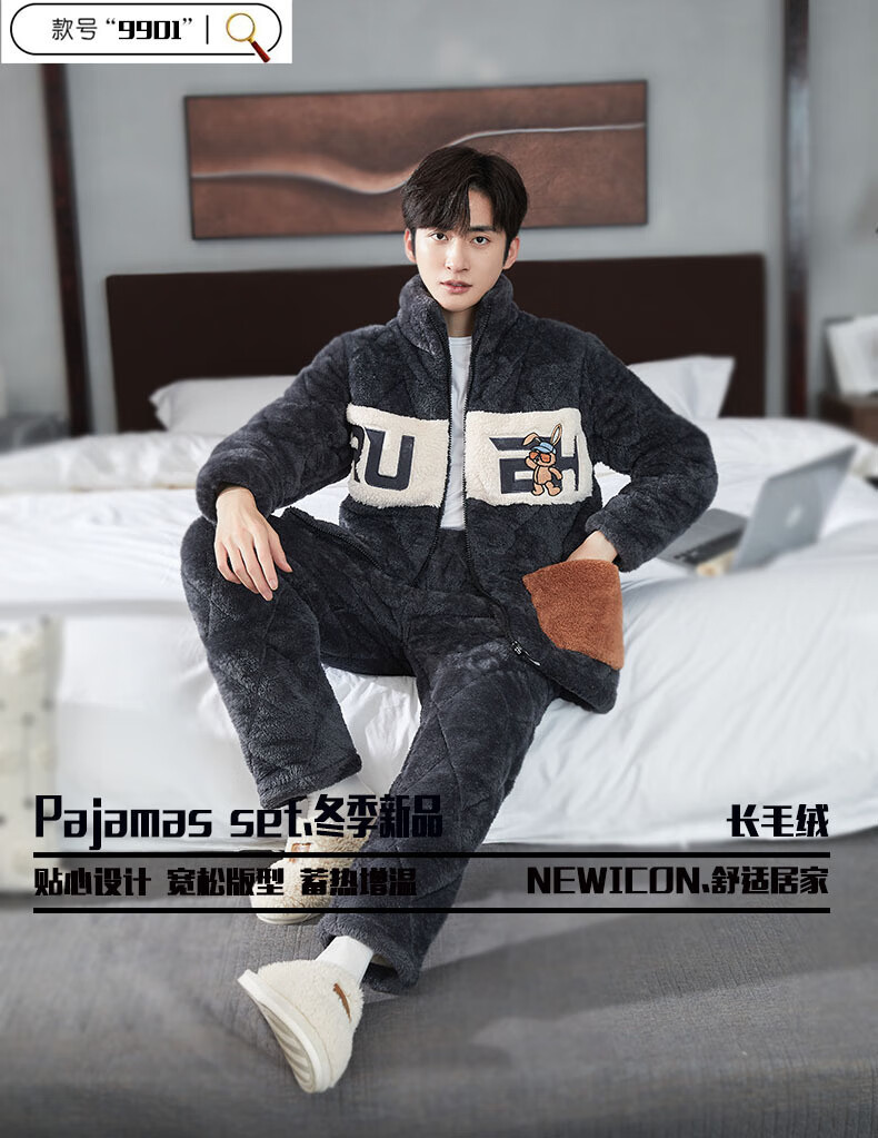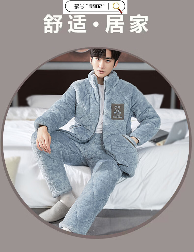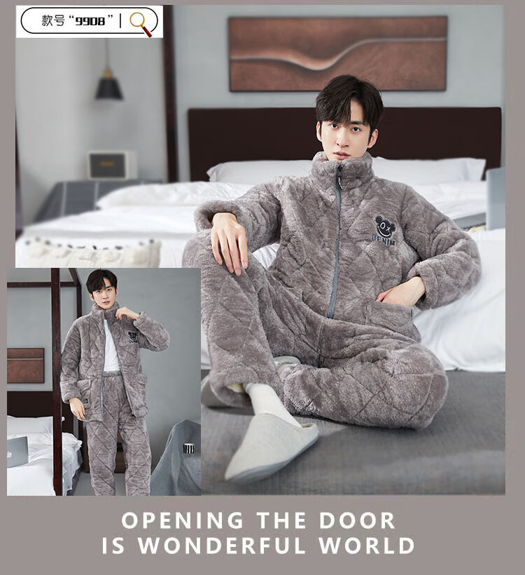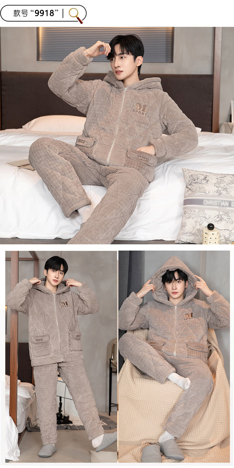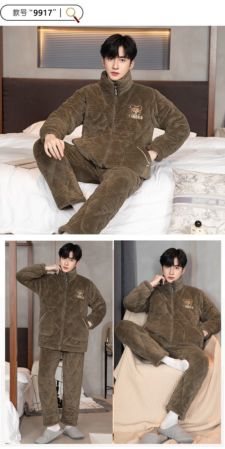 Modaler Herren-Pyjama, dreilagiger, gesteppter Korallensamt, verdickt, plus samtwarmes Flanell, großes Heimkleidungsset, kann draußen getragen werden, 9913# dunkelgrau, XL empfohlen (120–140 Jin Jin entspricht 0,5 kg)