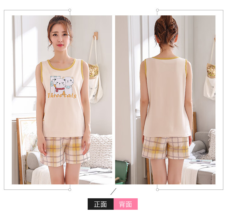 丹雨婷天天夏季女士背心短裤棉卡通睡衣薄款休闲棉质家居服睡衣女 浅绿色 9857背心套装女 S 码