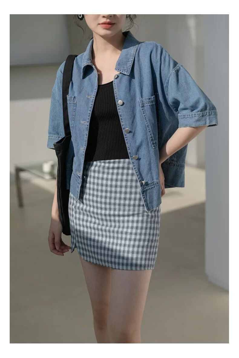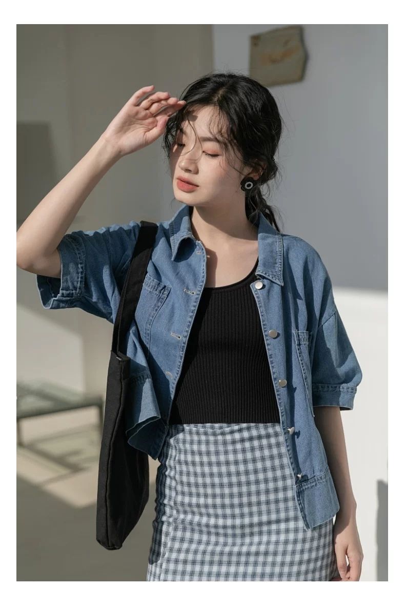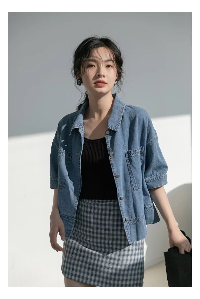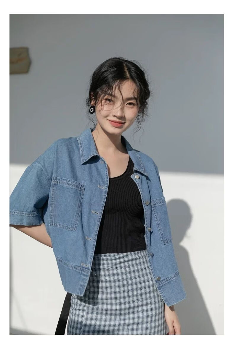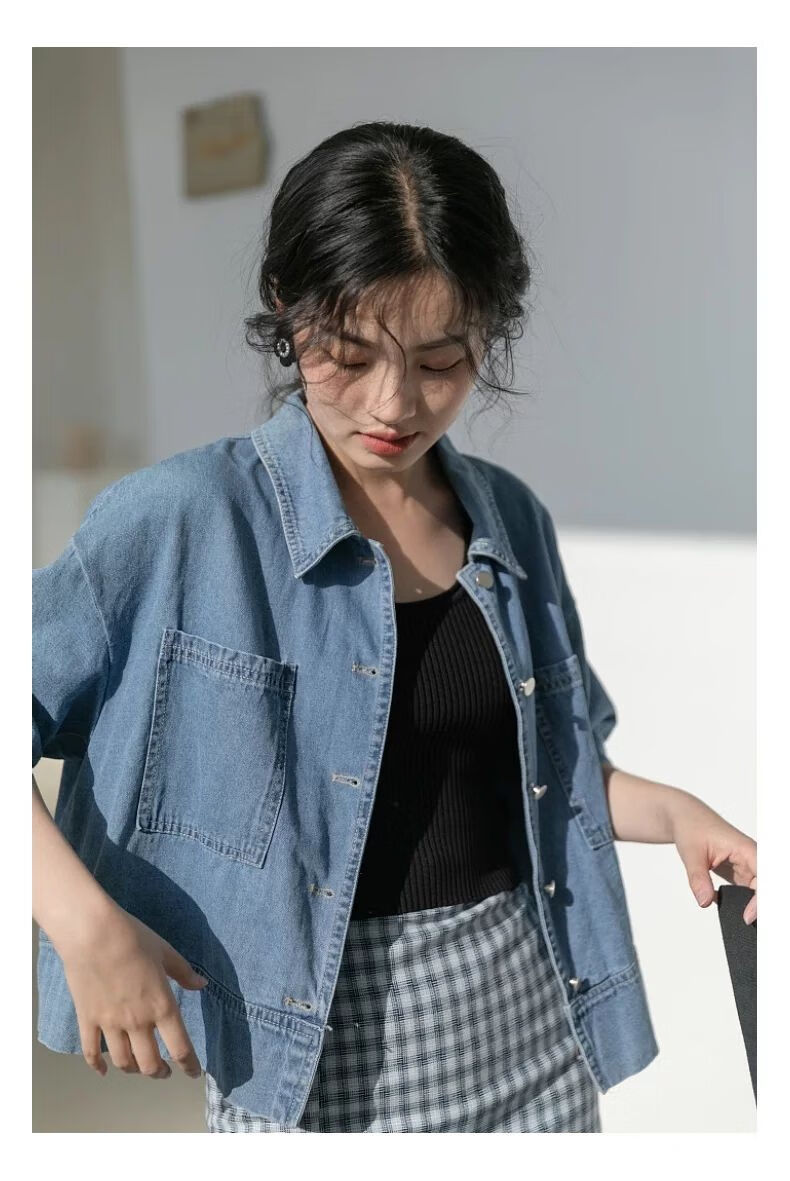 简方位牛仔衬衫2022夏装短款上衣复古港味气质百搭矮个子短袖外套女新款 869牛仔蓝 均码  S75-85斤