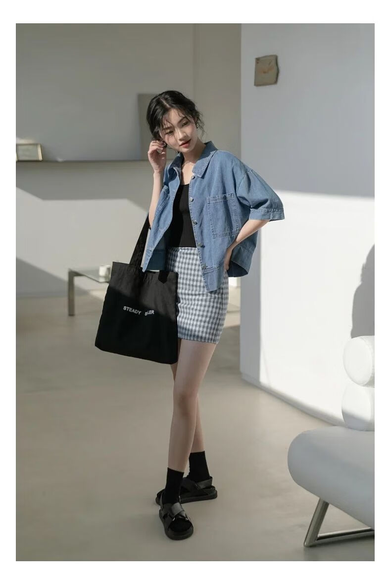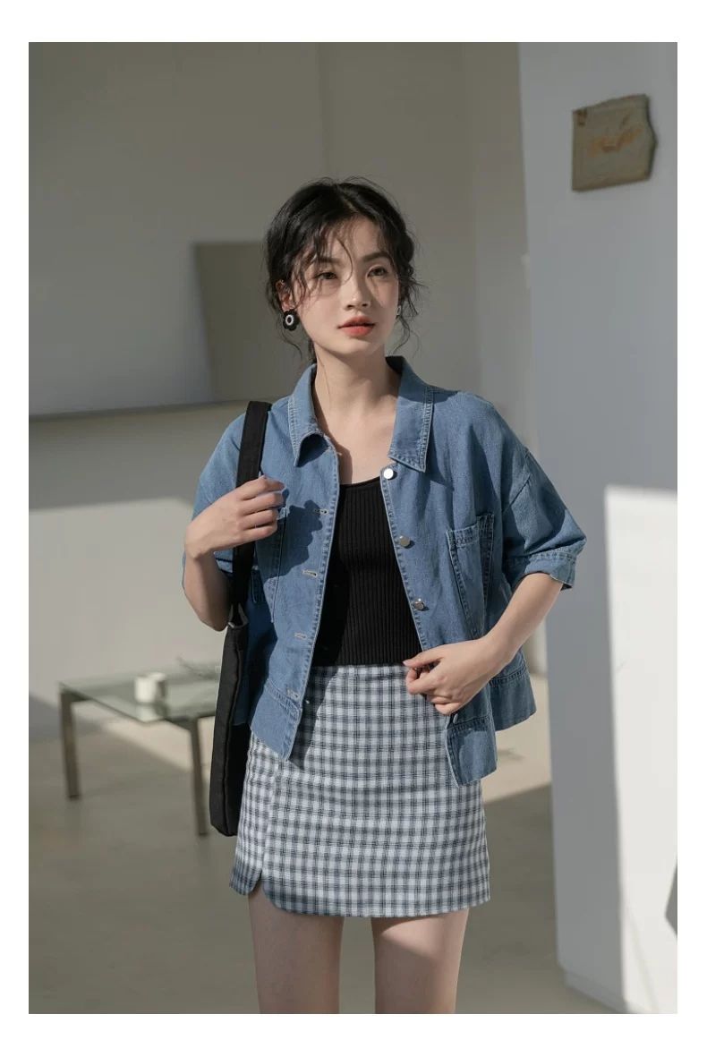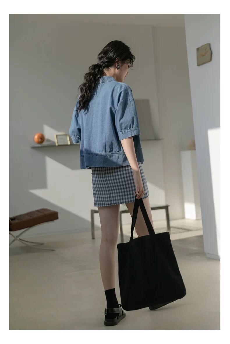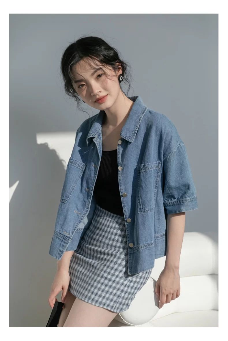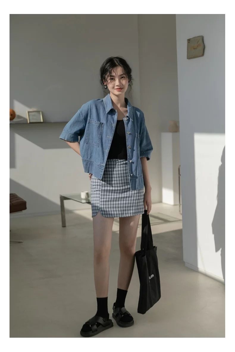 简方位牛仔衬衫2022夏装短款上衣复古港味气质百搭矮个子短袖外套女新款 869牛仔蓝 均码  S75-85斤