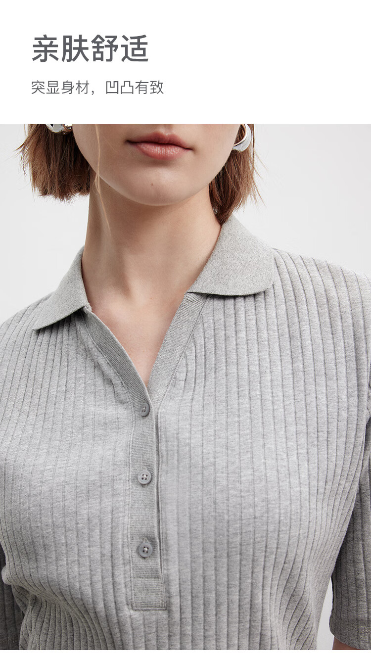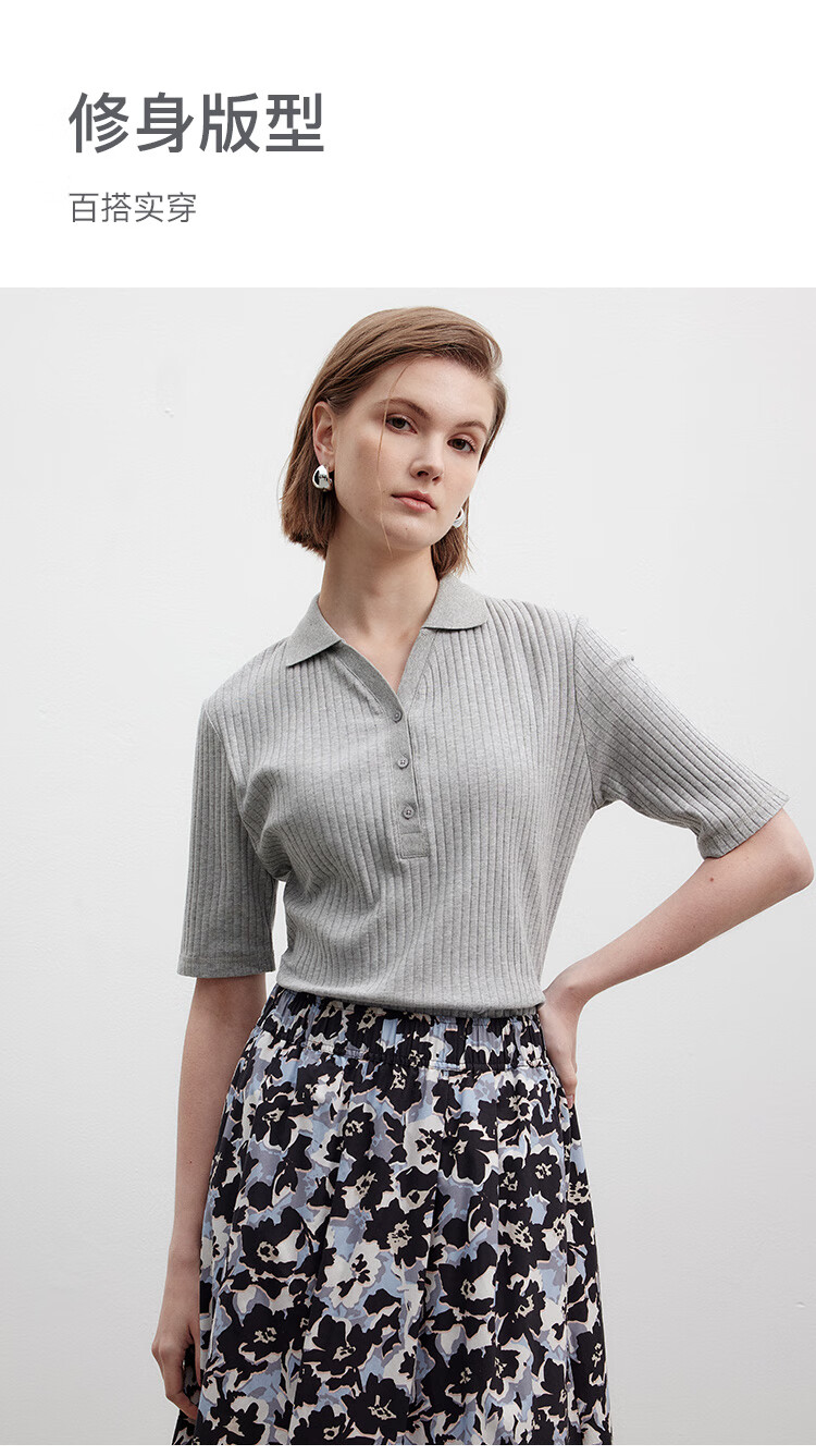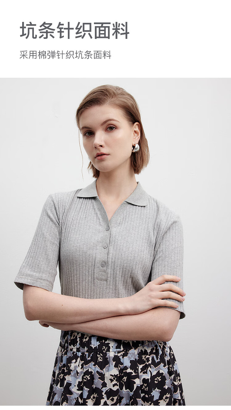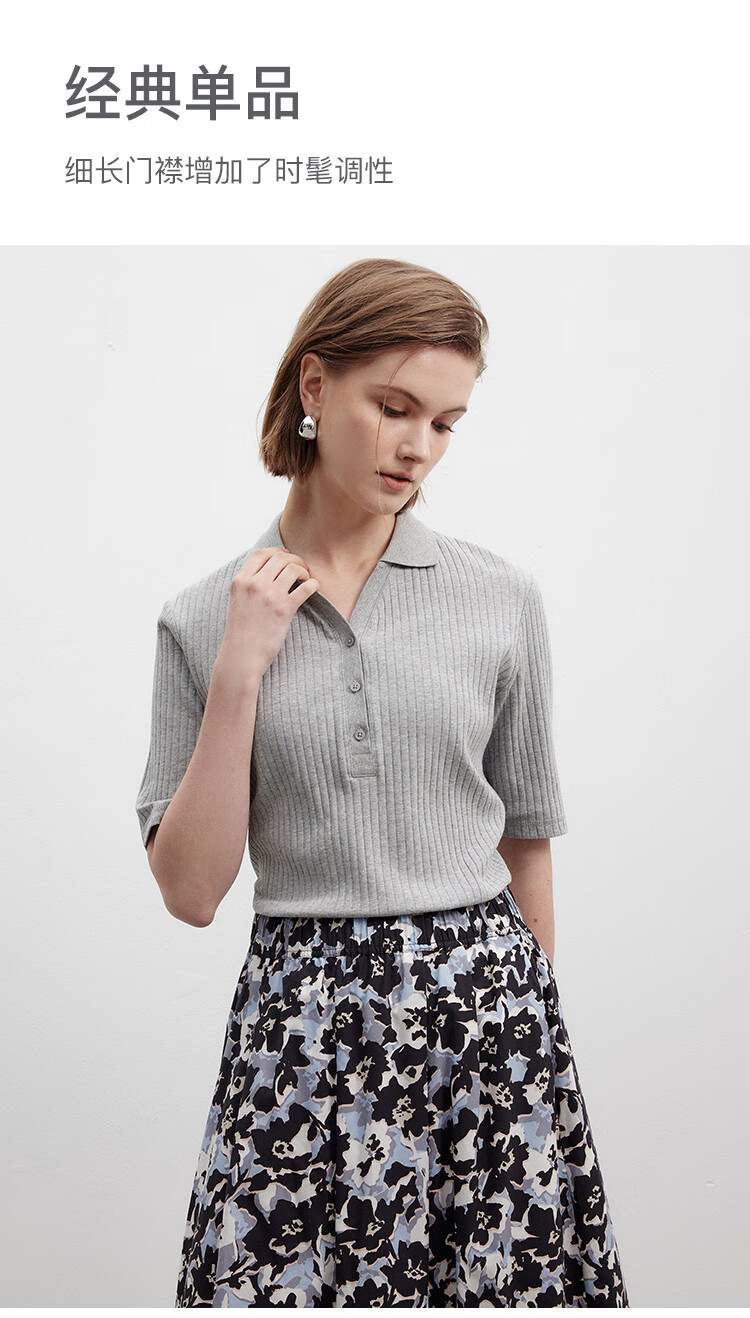 Marc O Polo/MOP printemps et été nouveau pull slim à manches courtes col en V pour femme, haut col polo simple et léger, gris fleuri clair 962 S /165