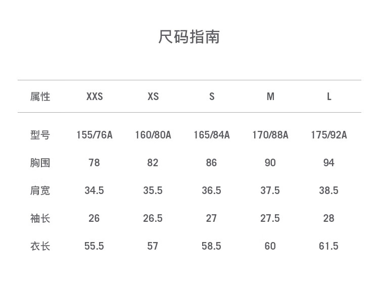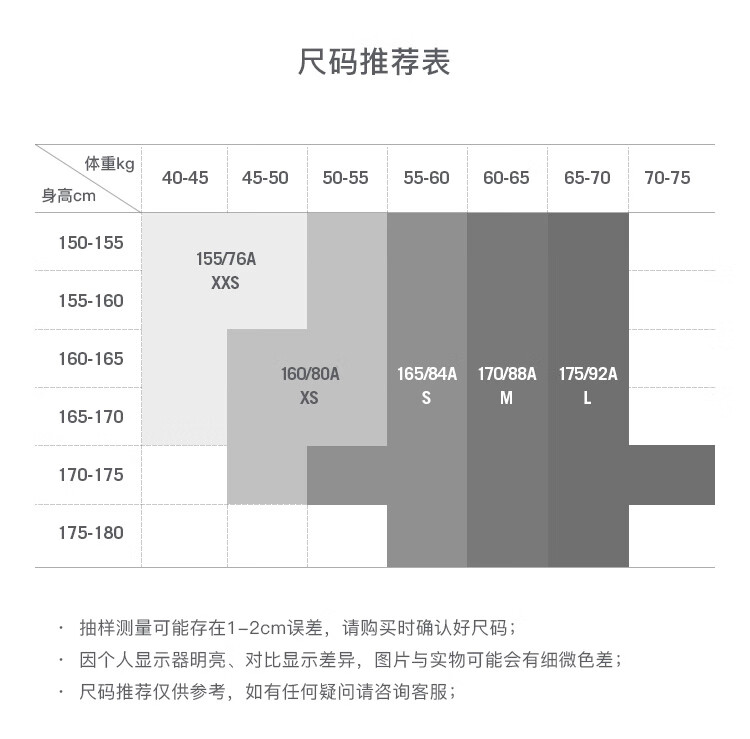 China (cm) 160-165/84-86 165-170 / 88-90 167-172 / 92-96 168-173 / 98-102 170-176 / 106-110