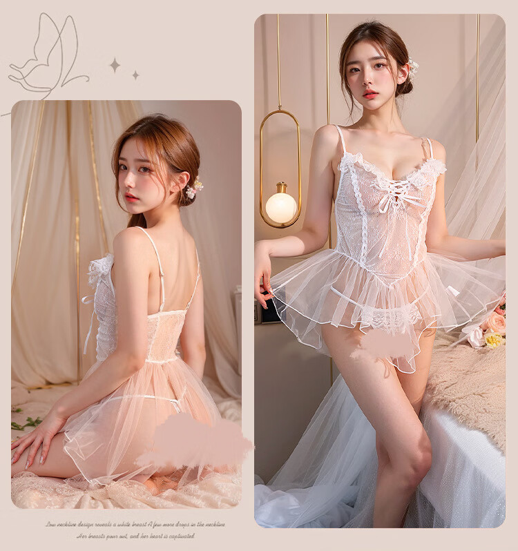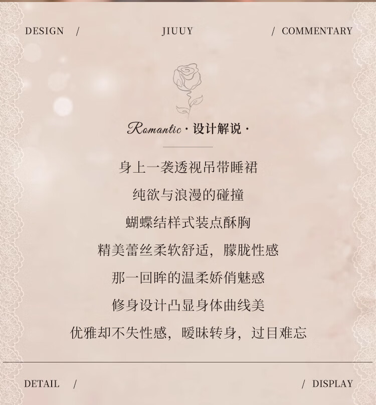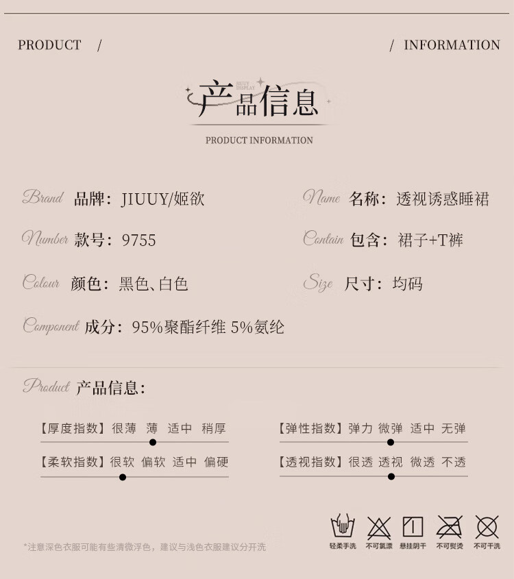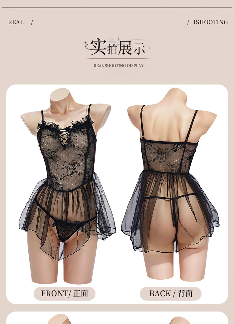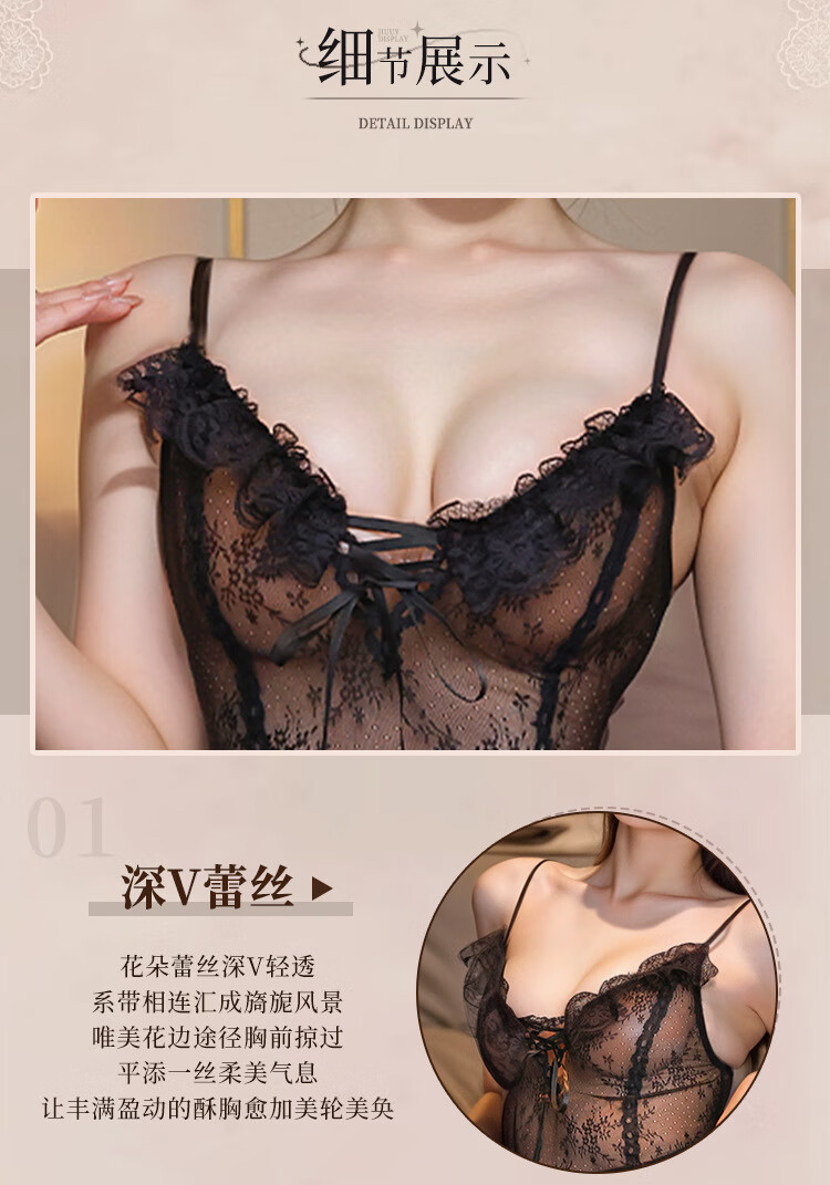 姬欲(JIUUY)蕾丝性感透视吊带内衣激情套装女睡衣制服诱惑9755 9755黑(连体衣+T裤) 均码