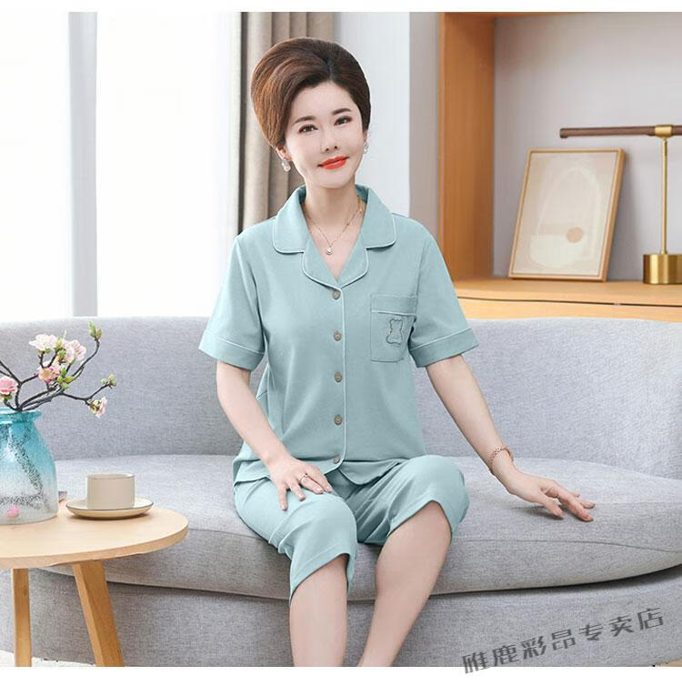 雅鹿妈妈开衫睡衣女夏季棉短袖七分裤大码薄款中老年妈妈家居服套装 9893# M 【建议80-100斤】