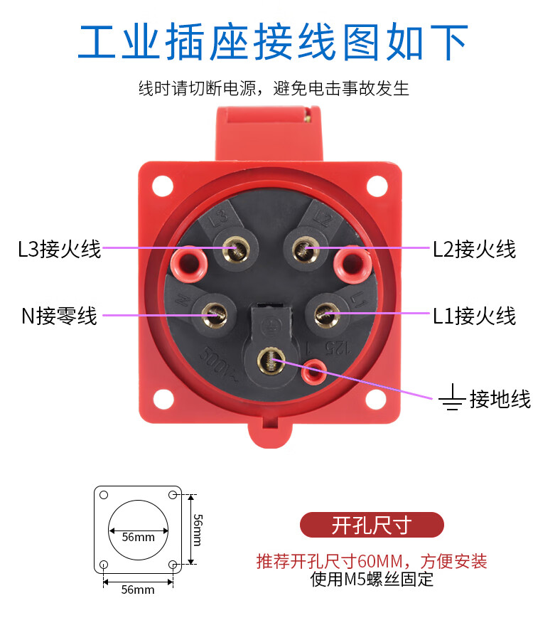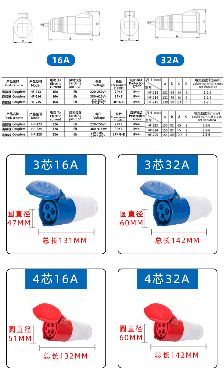 禾丰工业插头插座连接器三相电3芯4芯5孔16A32A航空防水防爆插头对接 HF-12532A五芯明装插座尼龙