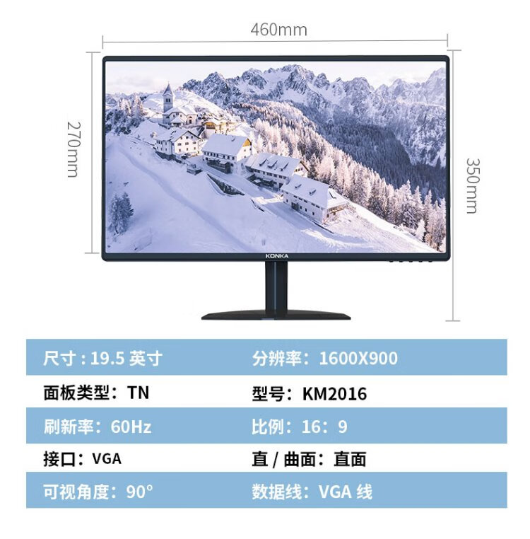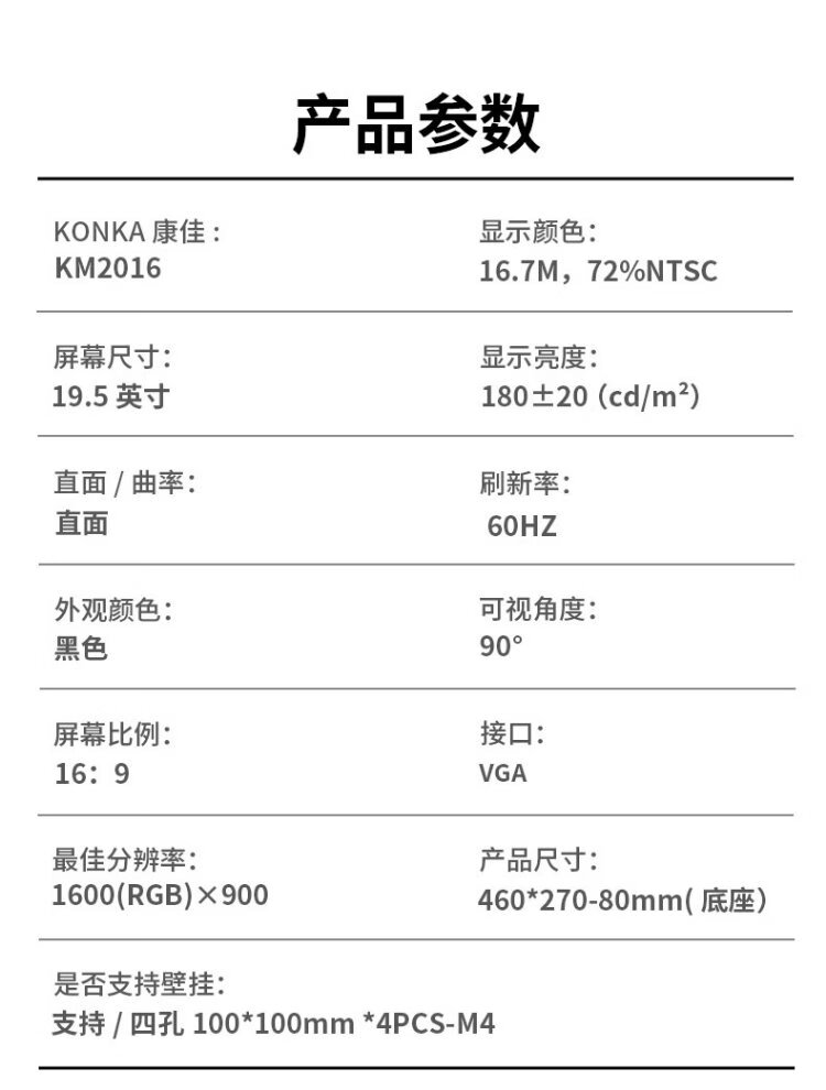 康佳(KONKA)19.5英寸显示器 快速响应不延迟 可壁挂 出厂校色 VGA 办公监控液晶电脑显示屏 KM2016