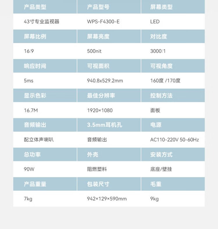 威普森(WINPSEN)43英寸监控显示器 LED高清节能显示屏 1080P高刷 工业级安防监视器屏幕 可壁挂 HDMI+VGA