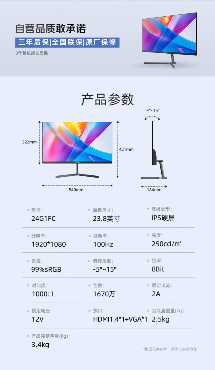 ADDFUN 23.8-inch IPS screen 100HZ low blue light 1080P wide color gamut HD HDMI+VGA home state-subsidized office e-sports game monitor 24G1FC