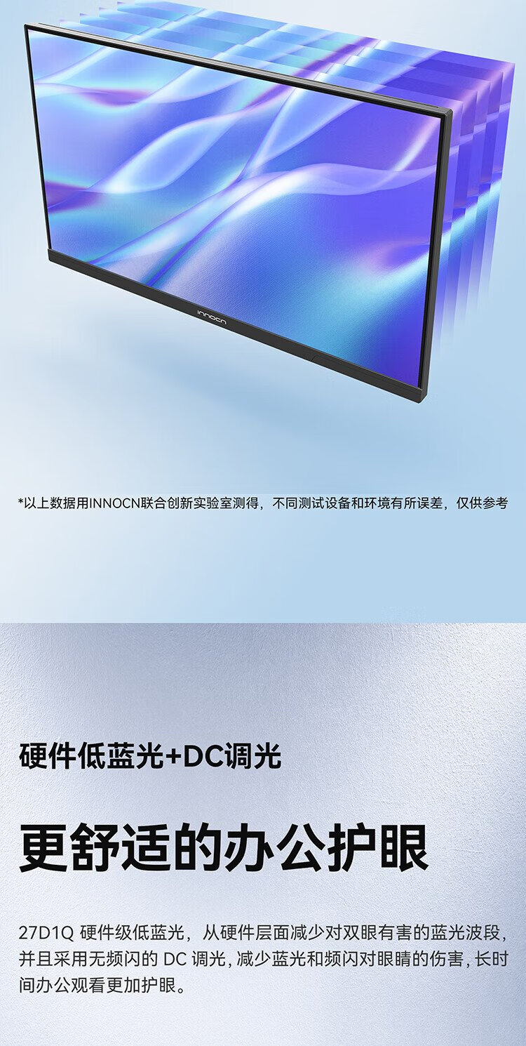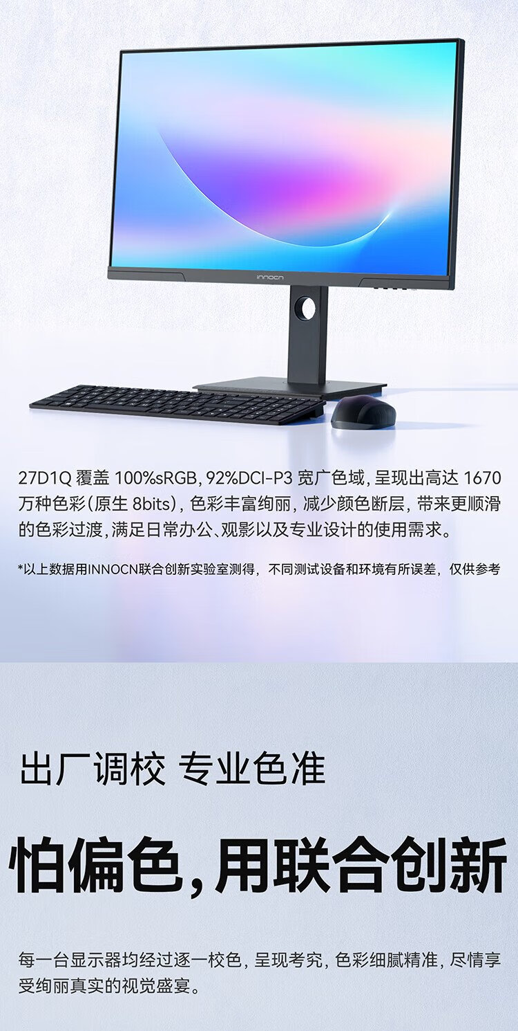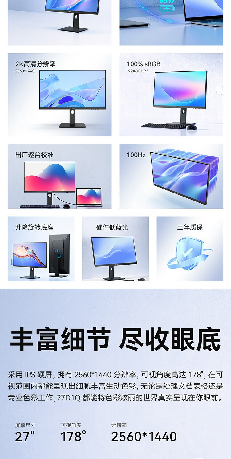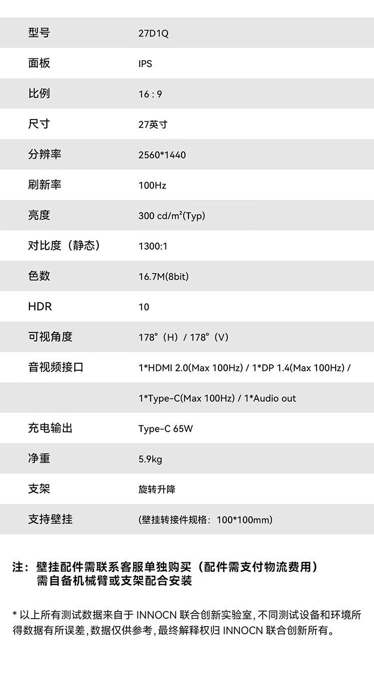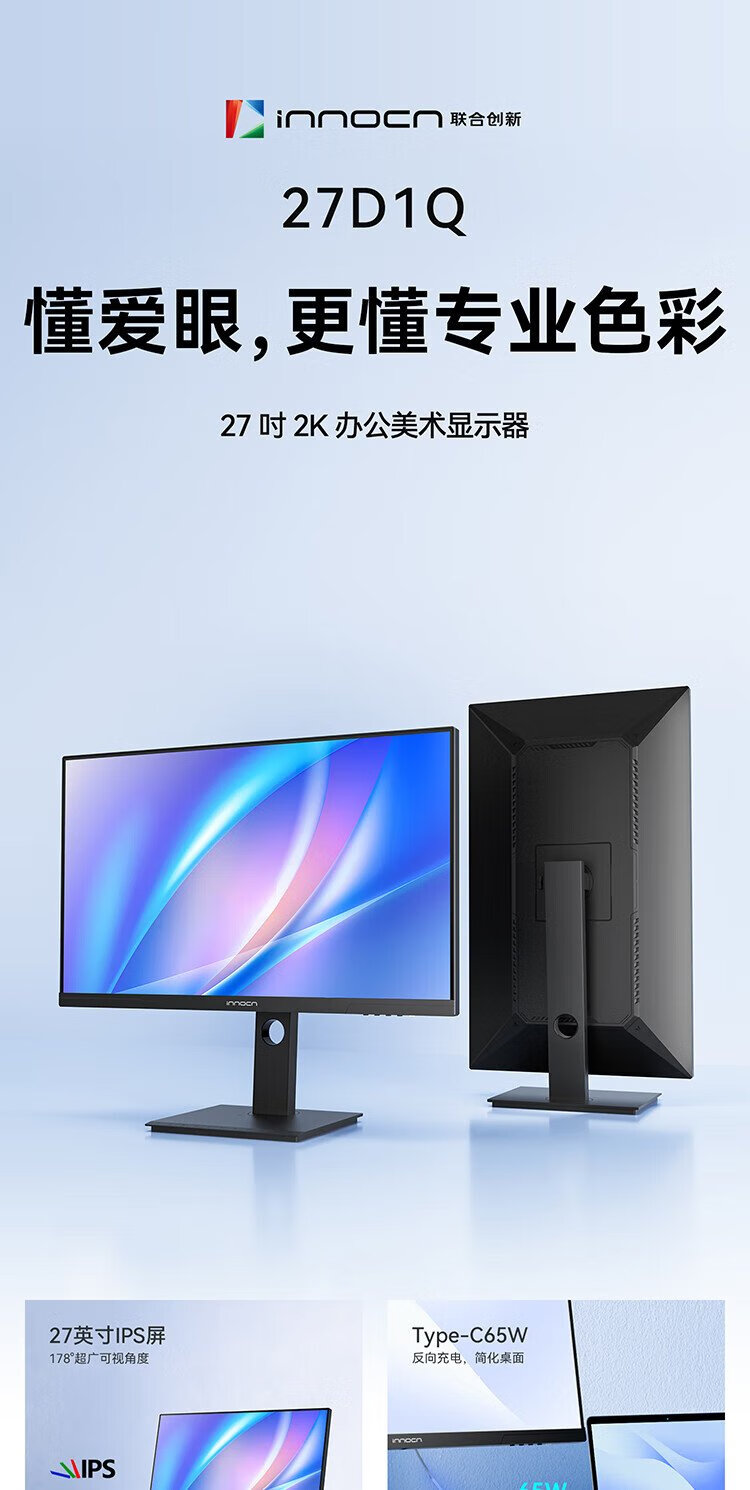 联合创新27英寸 2K高清100Hz IPS广色域Type-C65W旋转升降 硬件低蓝光护眼 电脑办公显示器27D1Q