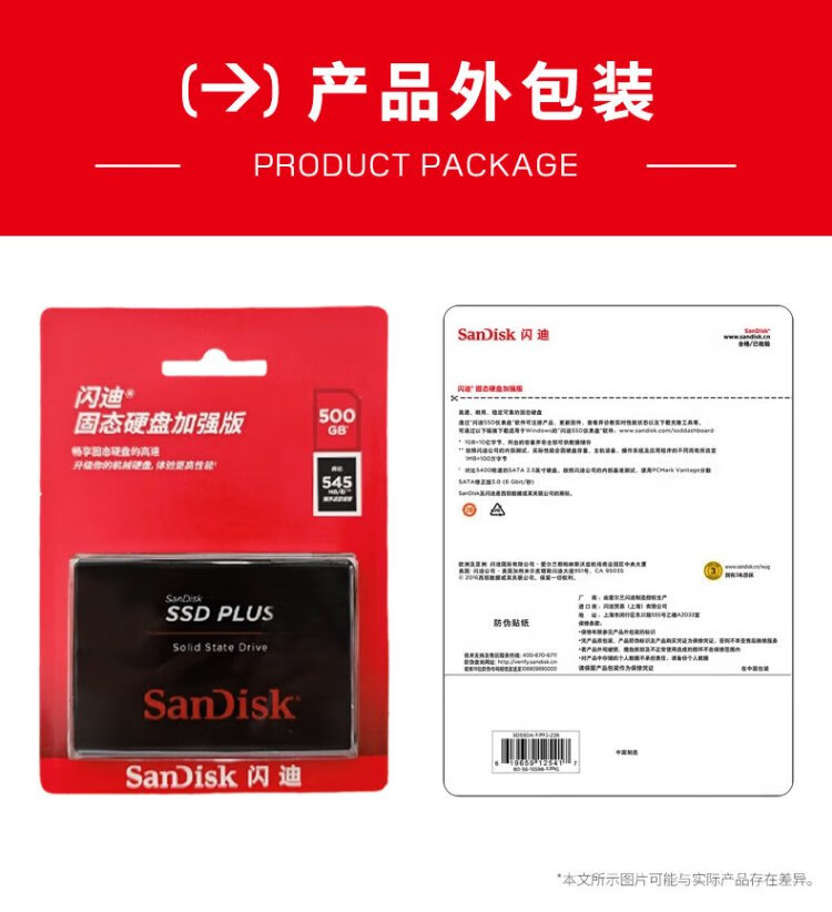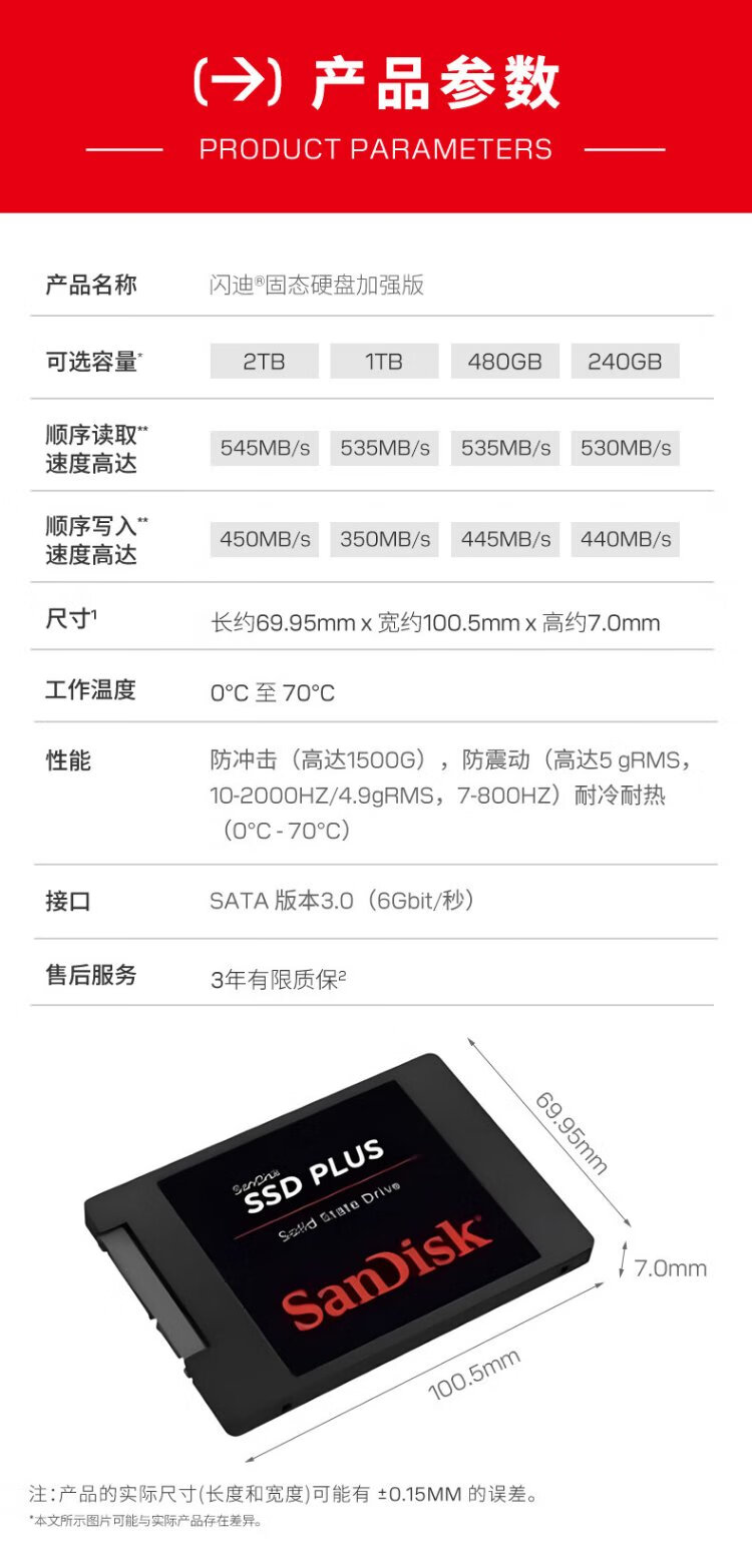 闪迪(SanDisk)2TB SSD固态硬盘545MB/s读速PLUS性能加强版SATA接口2.5英寸TLC颗粒台式机笔记本扩容电脑升级