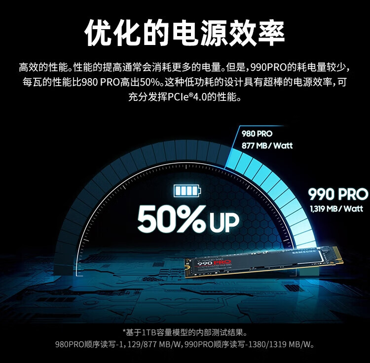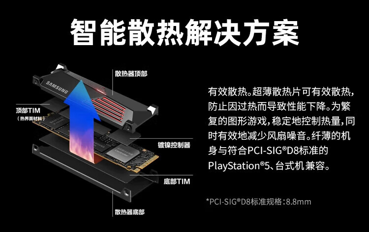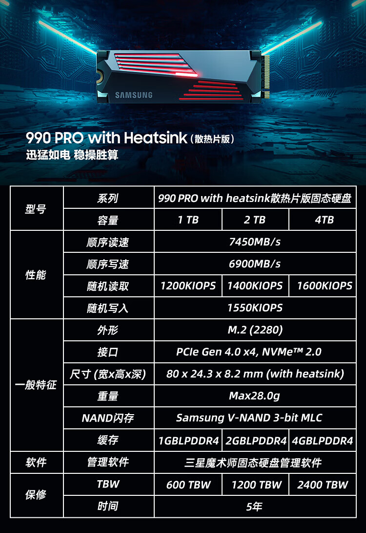 三星(SAMSUNG)1TB SSD固态硬盘 M.2接口(NVMe协议PCIe 4.0 x4) 990 PRO With Heatsink散热片版 台式机 PS5