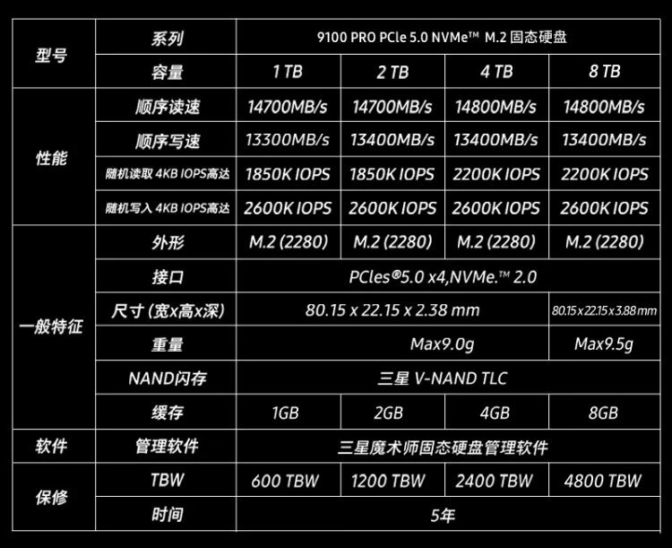 三星(SAMSUNG)4TB SSD固态硬盘 M.2接口(NVMe协议PCIe5.0*4)AI电脑配件 读速14800MB/S 9100 PRO