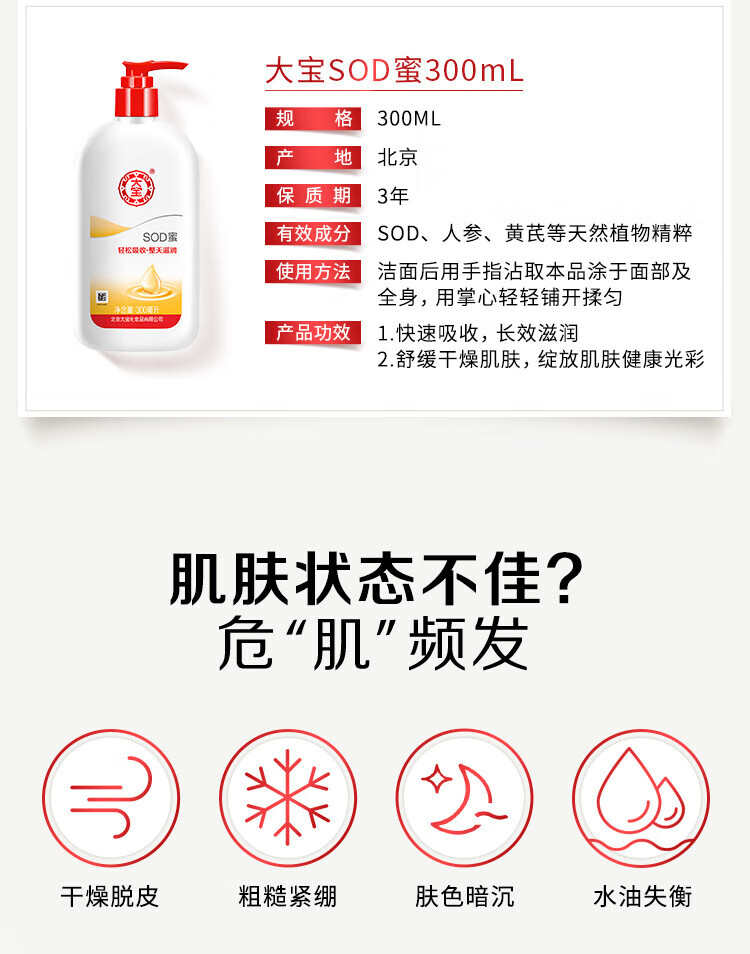 大宝SOD蜜300ml青花香型乳液面霜润肤补水保湿霜护肤品男女士身体乳
