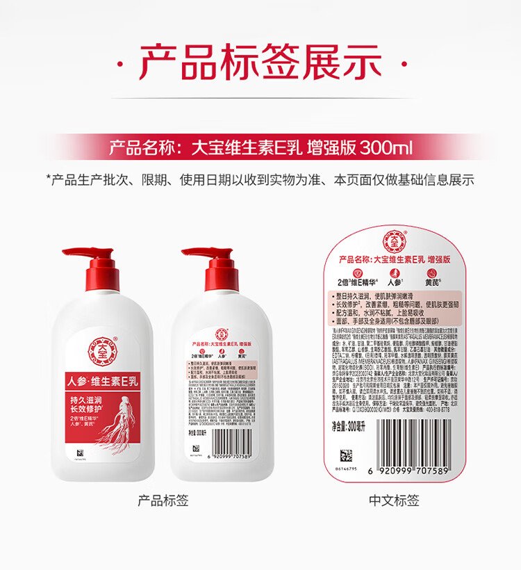 大宝维生素E乳300ml(泵头款)乳液面霜保湿润肤男女士护肤品身体乳