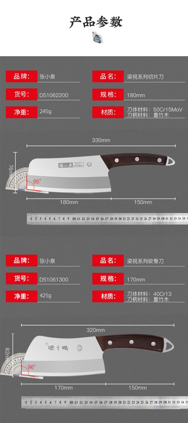 Zhang Xiaoquan Couteau de cuisine Série Butterfly Lovers Couteau de cuisine domestique Couteau à trancher Couteau à découper les os Couteau à trancher en acier inoxydable de cuisine