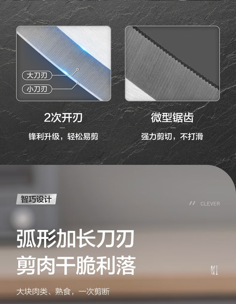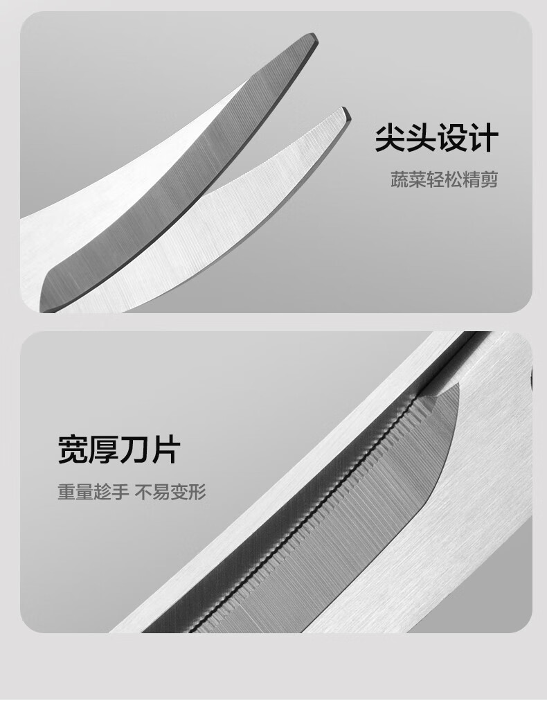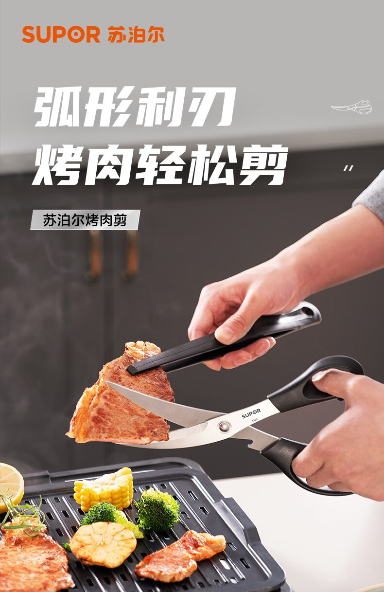 SUPOR Ciseaux de barbecue, ciseaux de cuisine, ciseaux multifonctions, ciseaux à os de poulet en acier inoxydable, coupe-poisson, ciseaux de fruits de mer ménagers, ciseaux multifonctions, lame incurvée KE09P2