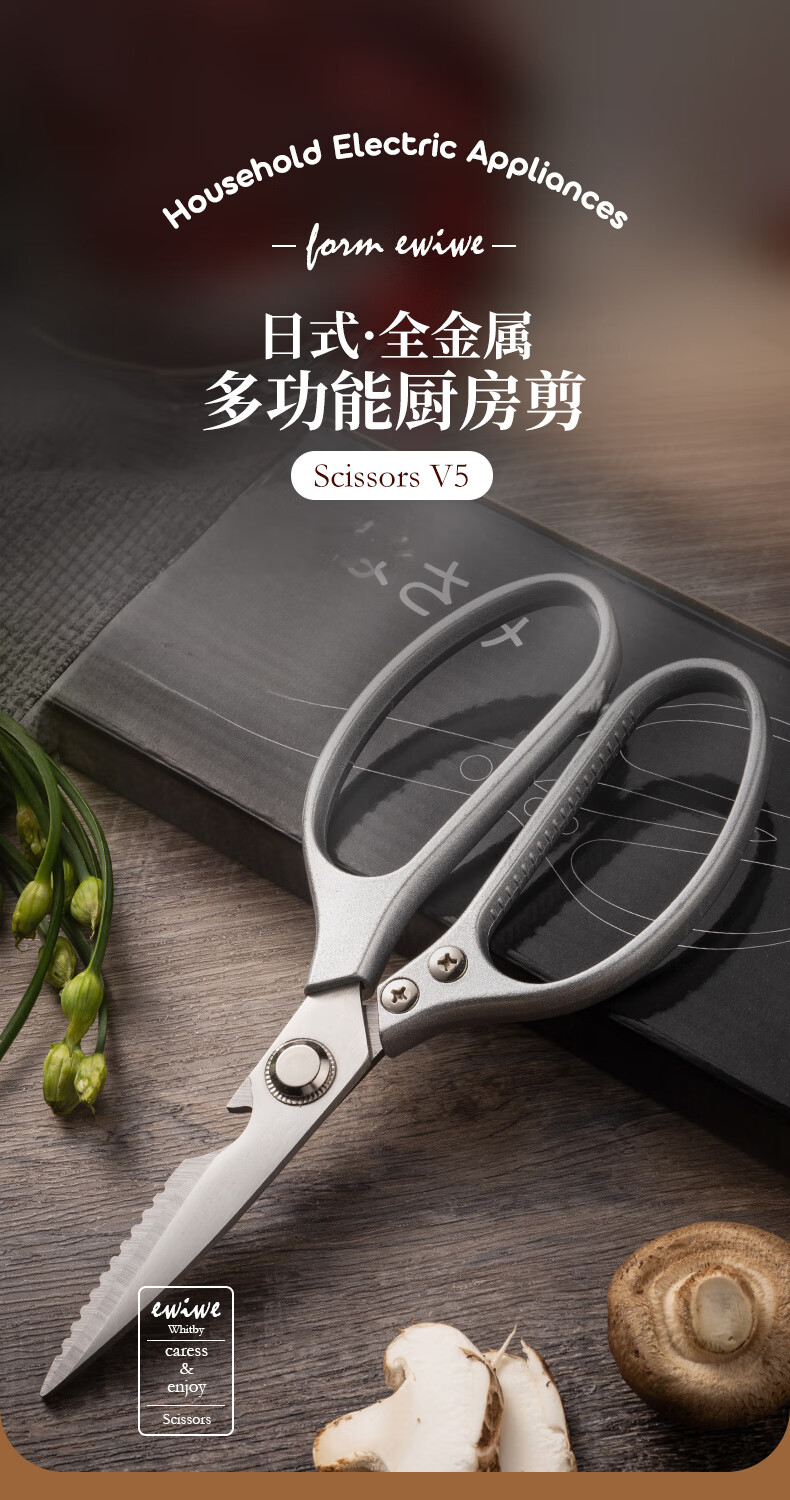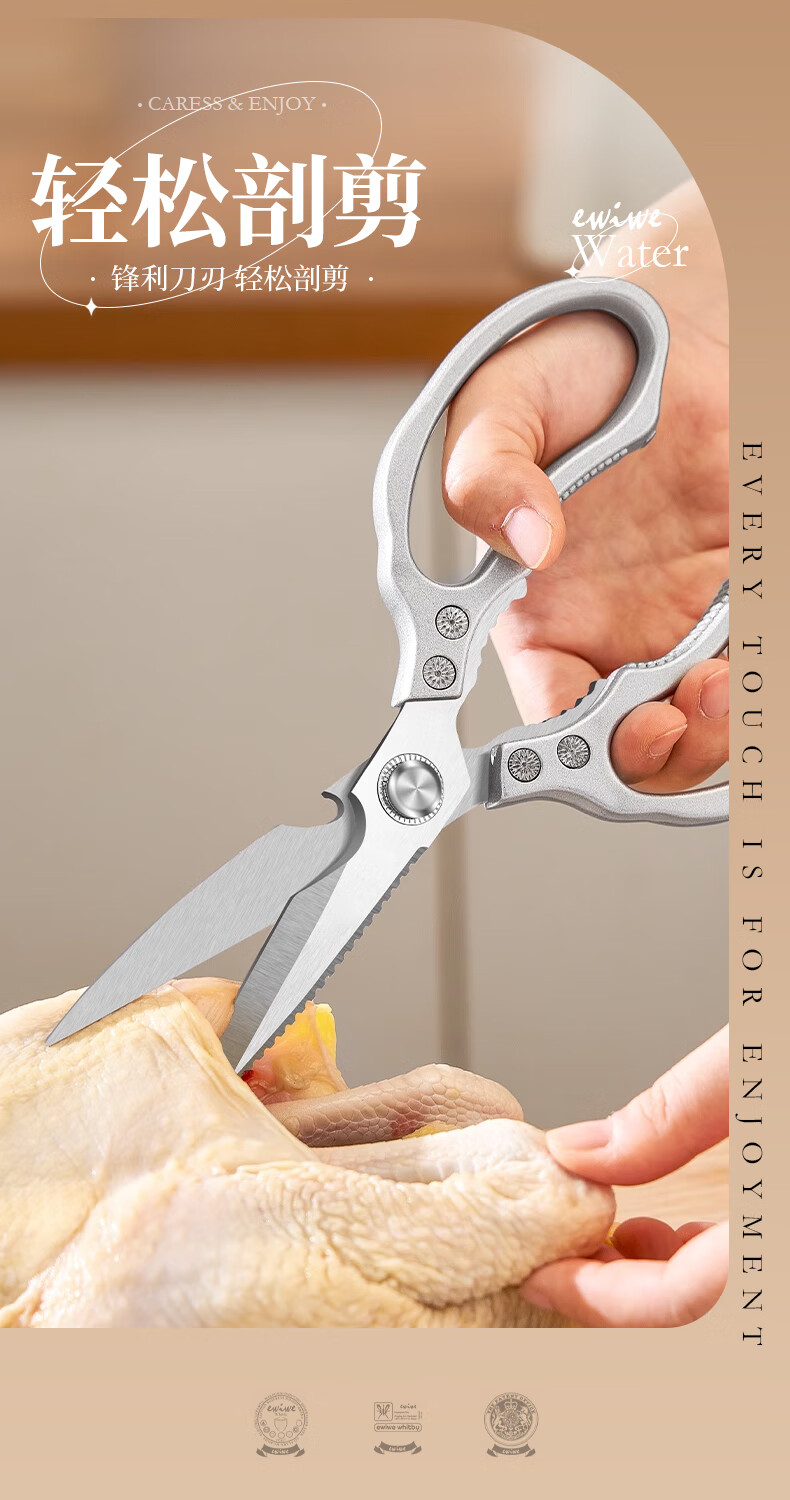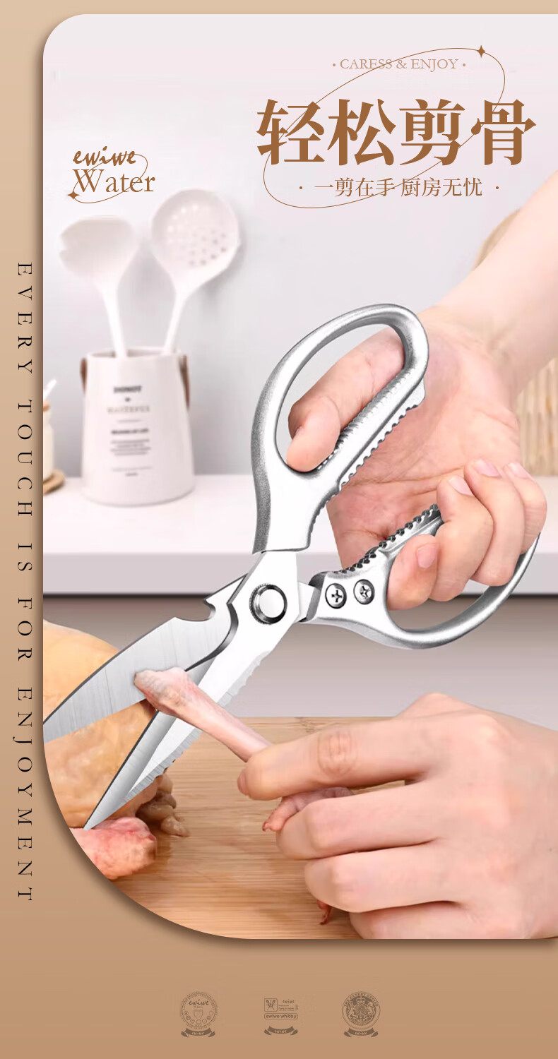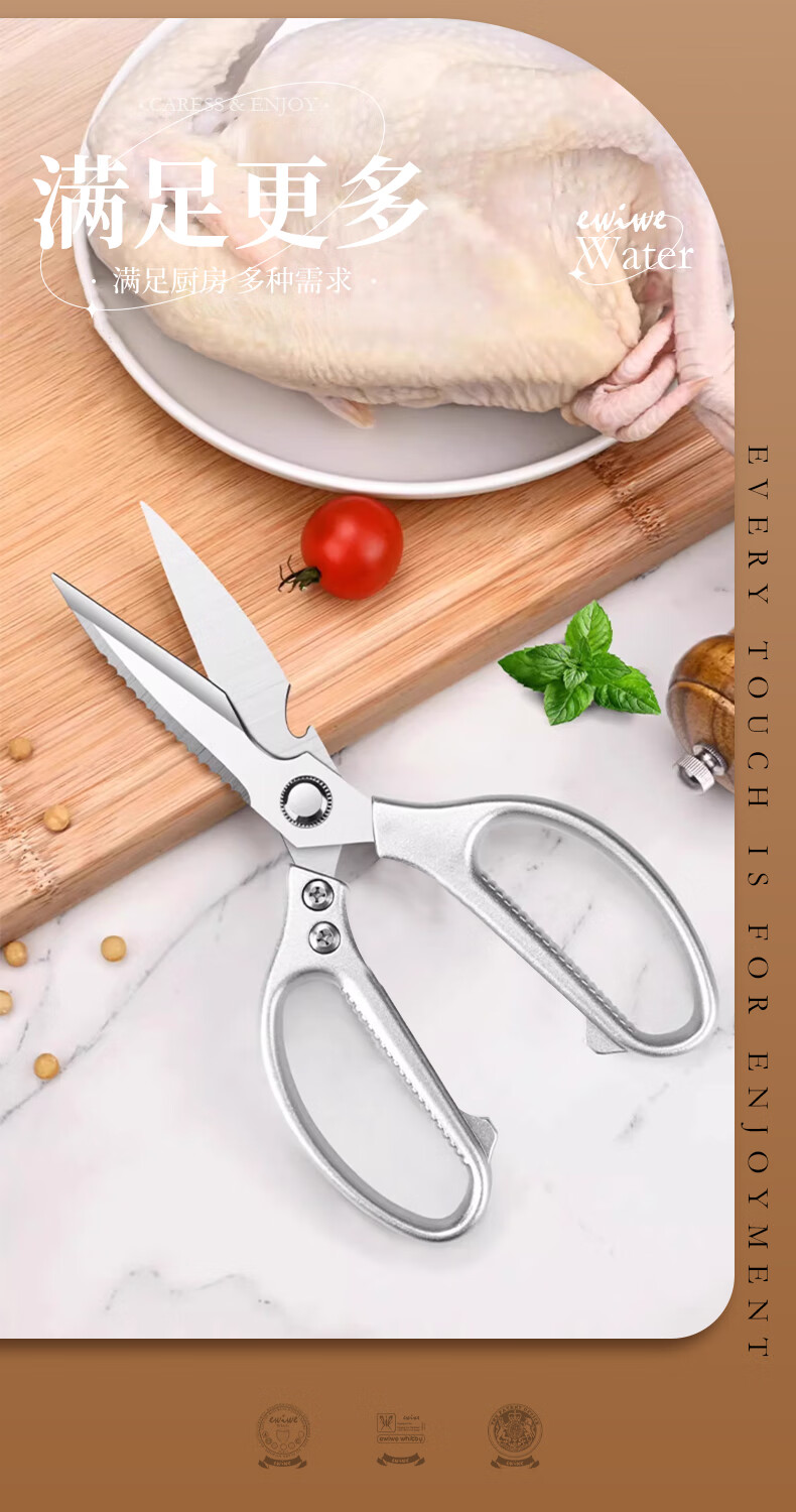 EWIWE multifunctional kitchen scissors, household fish-killing powerful chicken bone scissors for barbecue, stainless steel sharp food scissors, Japanese silver/full metal material/gift box