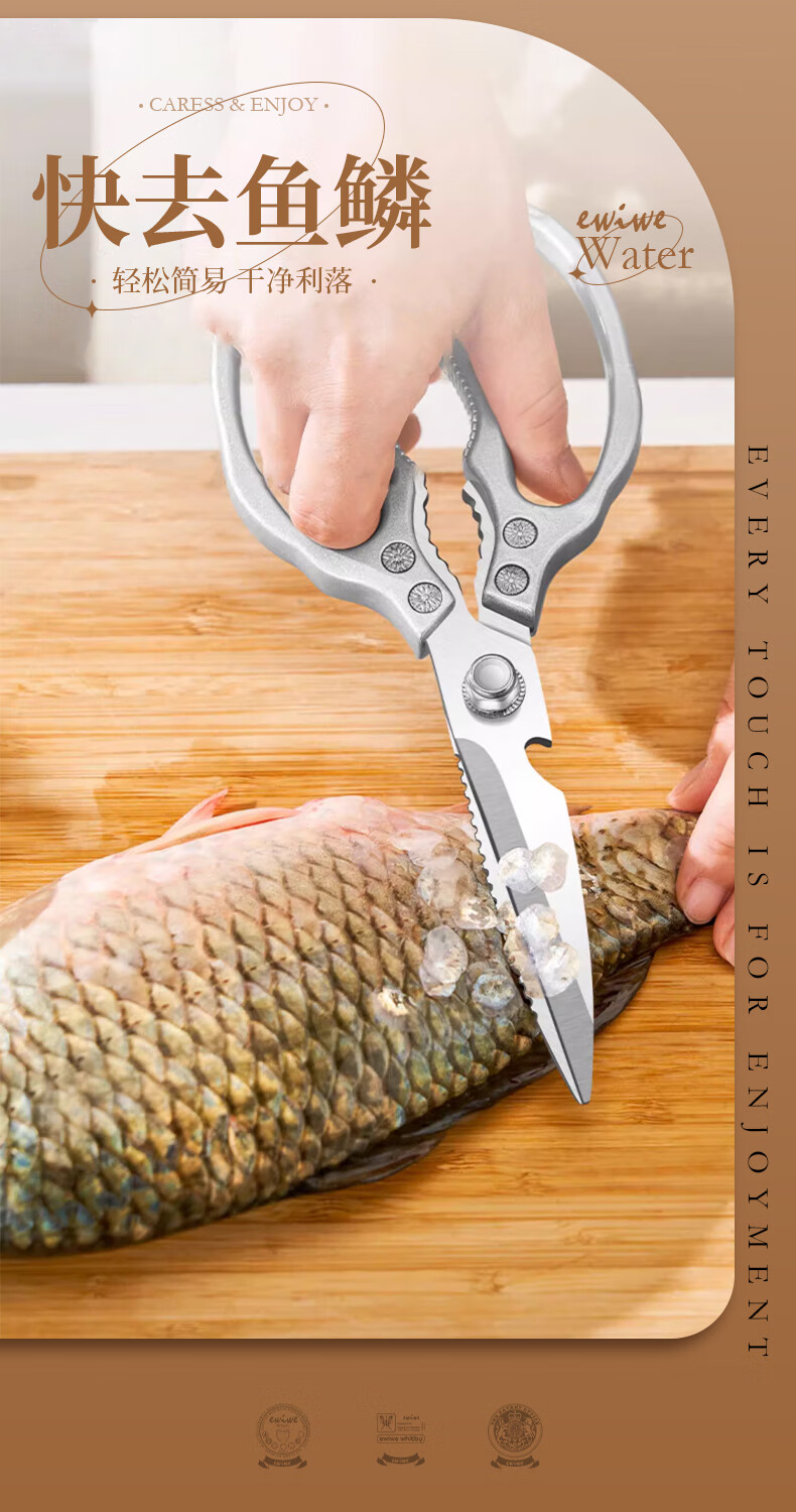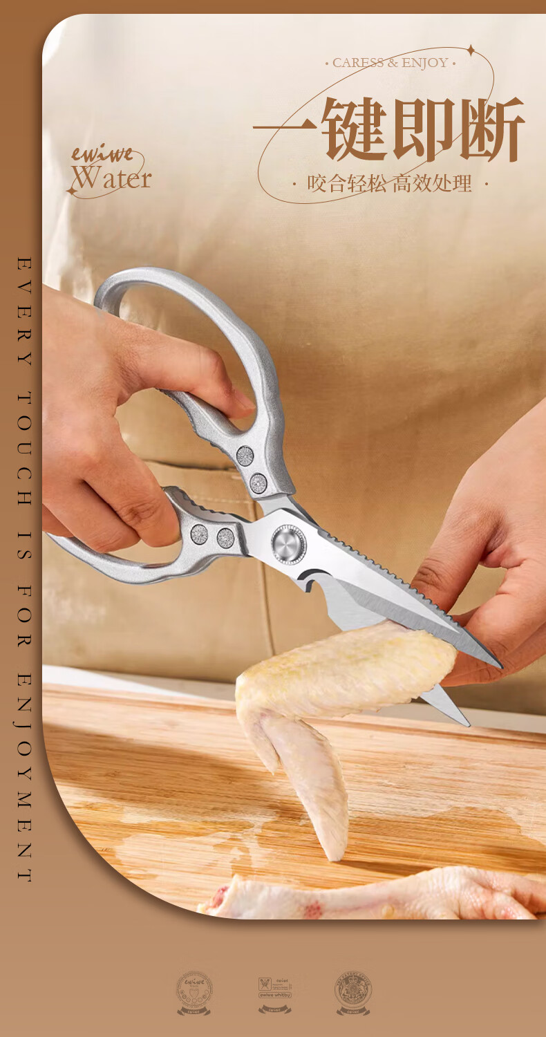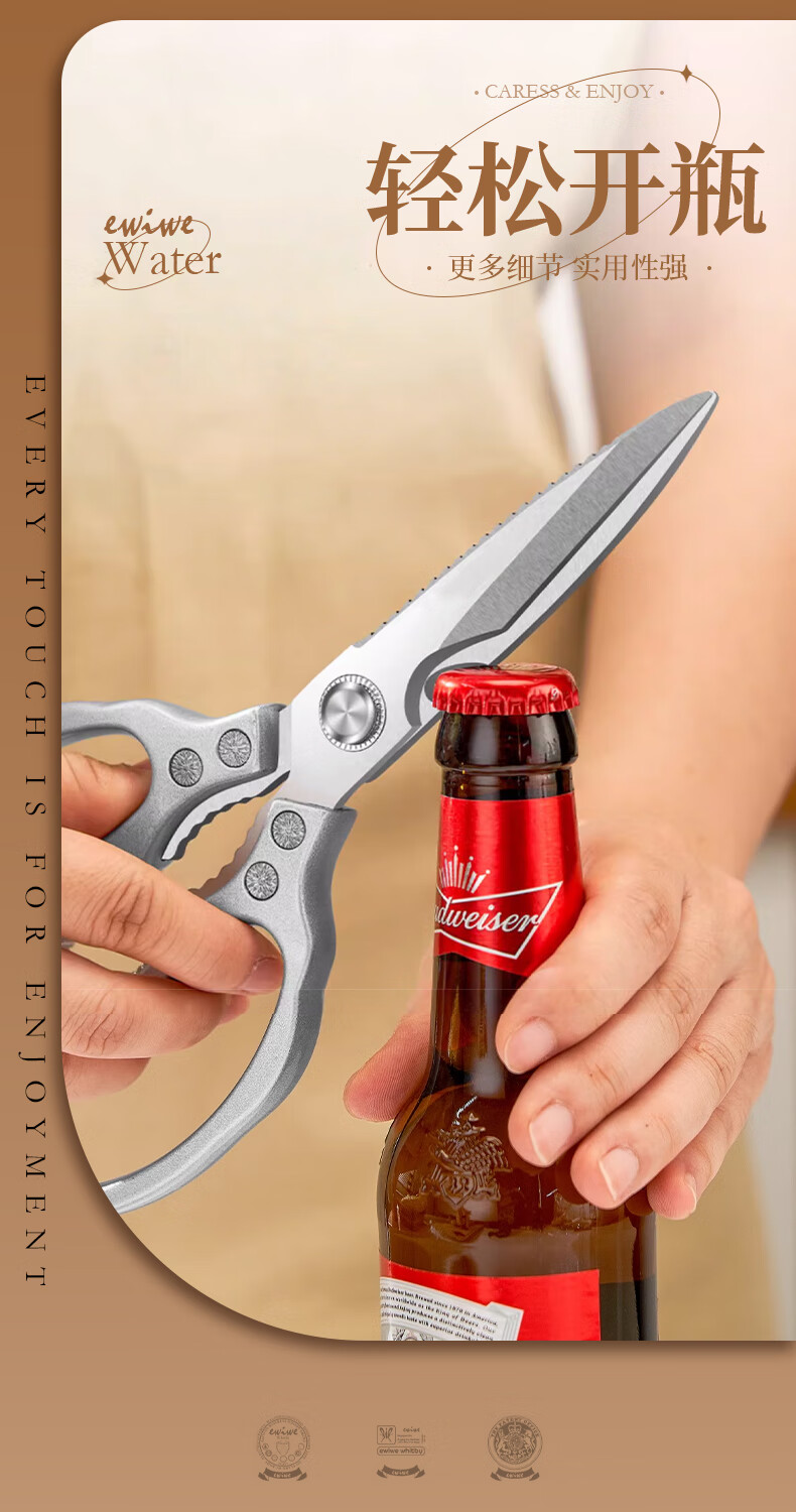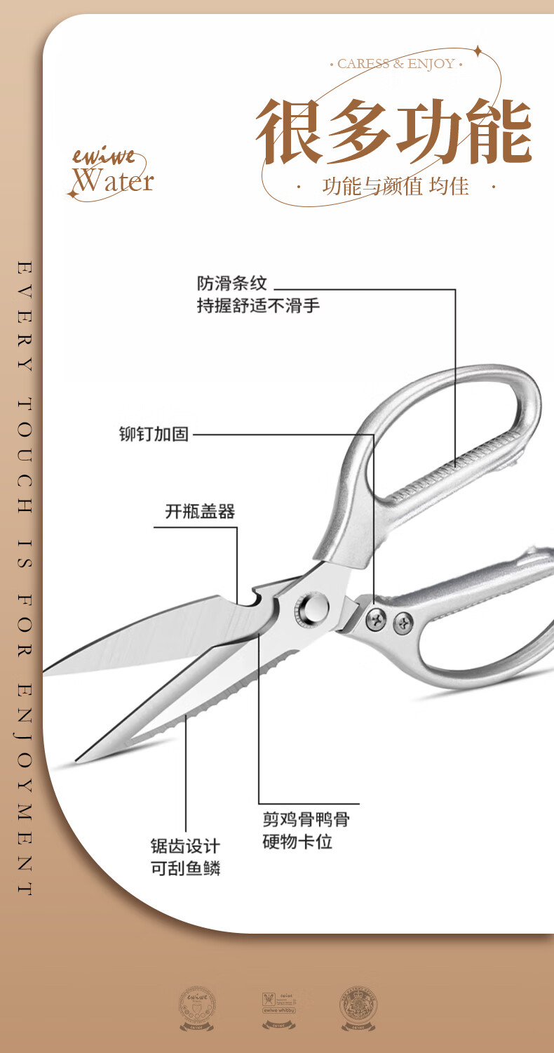 EWIWE multifunctional kitchen scissors, household fish-killing powerful chicken bone scissors for barbecue, stainless steel sharp food scissors, Japanese silver/full metal material/gift box