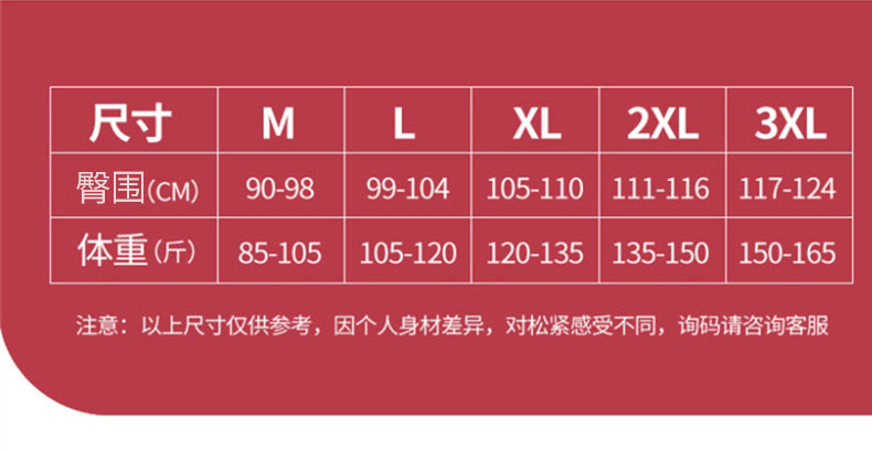 Size M (42.5-52.5kg),L (52.5-60kg),XL (60-67.5kg),2XL (67.5-75kg),3XL (75-82.5kg)