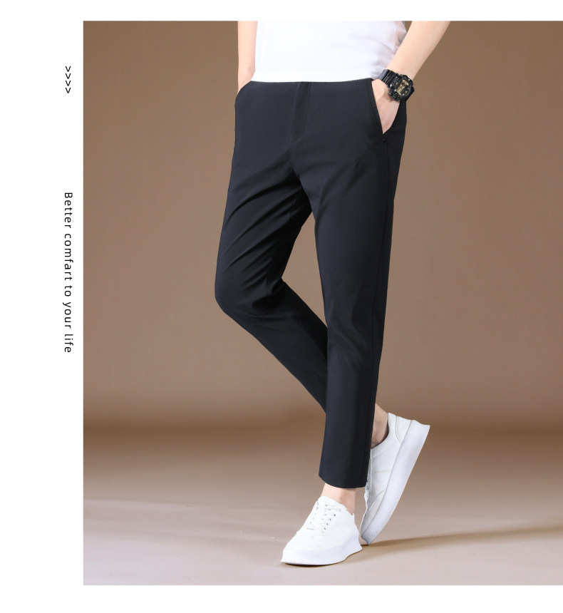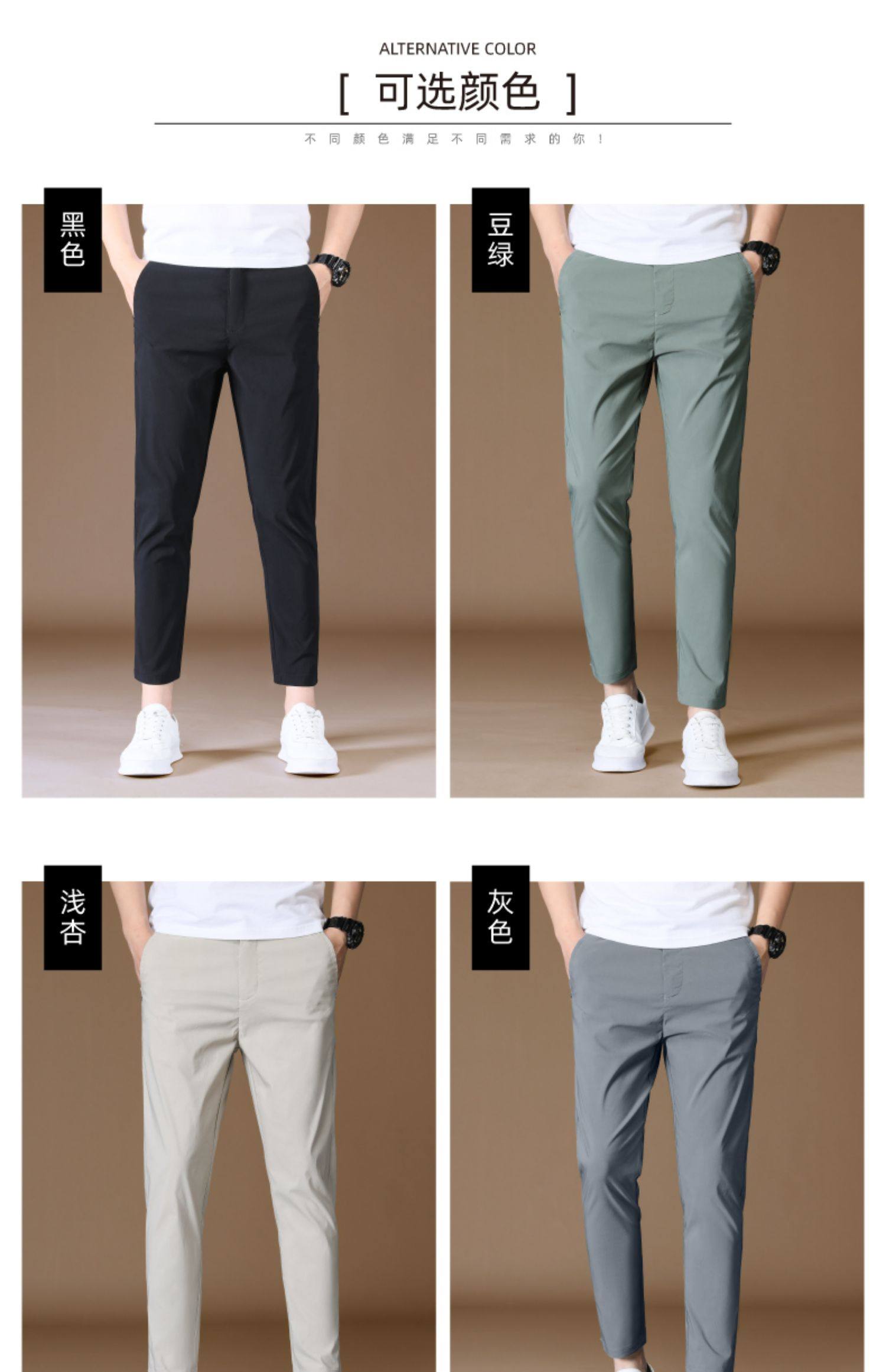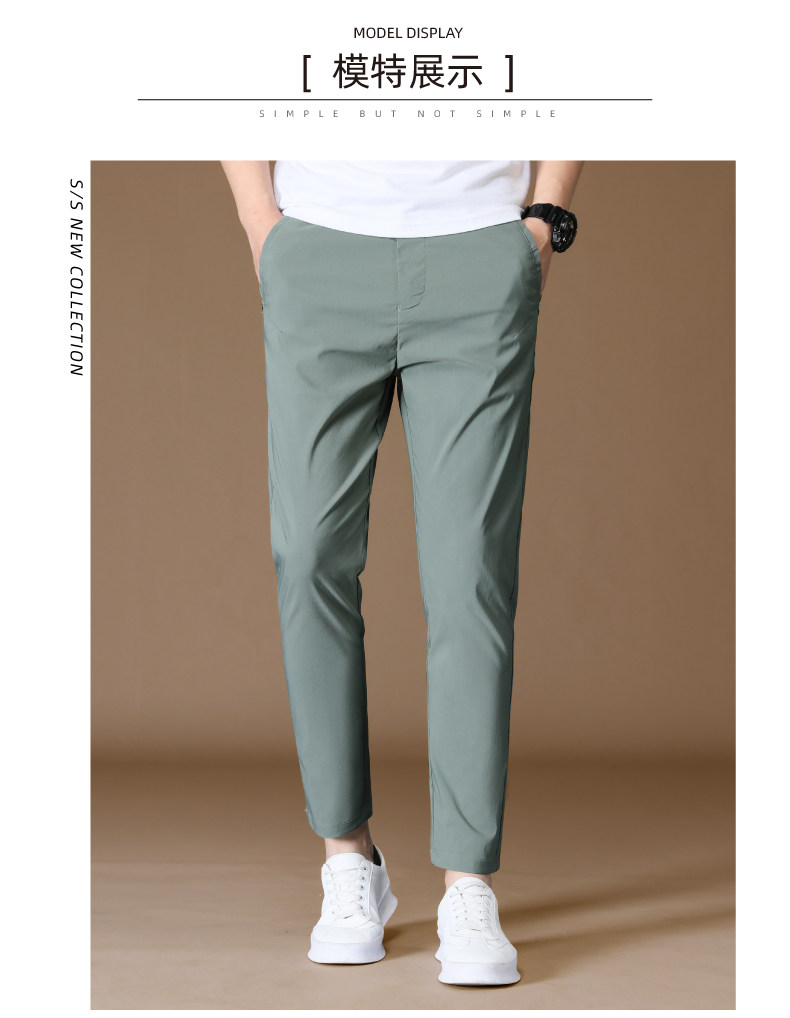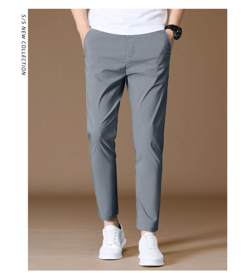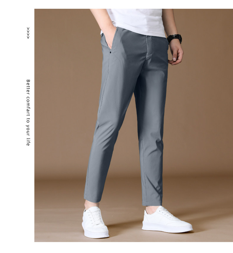 Pantalones de nueve puntos de seda de hielo para hombres europeos pantalones casuales de corte delgado y delgado de verano para pies pequeños pantalones de vestir cómodos y versátiles sin plancha