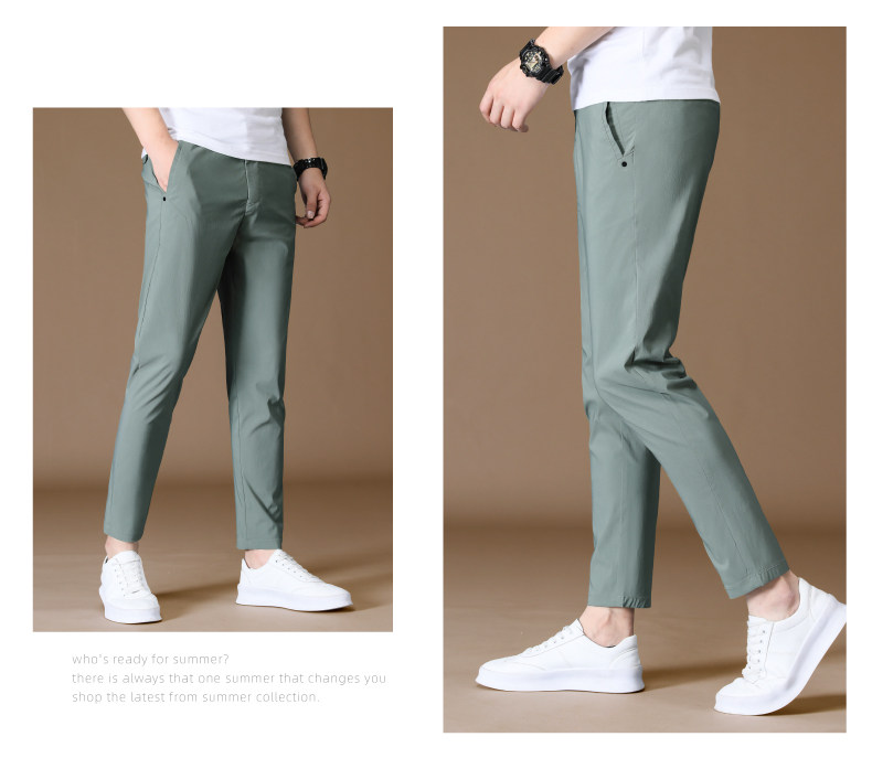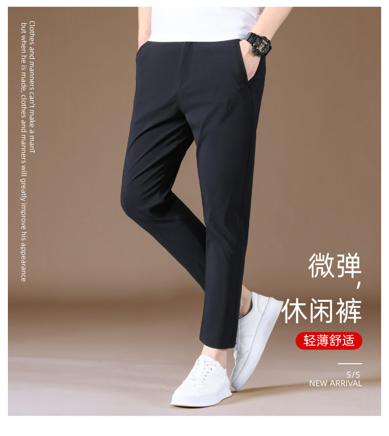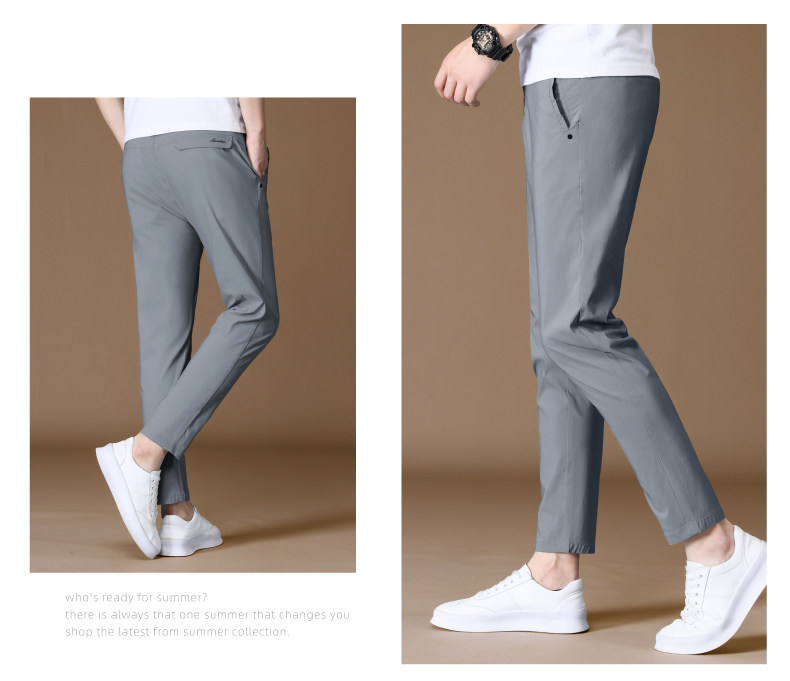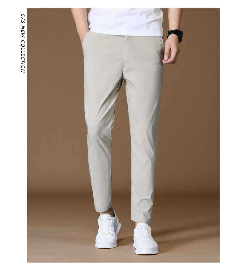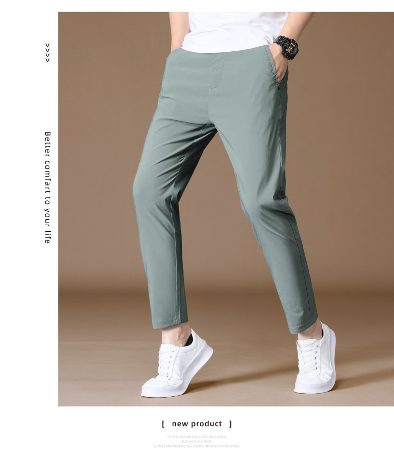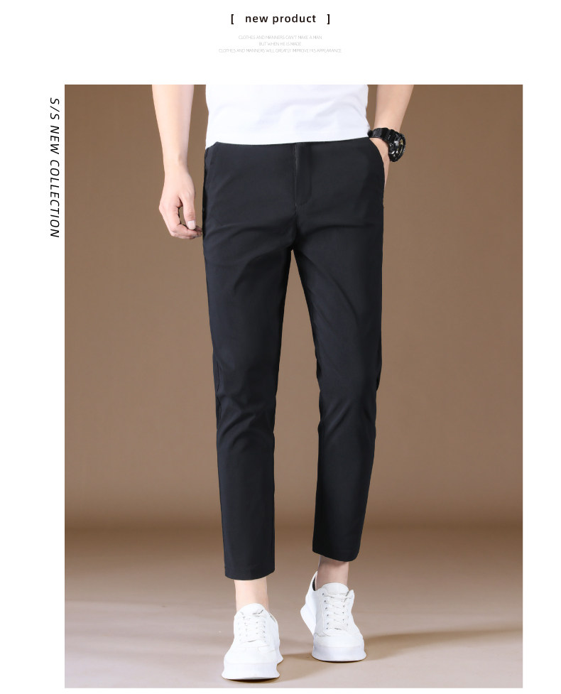 Pantalones de nueve puntos de seda de hielo para hombres europeos pantalones casuales de corte delgado y delgado de verano para pies pequeños pantalones de vestir cómodos y versátiles sin plancha