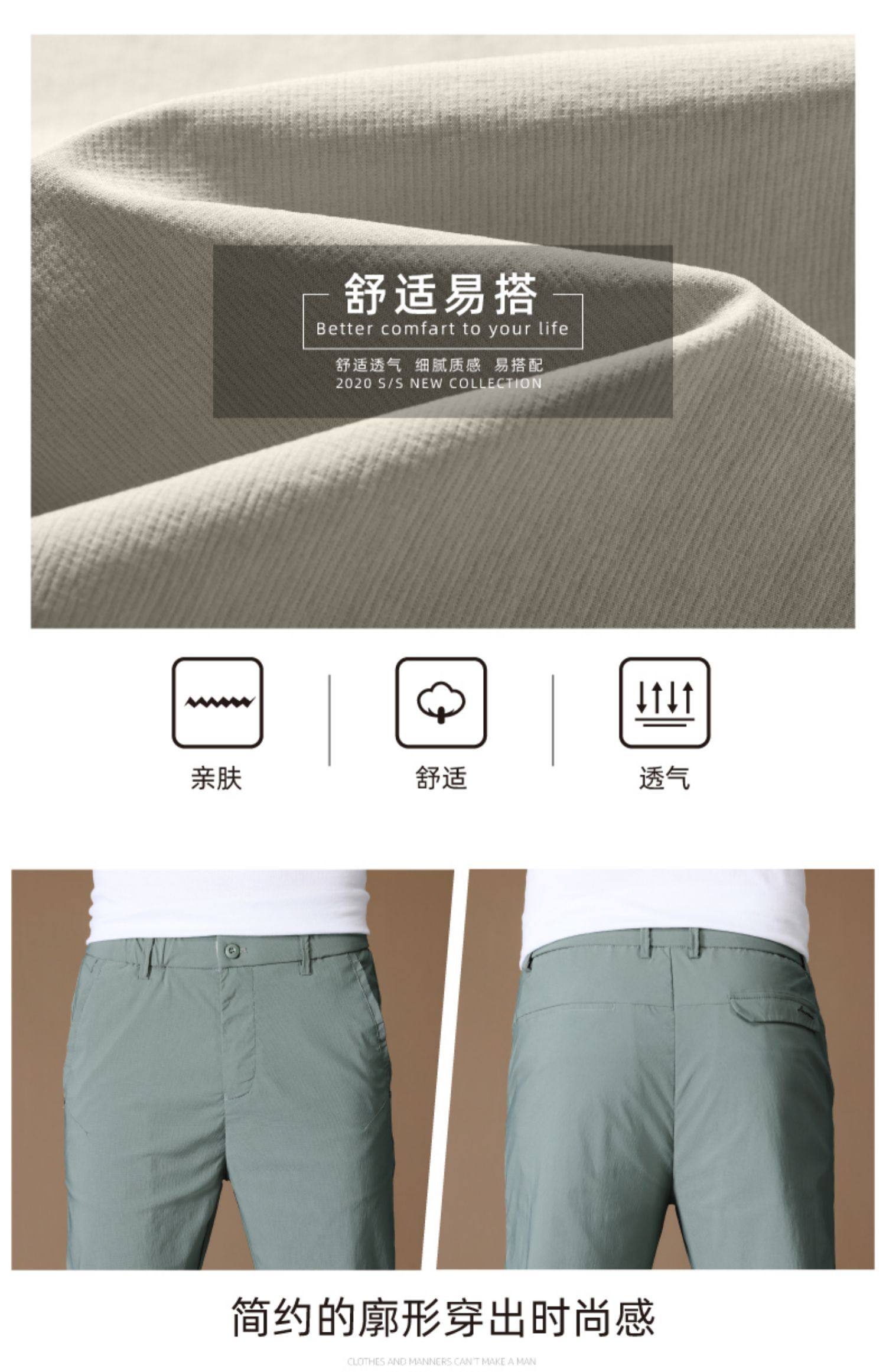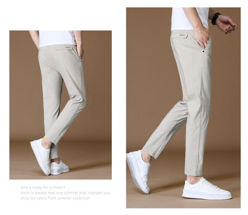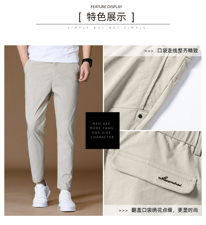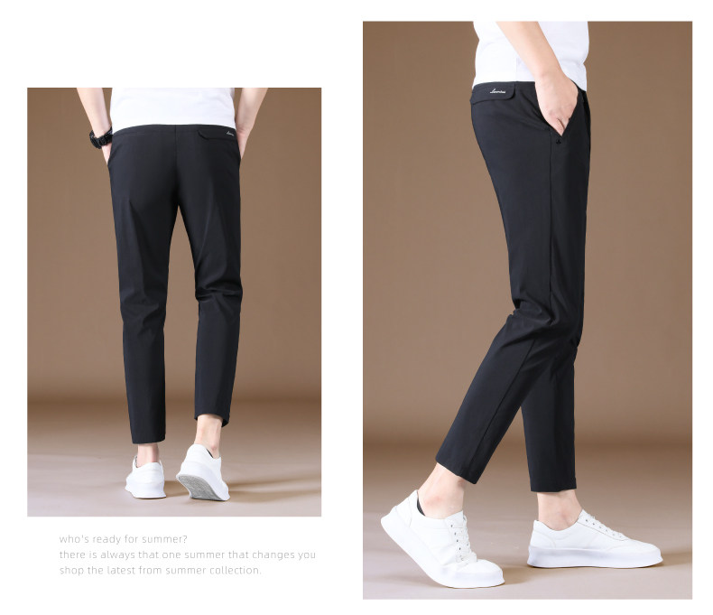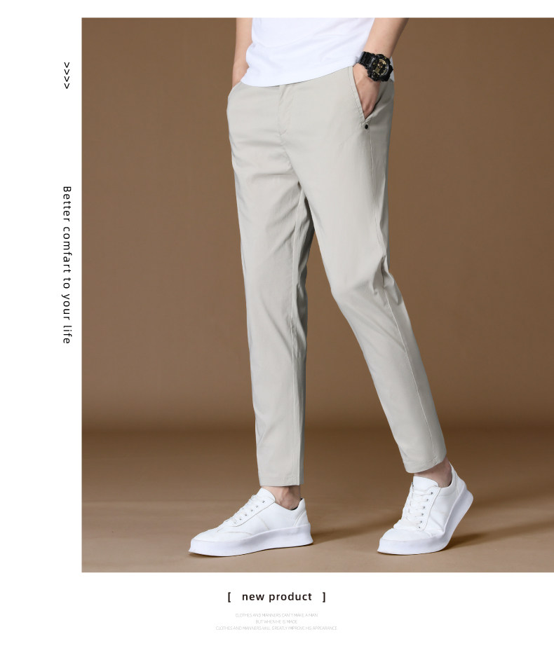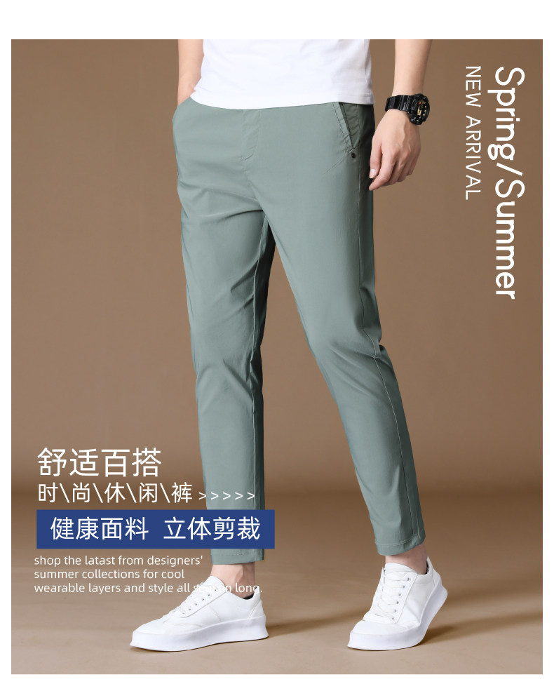 Pantalones de nueve puntos de seda de hielo para hombres europeos pantalones casuales de corte delgado y delgado de verano para pies pequeños pantalones de vestir cómodos y versátiles sin plancha