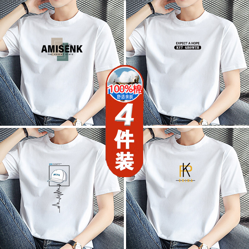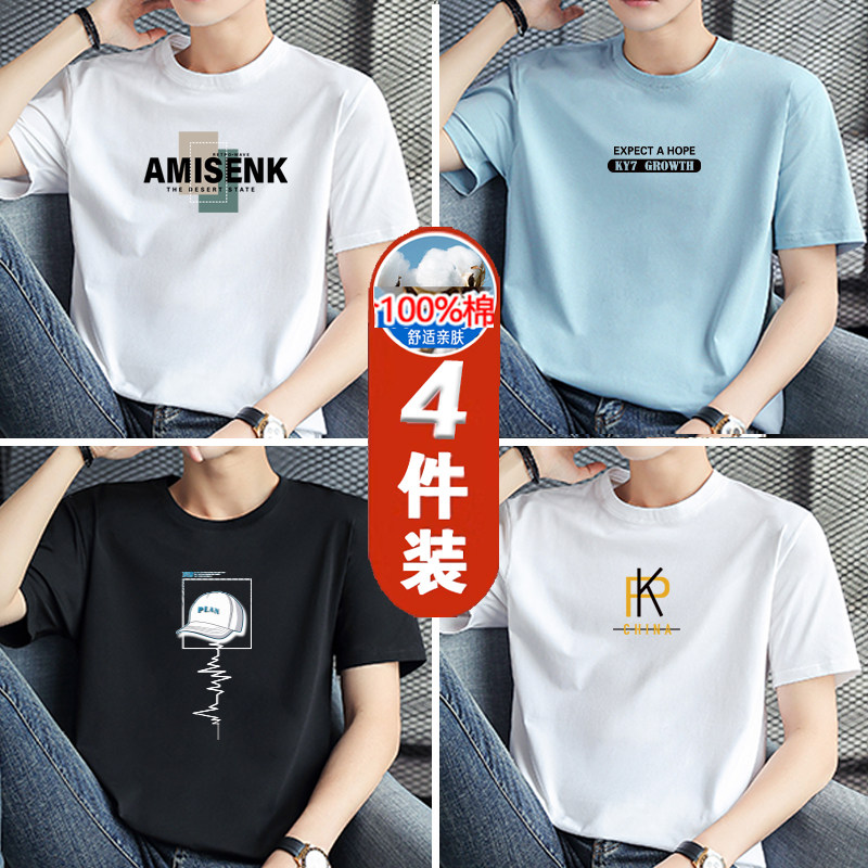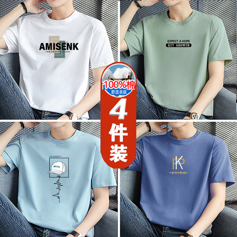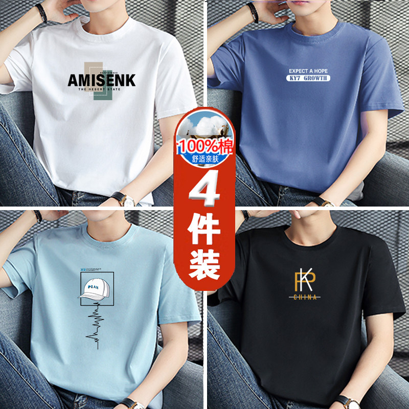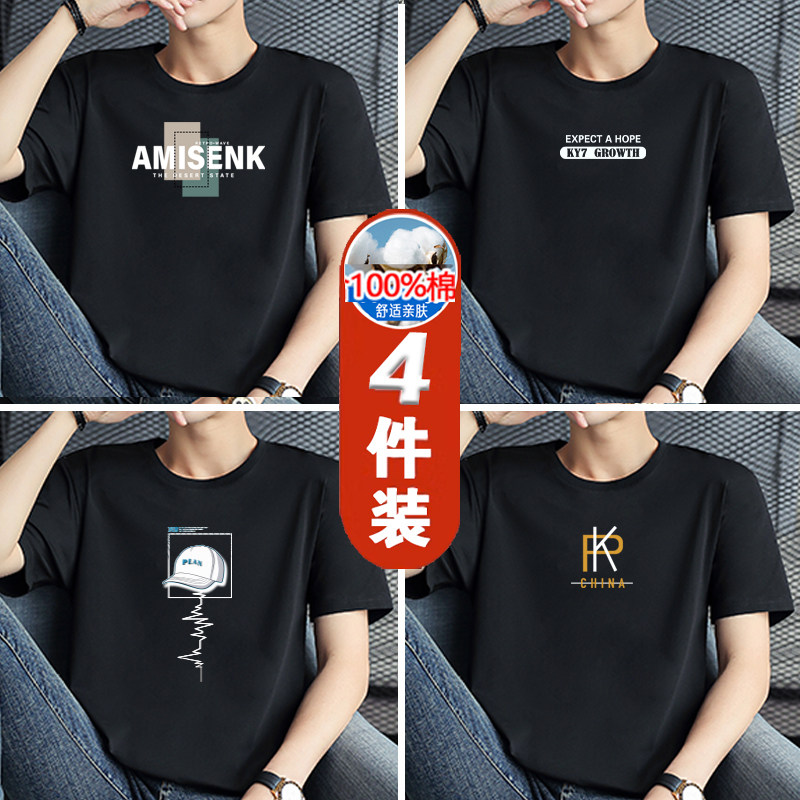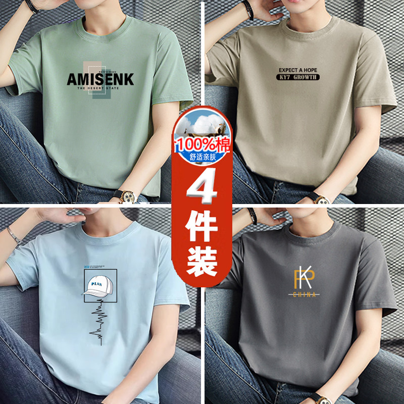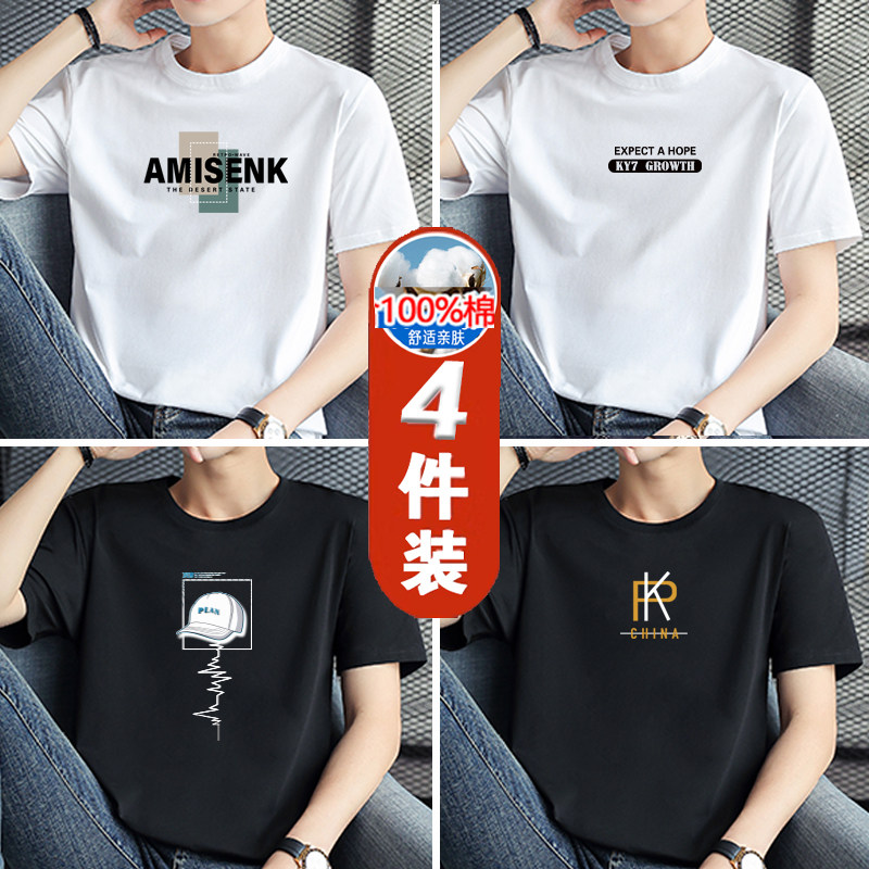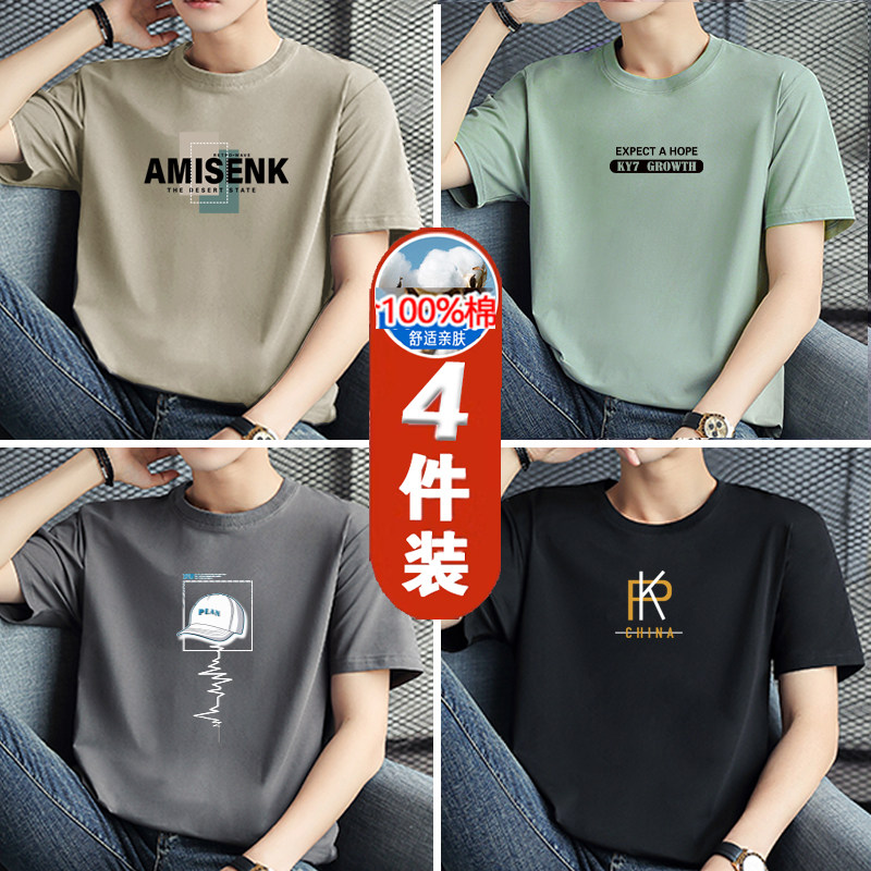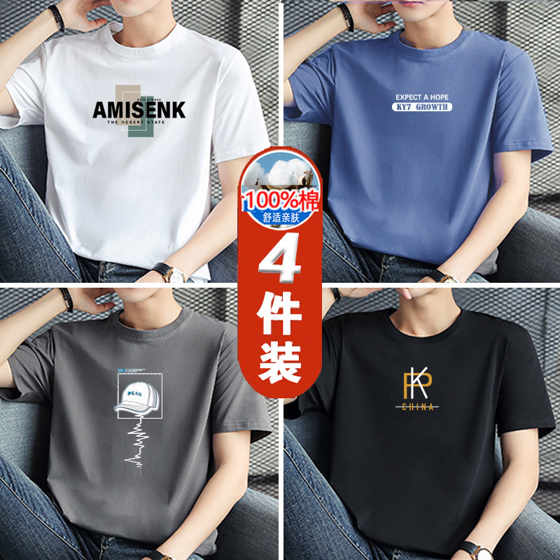 4 штуки]Модные мужские футболки из чистого хлопка с коротким рукавом, свободные и универсальные рубашки с коротким рукавом, летние повседневные базовые рубашки.