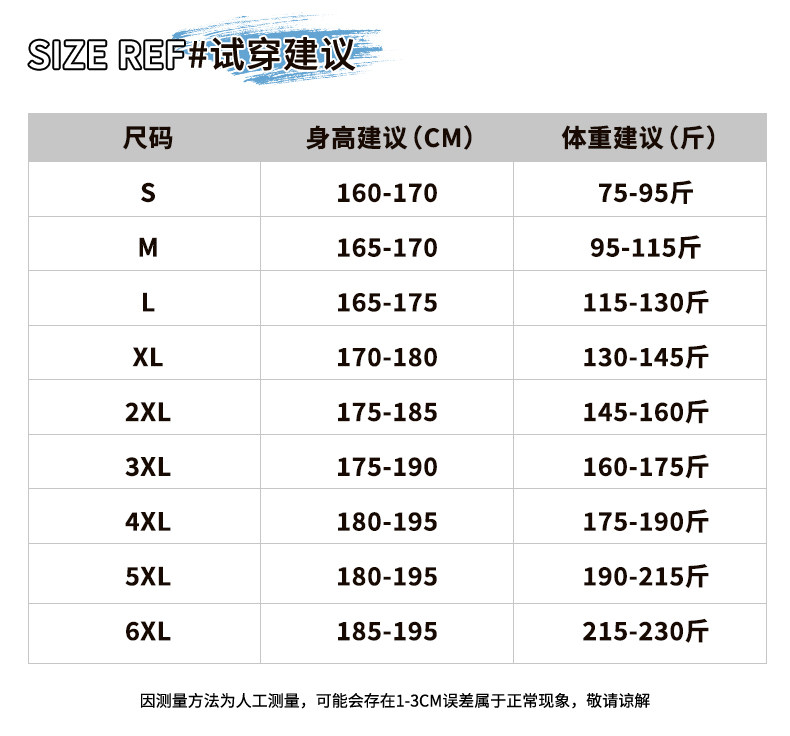 Размер S-код[Подходит для: 37.5-47.5kg],М код[Подходит для: 47.5-57.5kg],Размер L[Подходит для: 57.5-67.5kg],размер XL[Подходит для: 67.5-72.5kg],размер 2XL[Подходит для: 72.5-80kg],размер 3XL[Подходит для: 80-87.5kg],размер 4XL[Подходит для: 87.5-97.5kg],размер 5XL[Подходит для: 97.5-107.5kg],размер 6XL[Подходит для: 105-115kg]