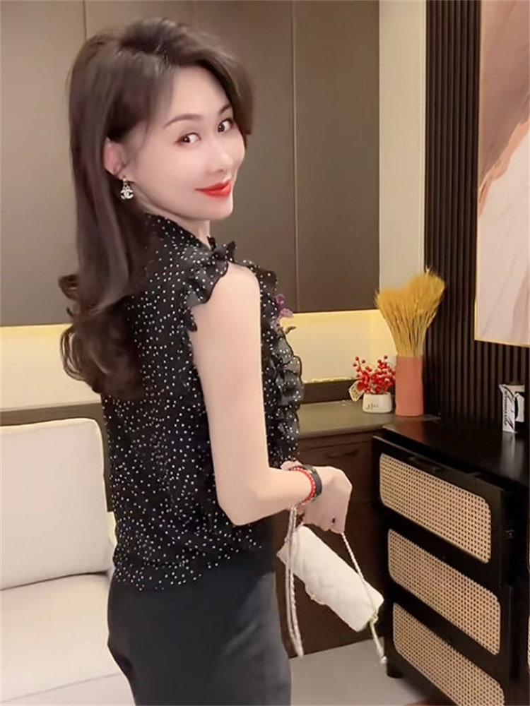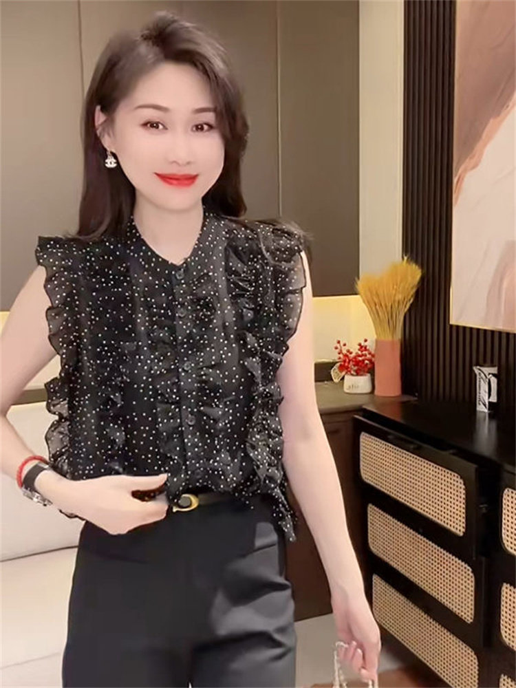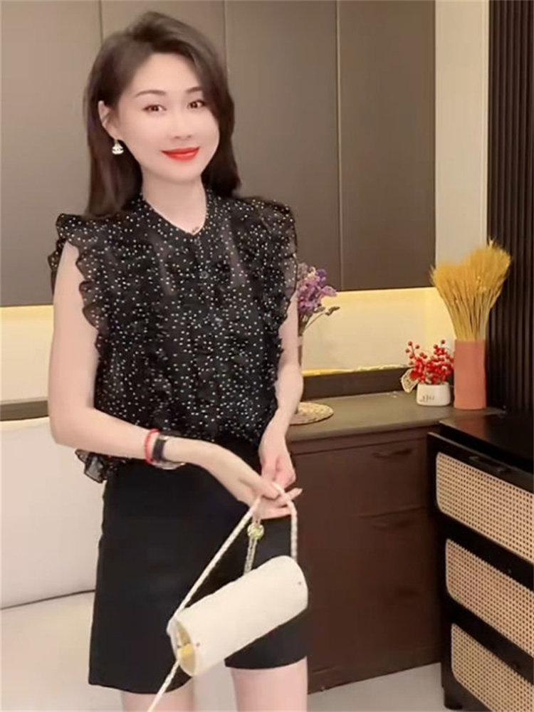 2025 nueva camisa de gasa con estampado de lunares de verano con diseño de hongo mangas voladoras con volantes camisa reductora de edad para mujer