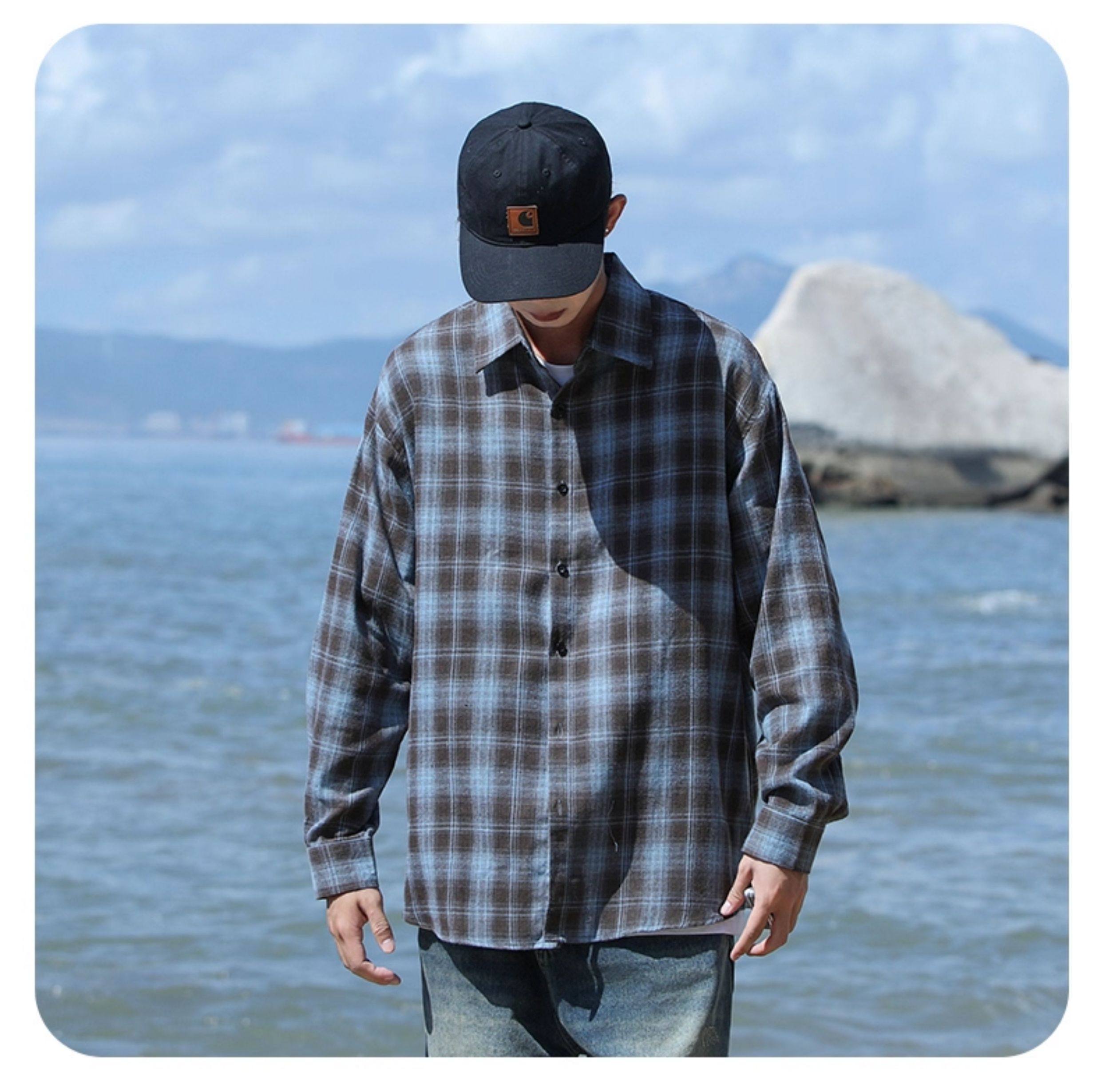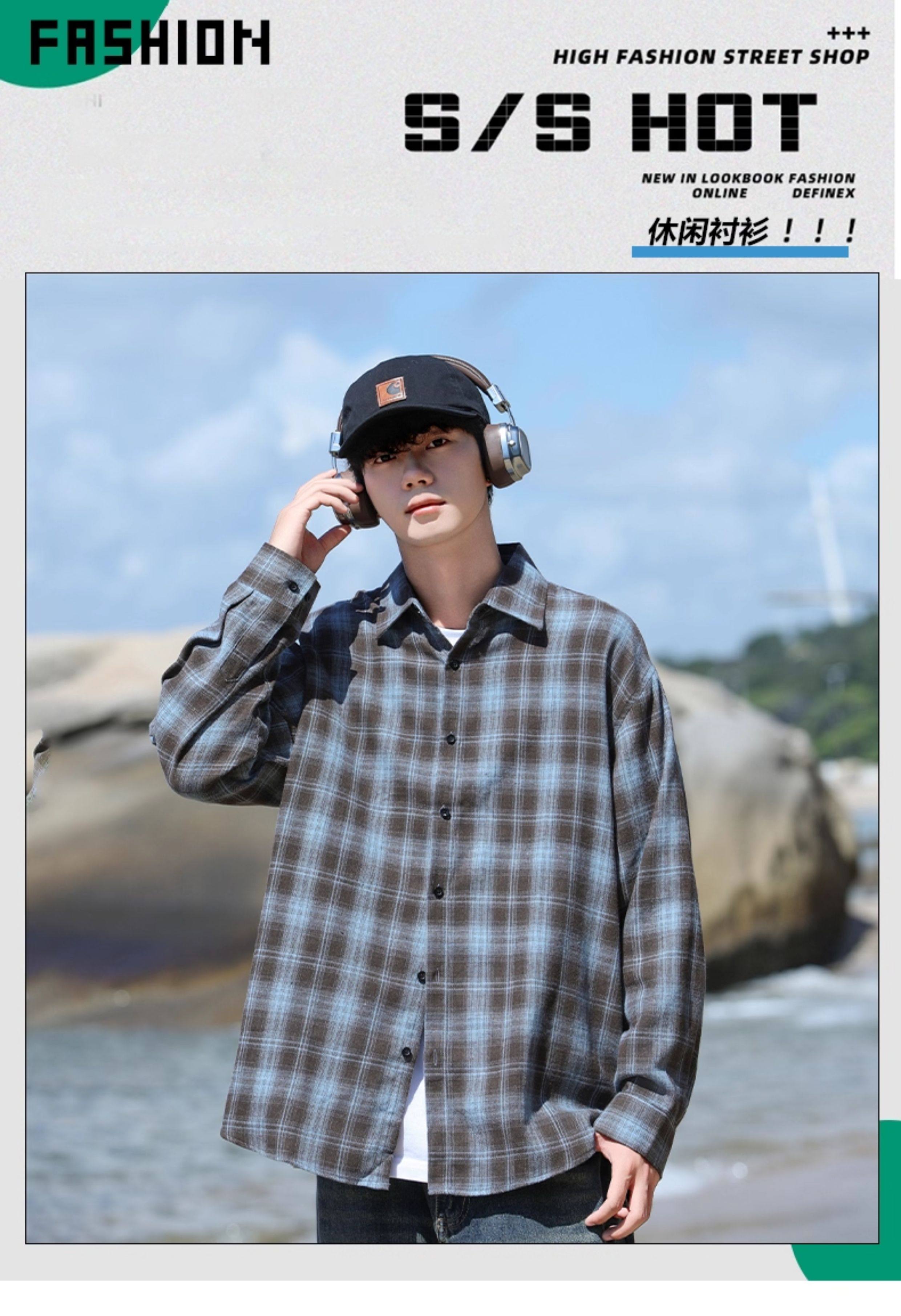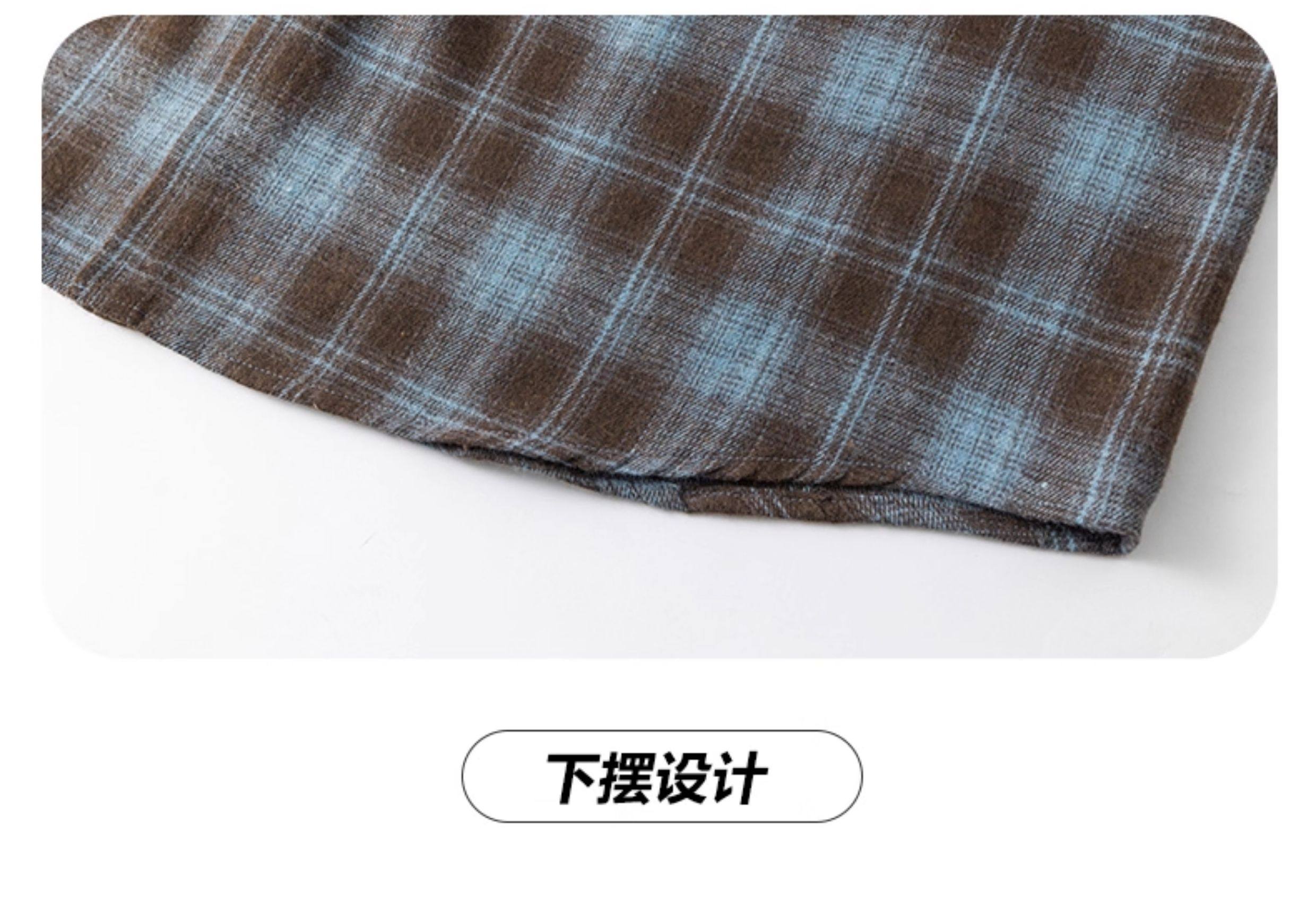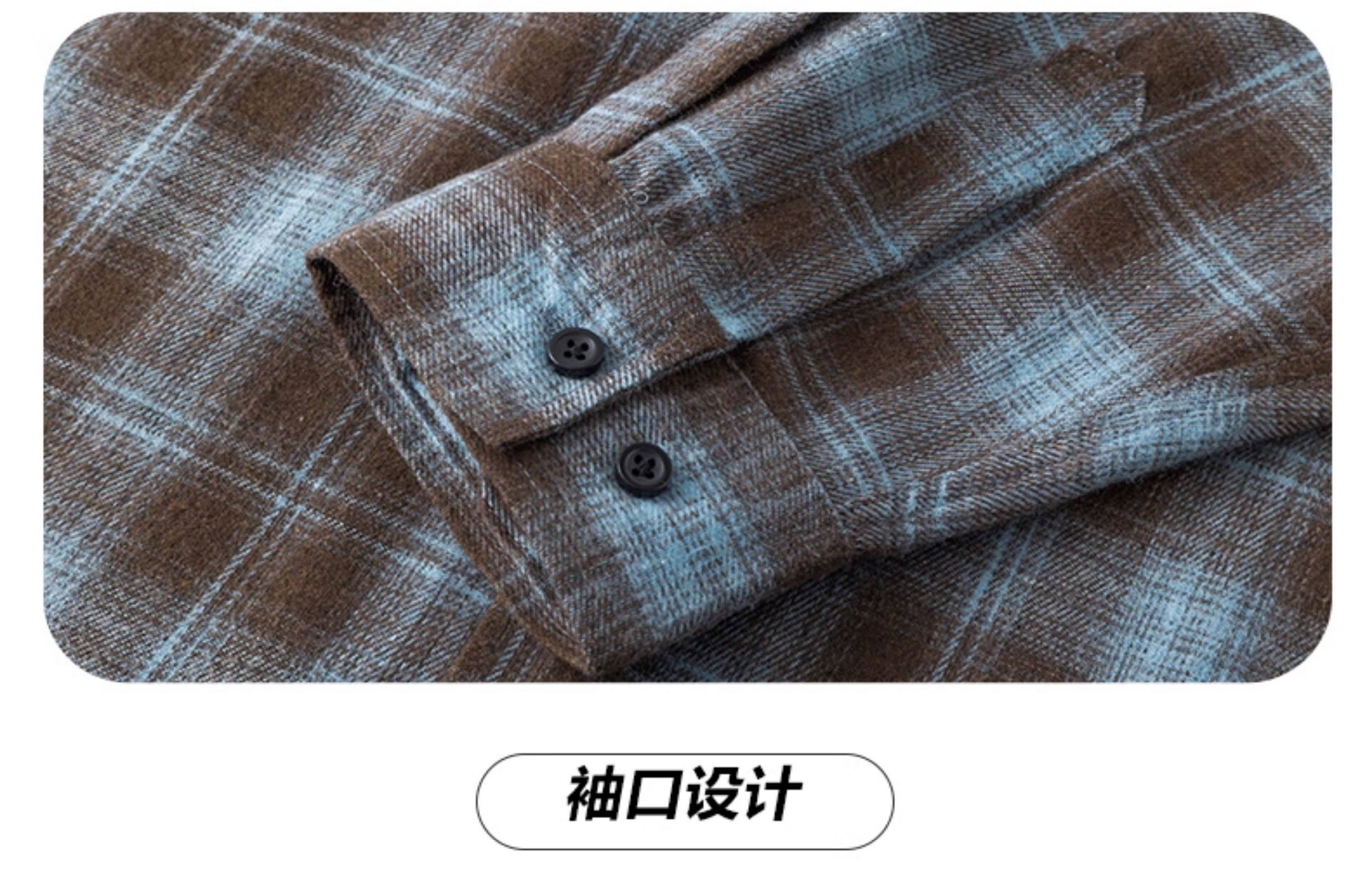 真维斯藏青色格子衬衫男长袖春秋防晒美式宽松格纹磨毛衬衣外套潮