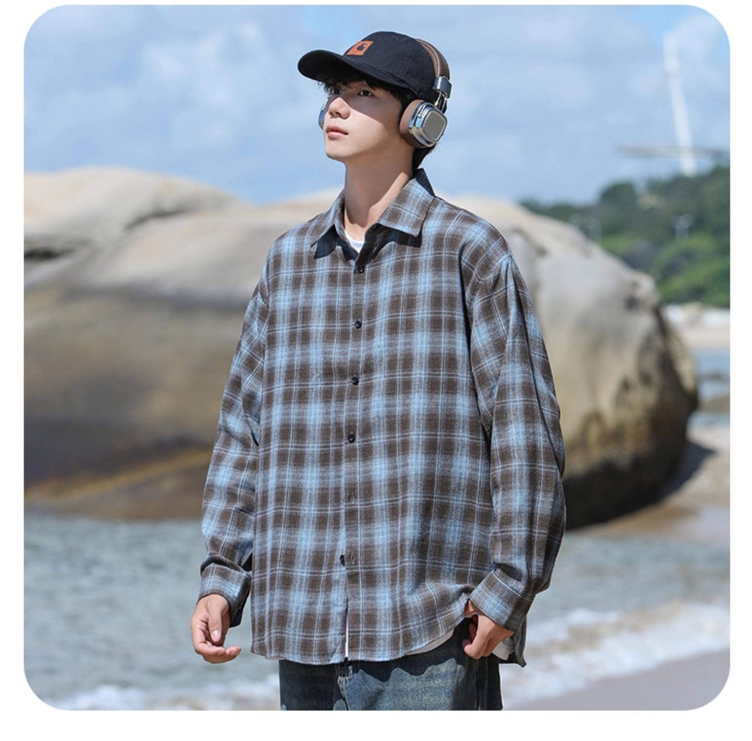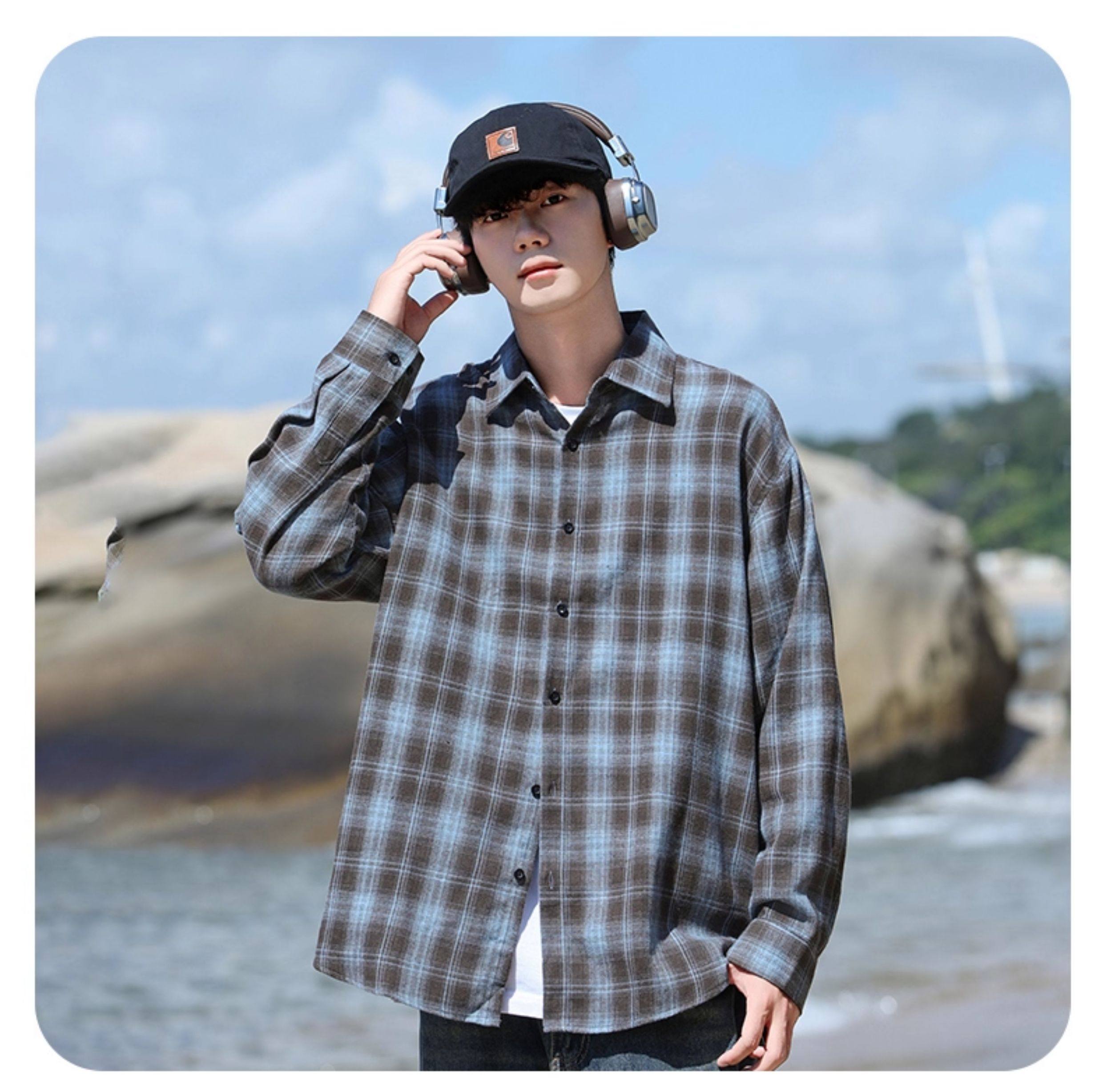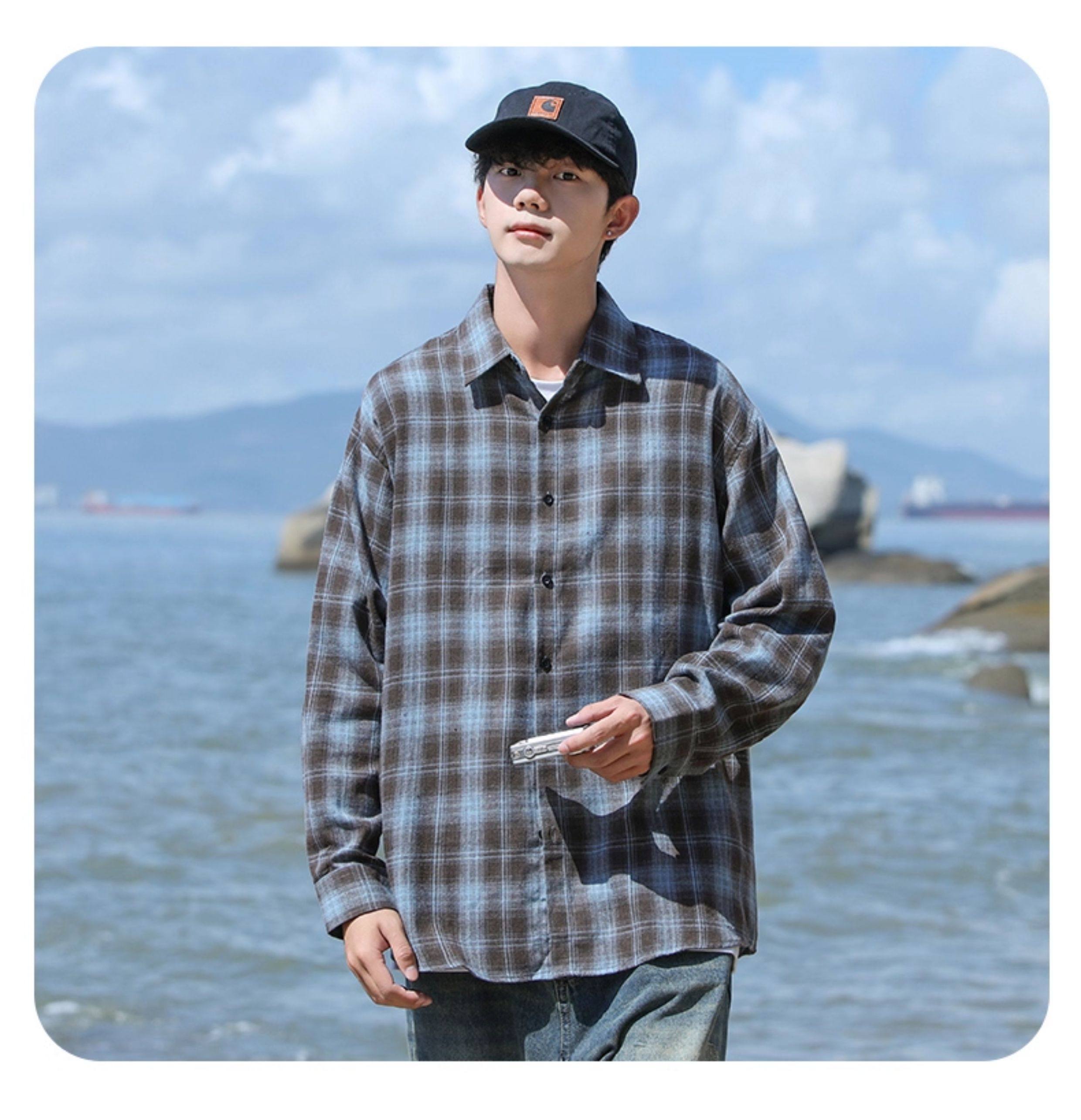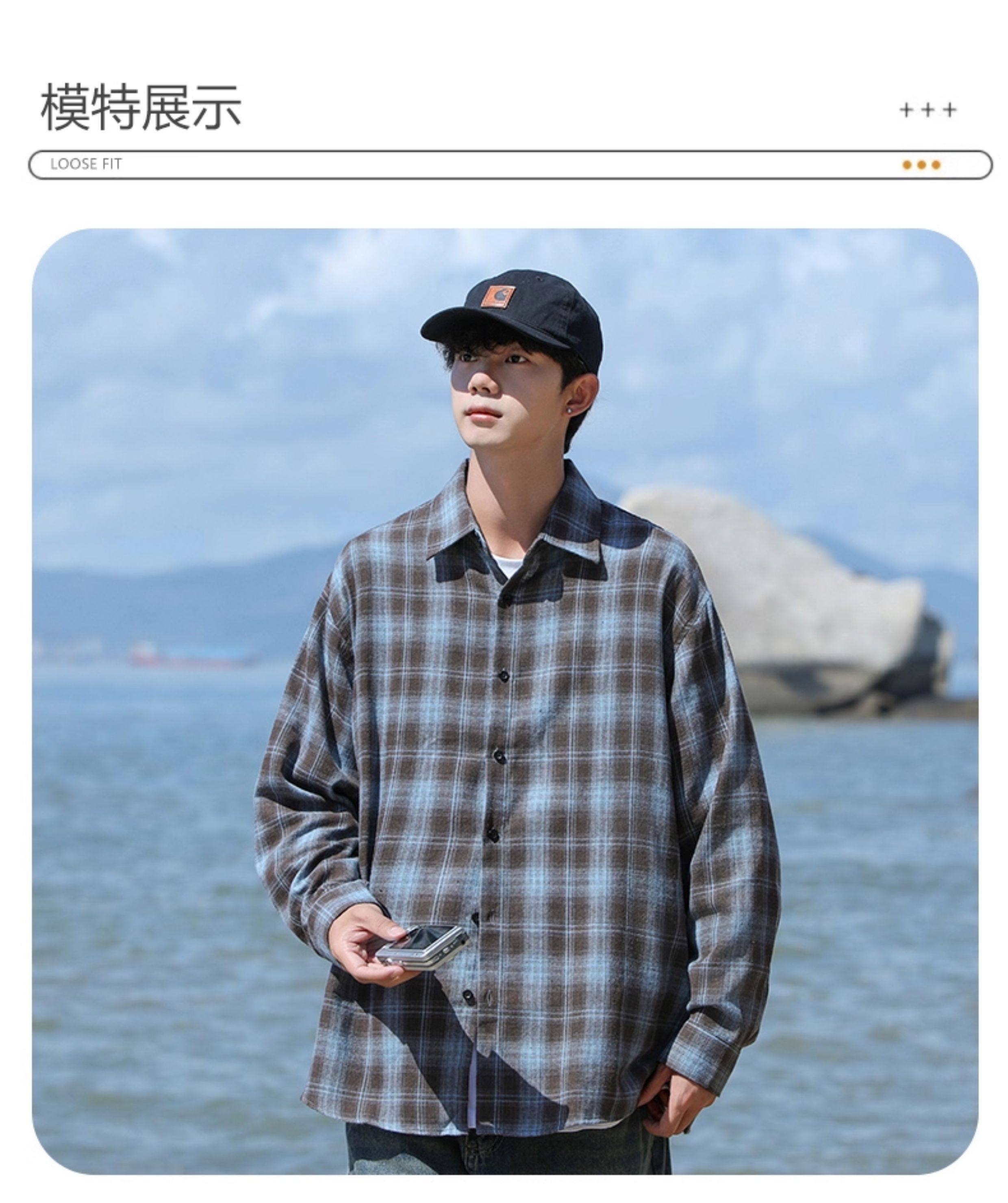 真维斯藏青色格子衬衫男长袖春秋防晒美式宽松格纹磨毛衬衣外套潮