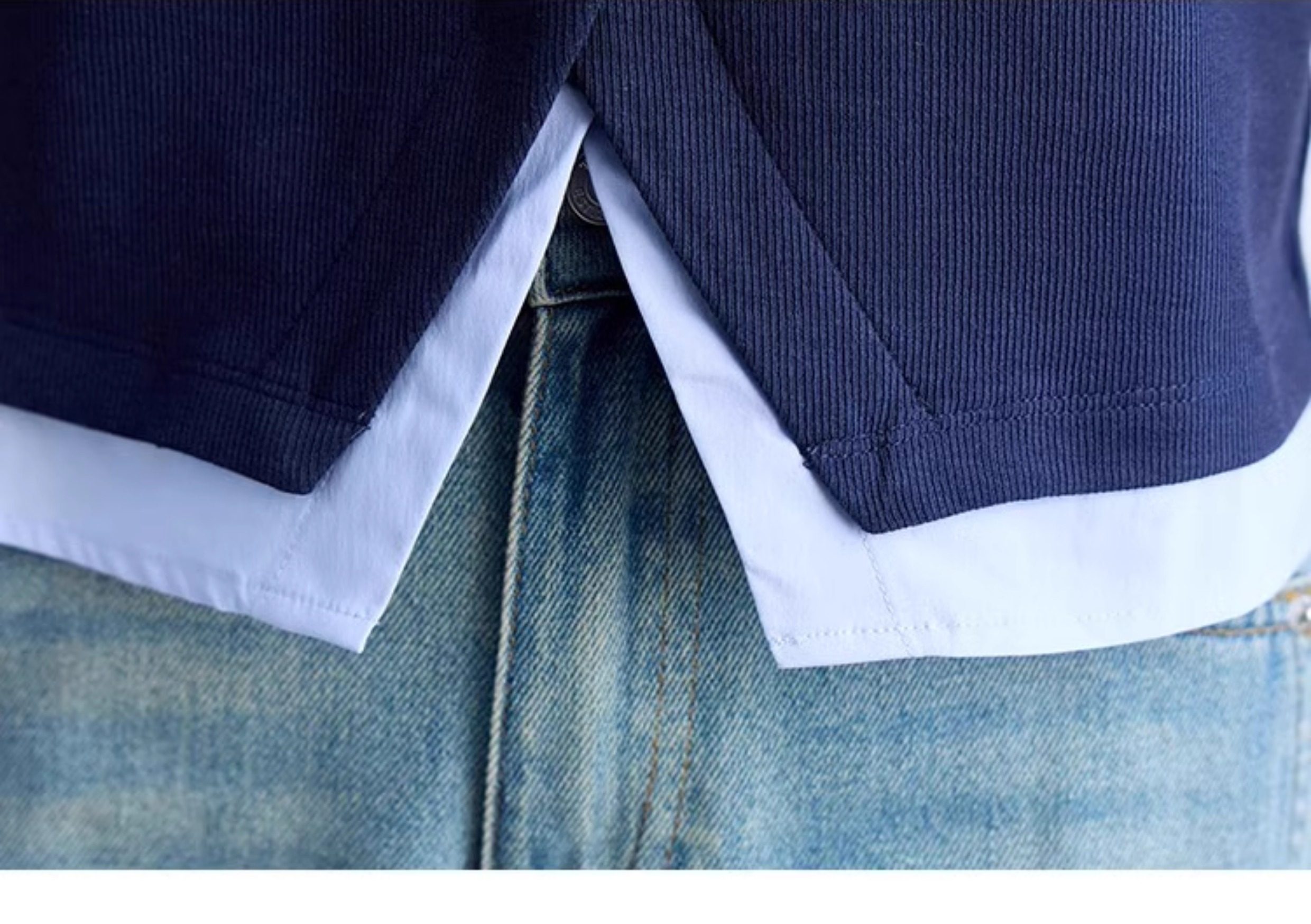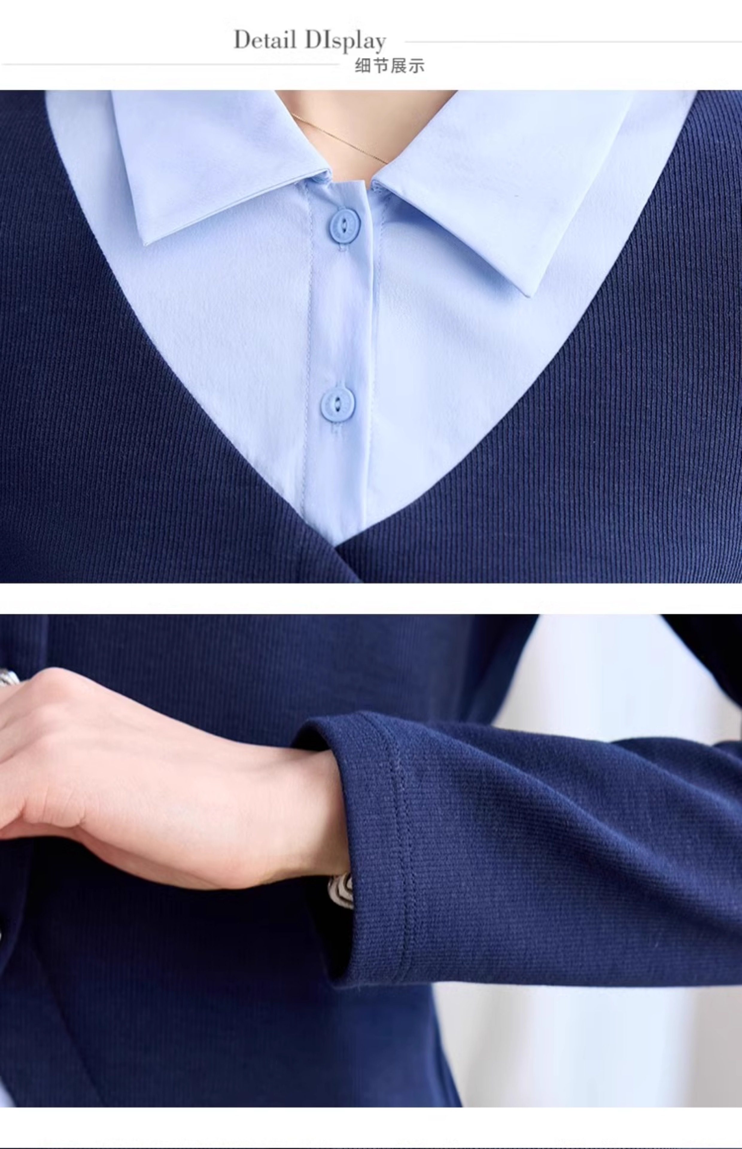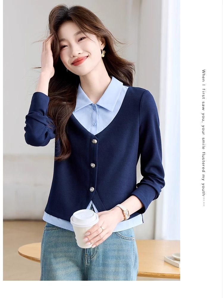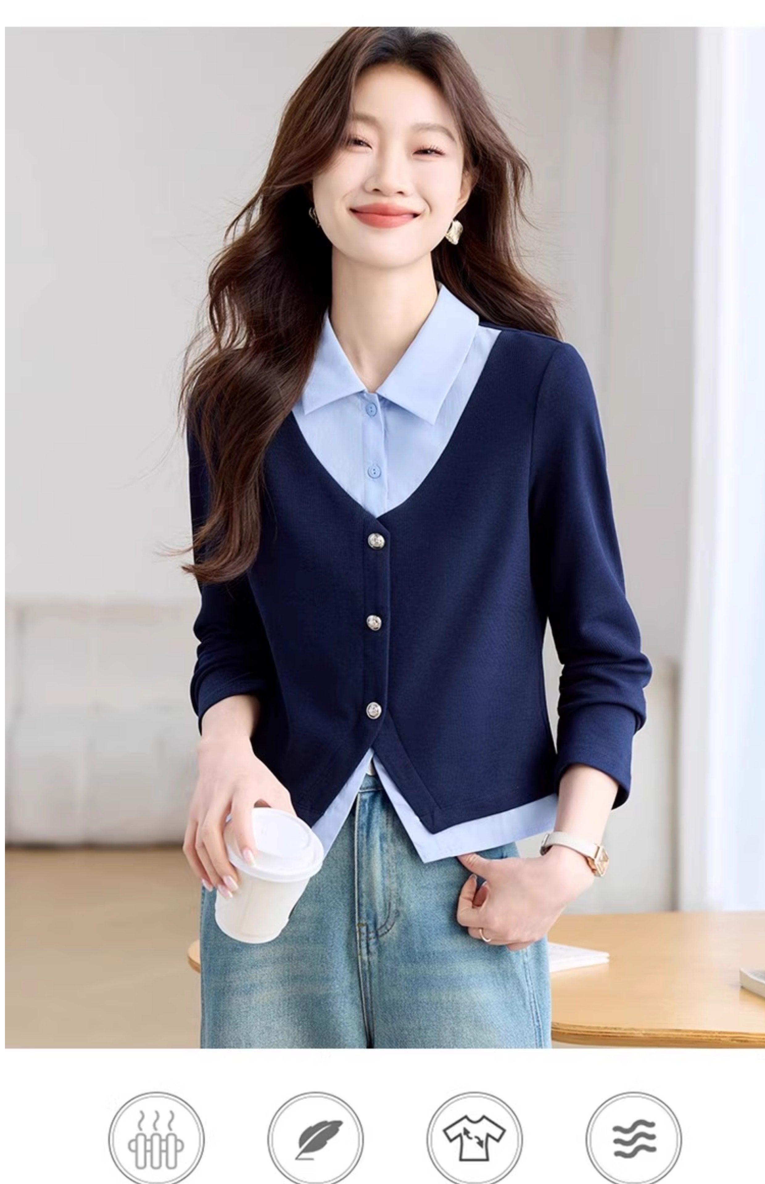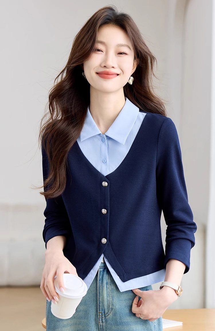 Gefälschte zweiteilige kontrastfarbene Langarmhemden im College-Stil für Damen. Frühlingsneues Design mit schmalen Polokragenhemden für Damen