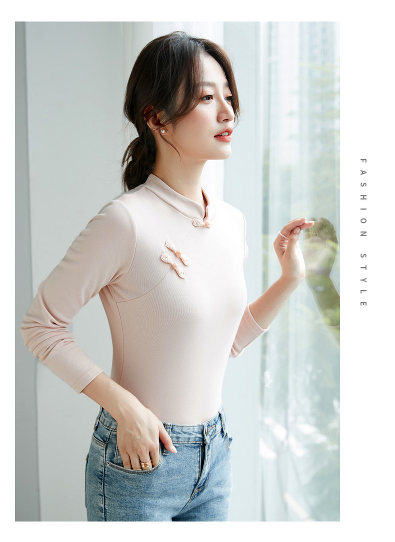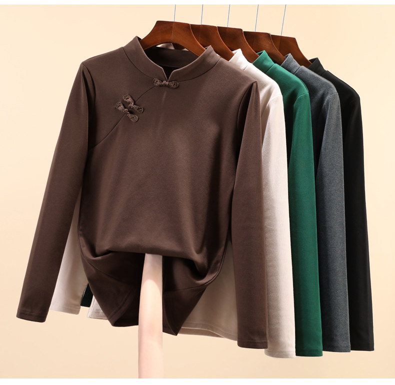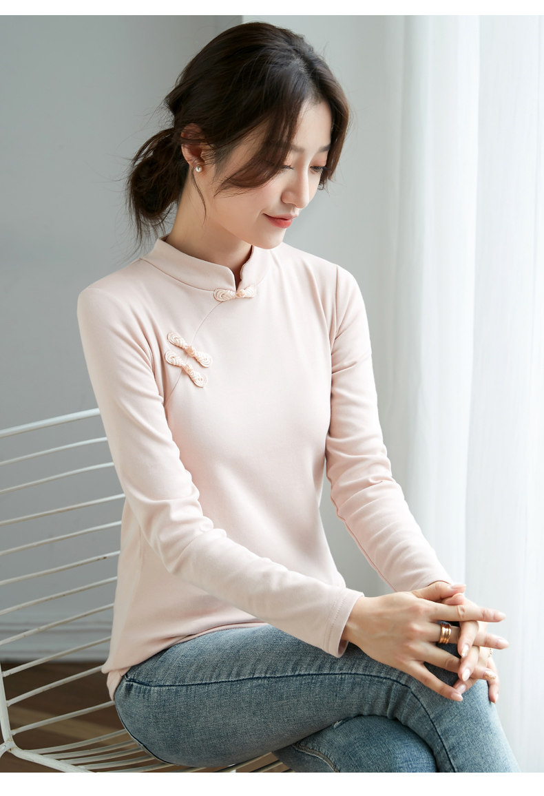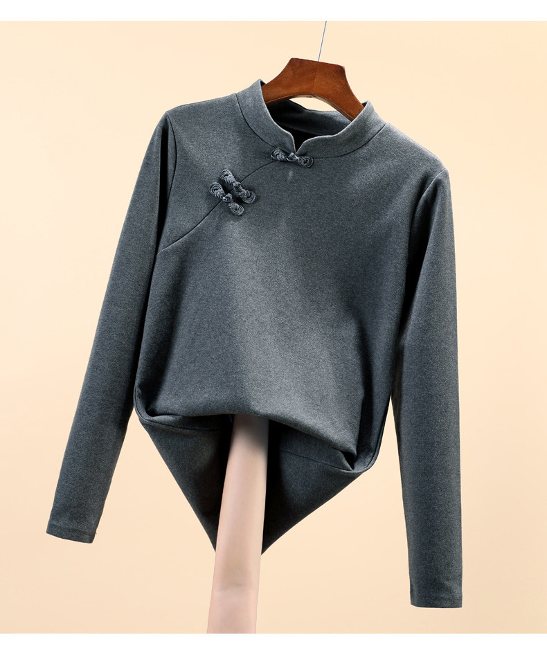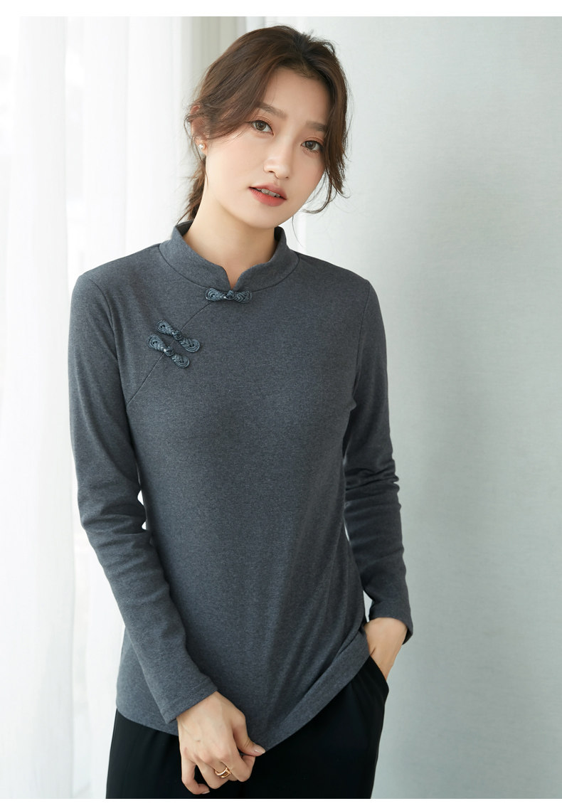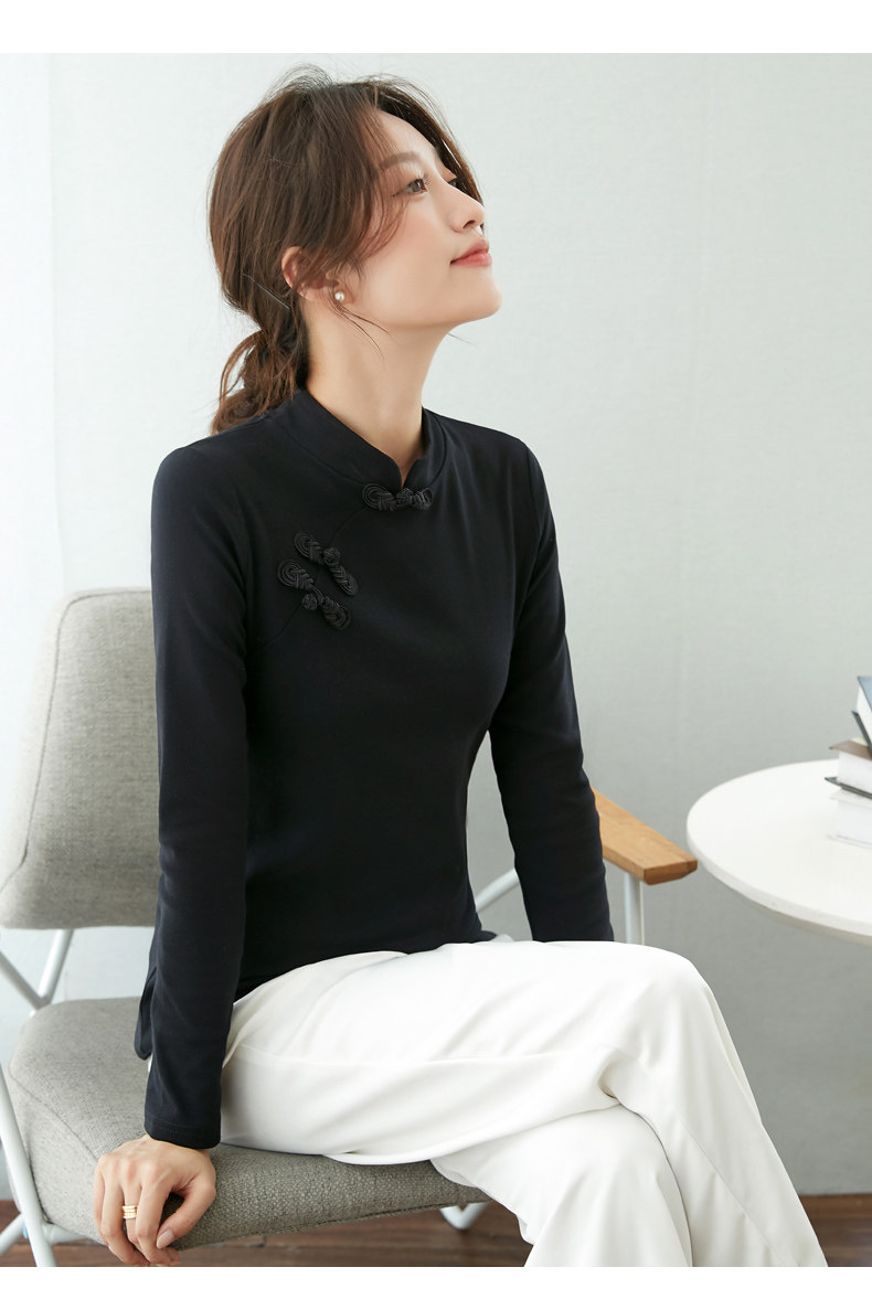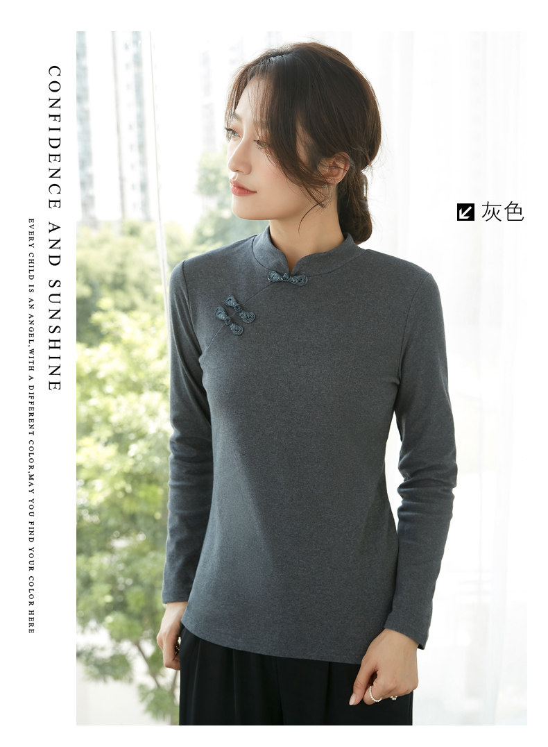 立领棉质打底衫女秋冬长袖t恤洋气新轻国风改良中式旗袍盘扣上衣